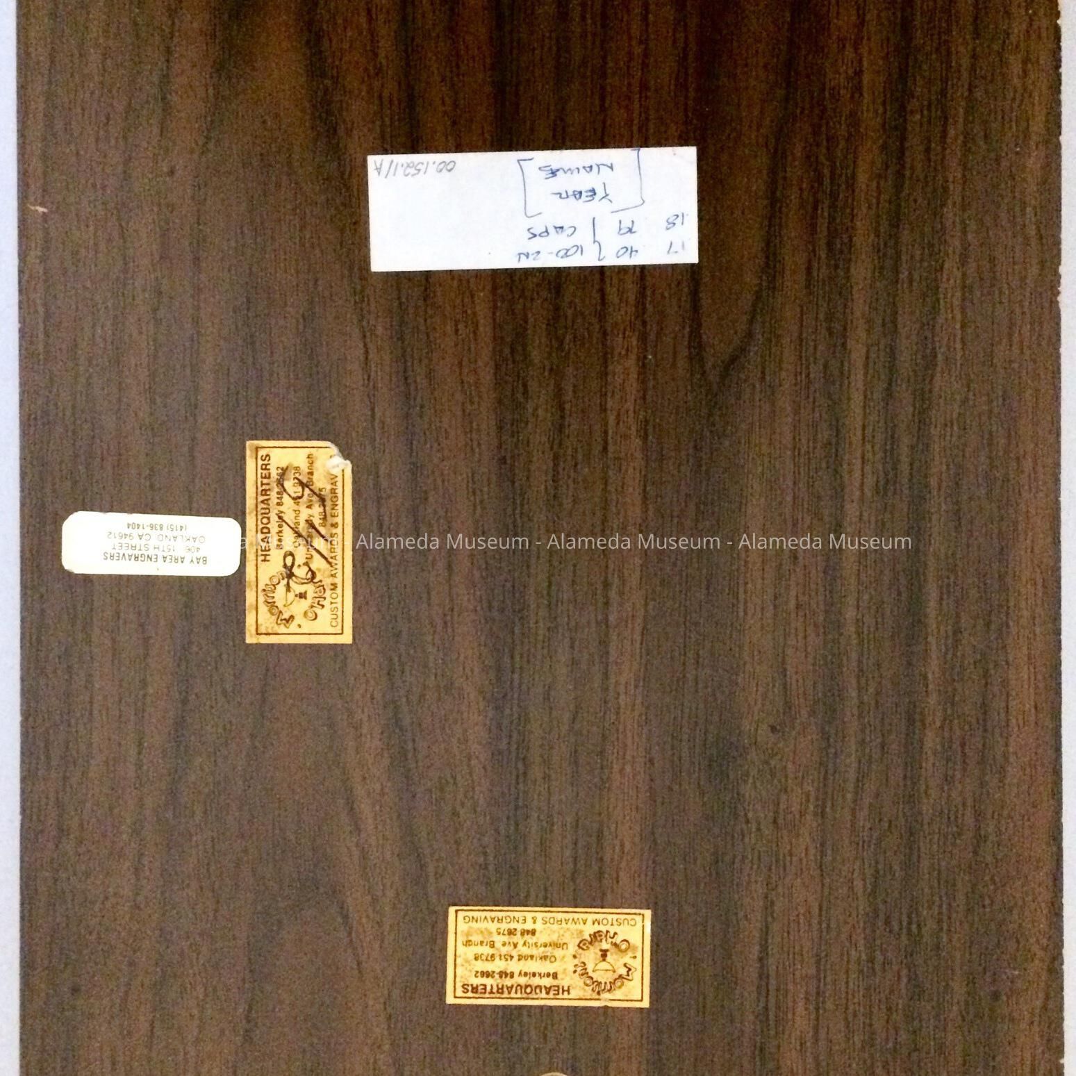 (a) Simulated wood-grained plaque with attached metal labels with incised printing revealing a brass finish below a black exterior. Size: L 12" x W9".