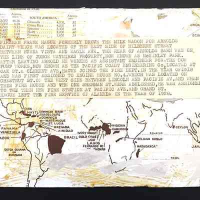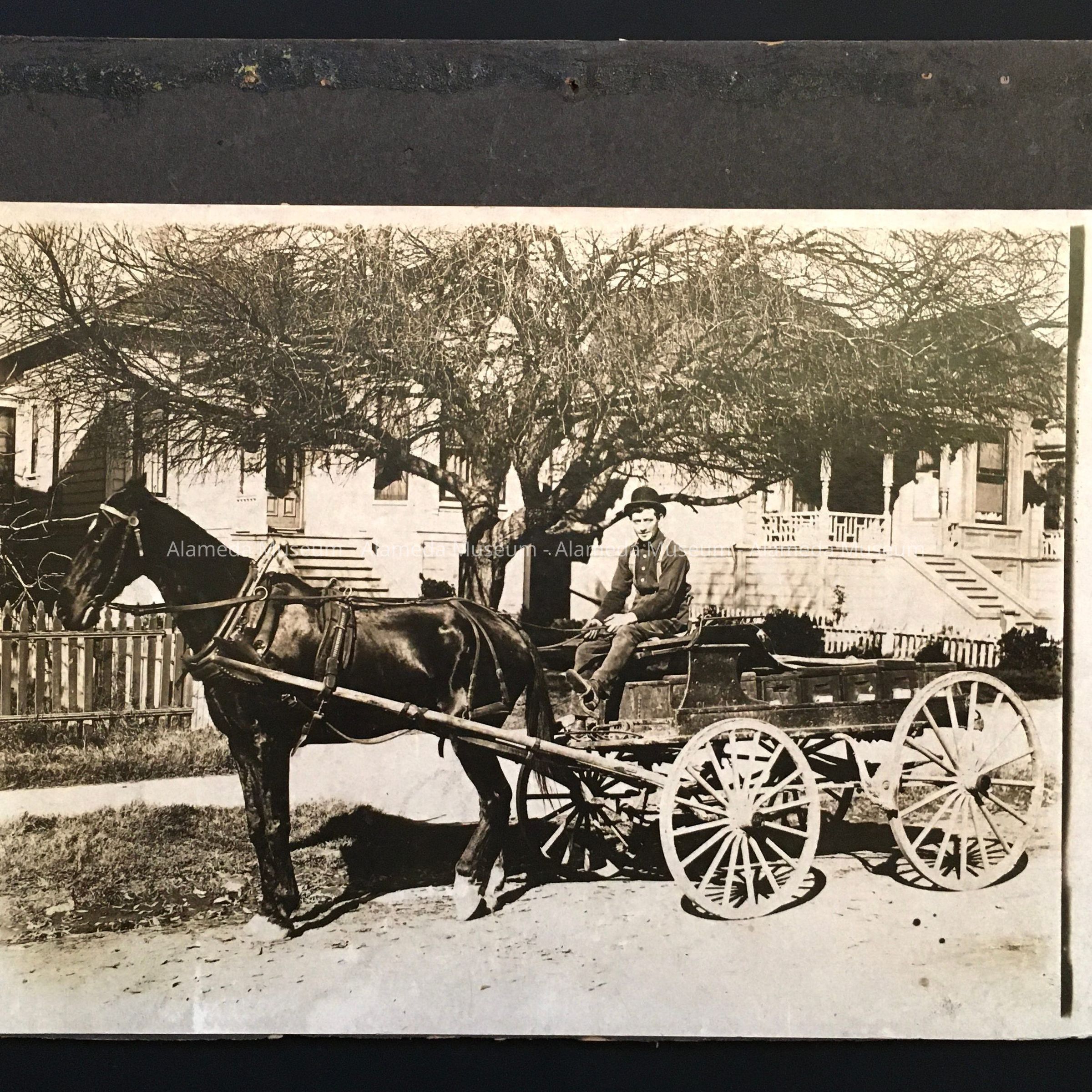 History of Object: Arnold's Dairy milk wagon with horse attached. Driver is identified as Frank Hague, later to be a member of the Alameda Fire Department for a decade.