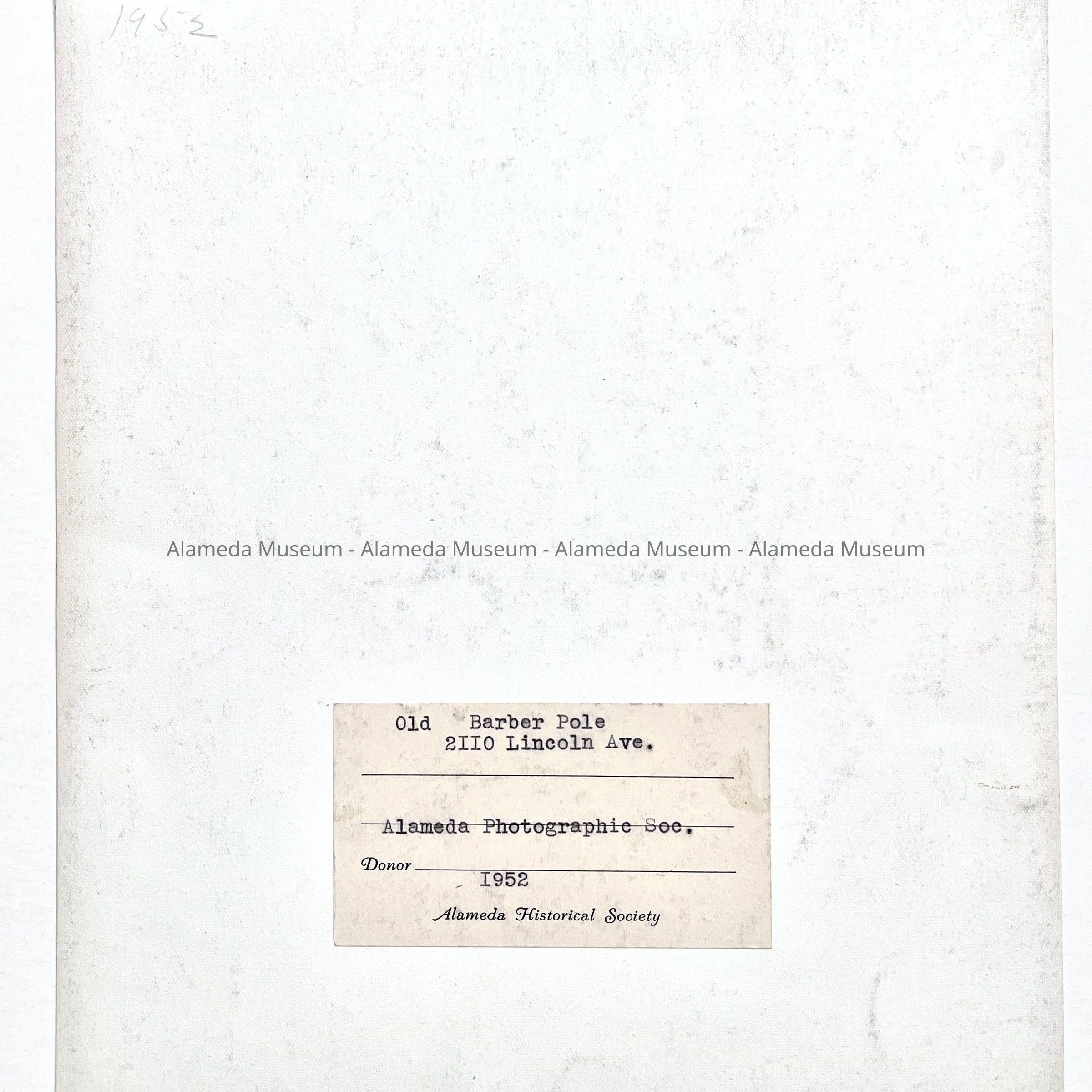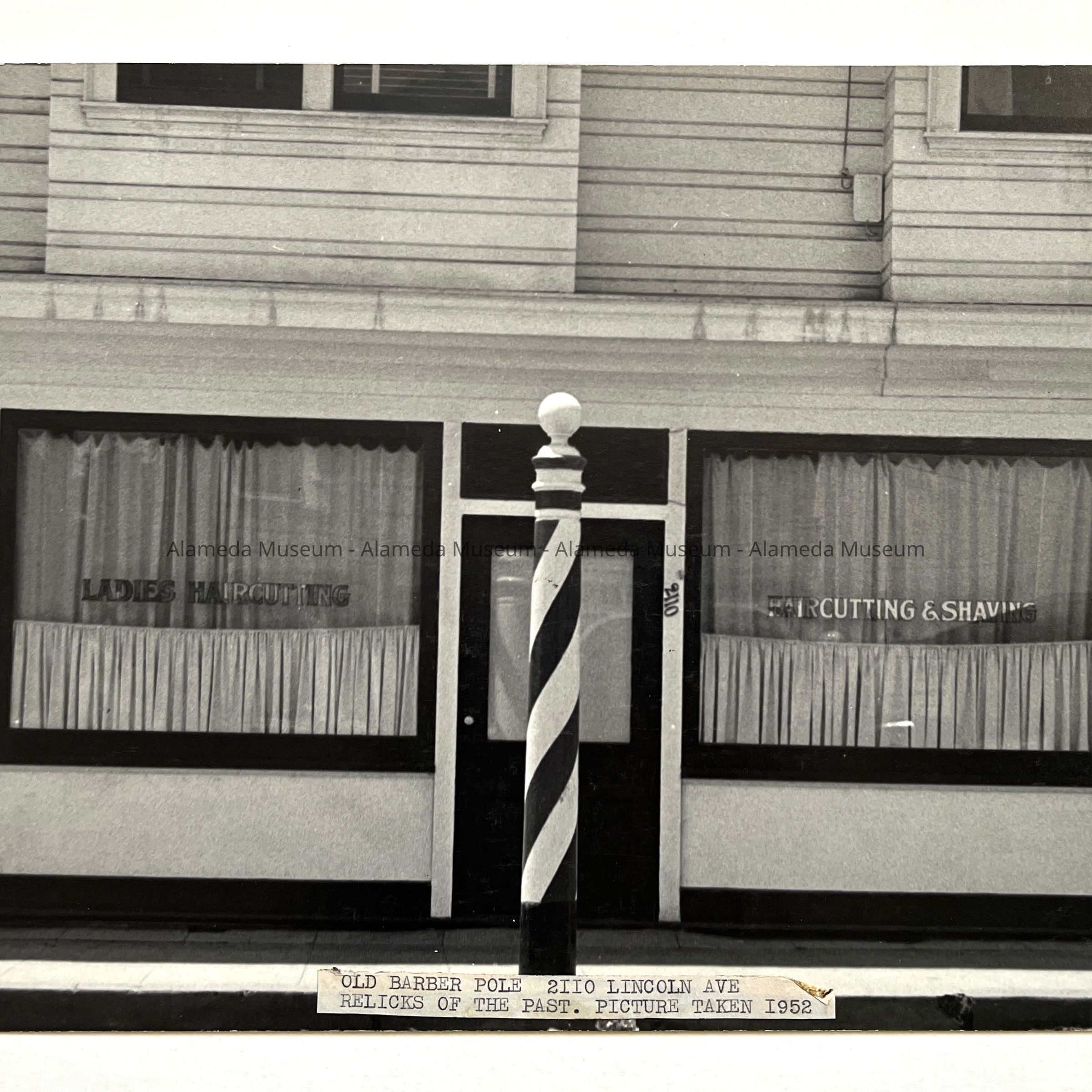 Photo barber pole at 2110 Encinal Ave, by Harriet Hollenquist, 1952Entry/Object ID