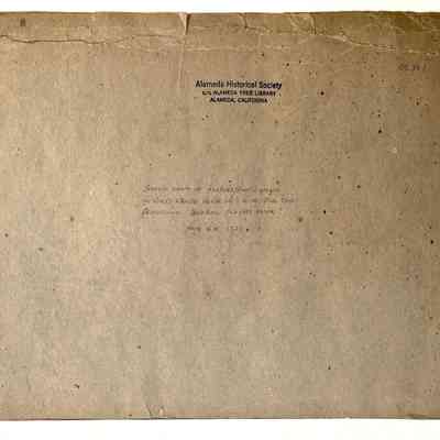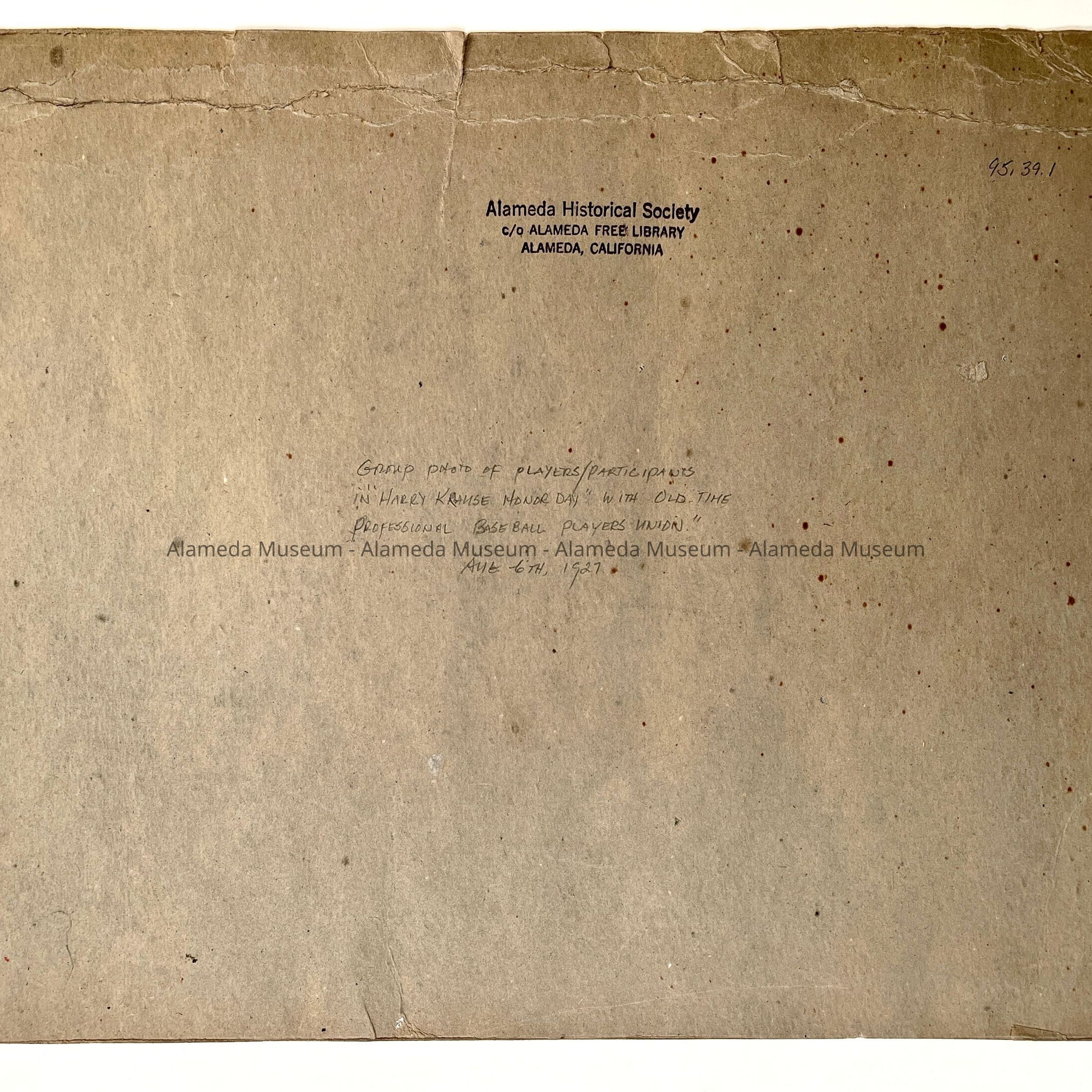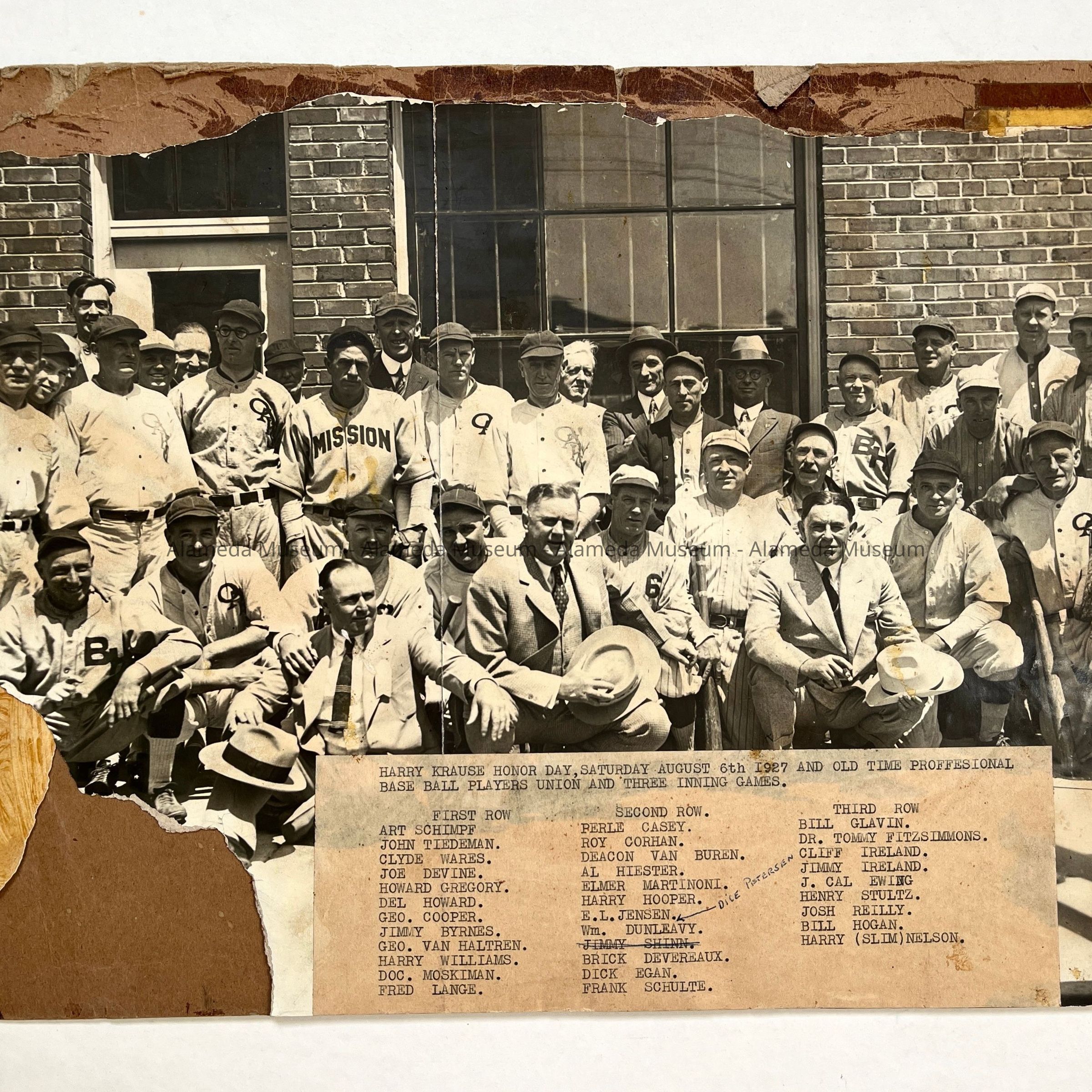 Description: A sepia-colored photo, mounted on dark brown cardboard. A label with typed information is glued over the bottom third of the photo. Photo is missing sections along the top and left corner, with some broken-off sections tucked between photo and backing. Heading: 'HARRY KRAUSE HONOR DAY, SATURDAY AUGUST 6TH I927 AND OLD TIME PROFESSIONAL BASE BALL PLAYERS UNION AND THREE INNING GAEMS.'. A Historical Society, c/o Alameda Free Library, stamp has been added to the verso, as well as a handwritten caption in pencil.