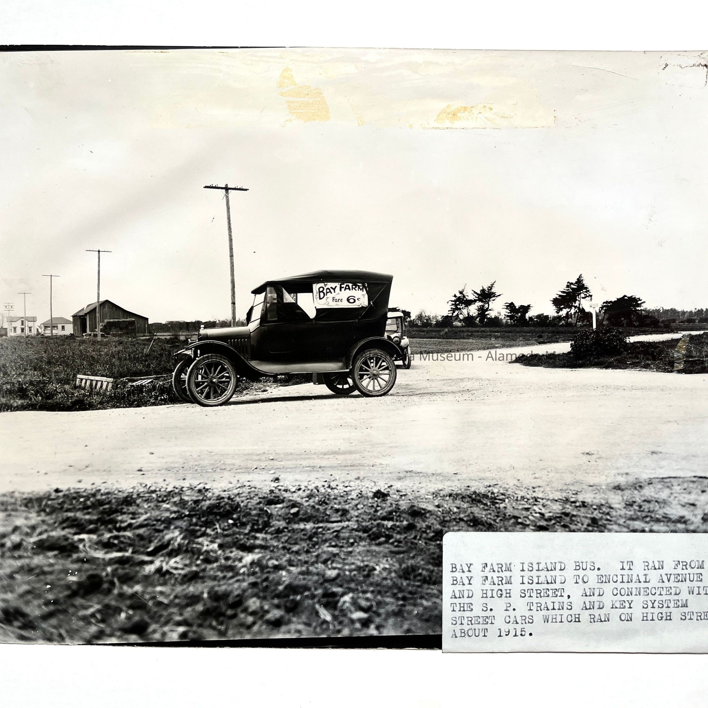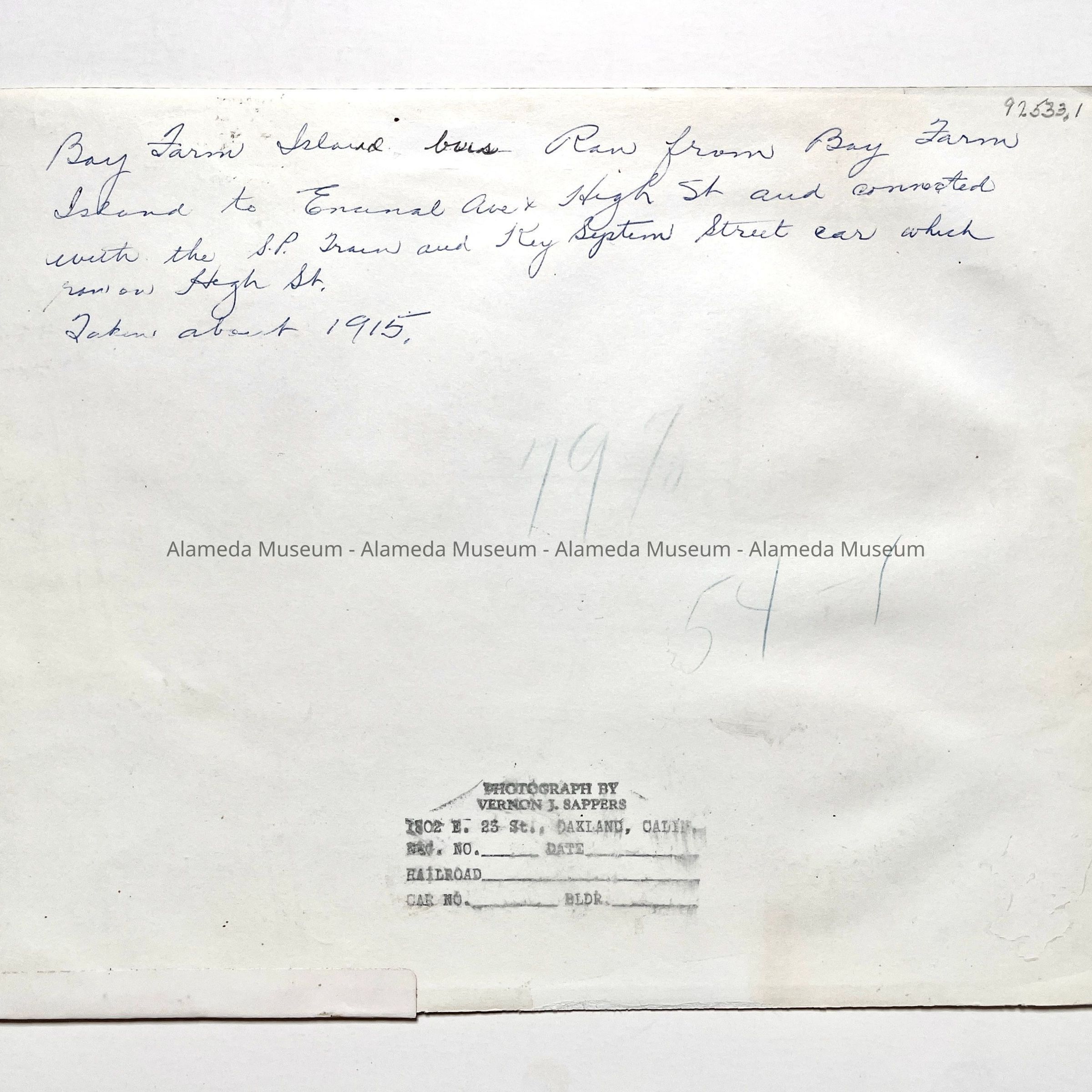 History of Object: Bay Farm Island bus. It ran from B.F.I. to Encinal Avenue and High Street where it connected with the Southern Pacific system and the Key System.