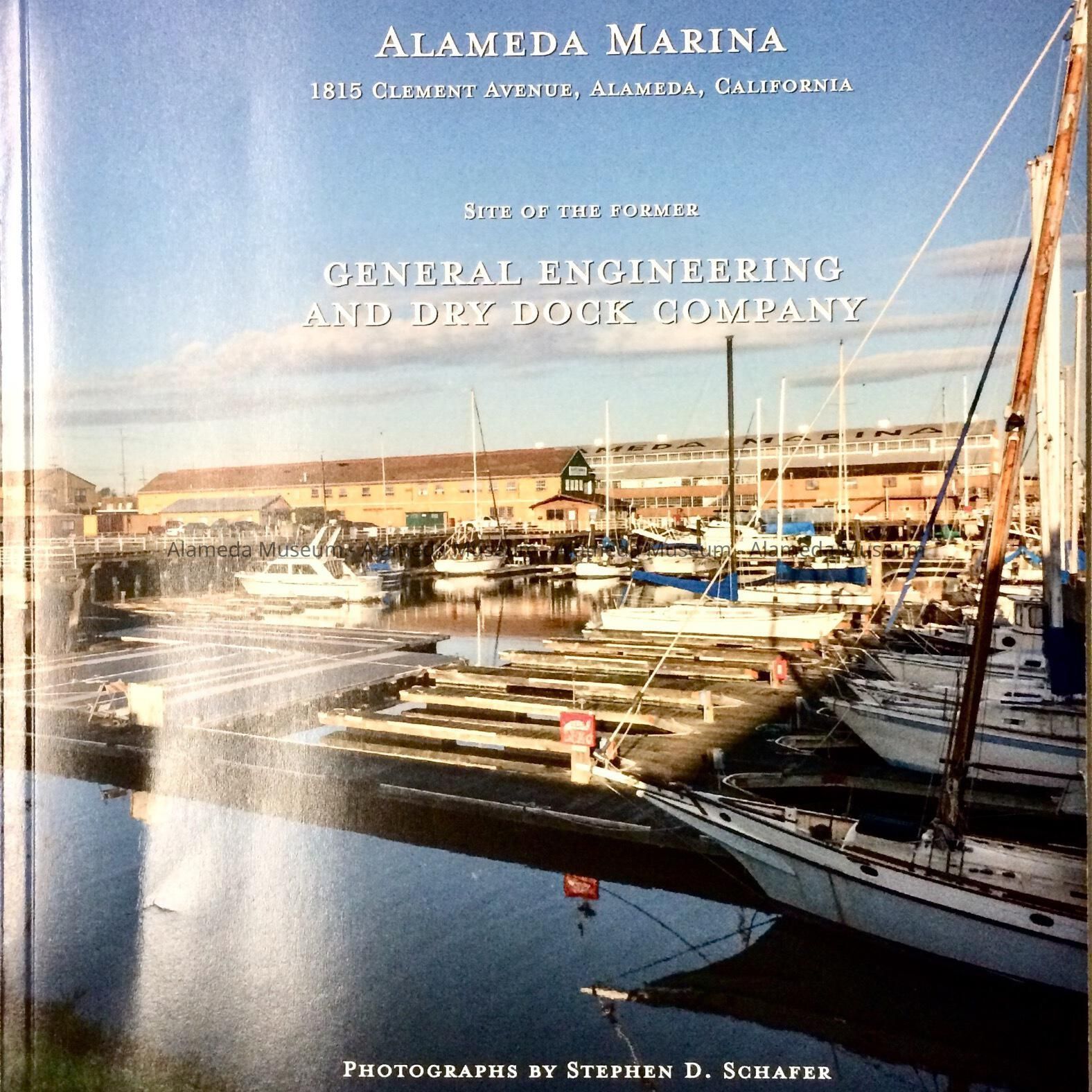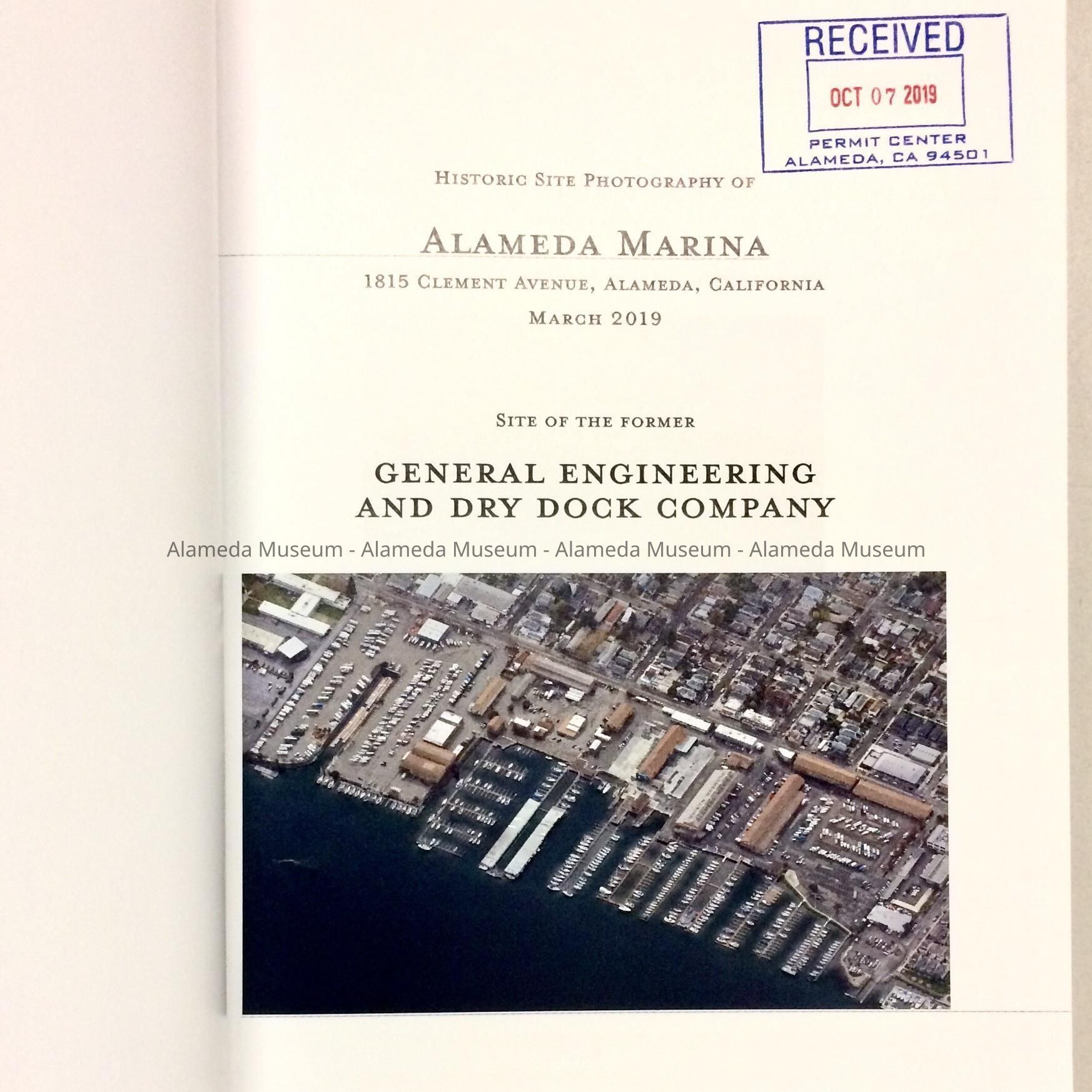 Description: book, soft-bound with glossy paper cover, with image of a marina with buildings behind, titled 'Historic Site Photography of Alameda Marina, 1815 Clement Avenue, Alamed, California, Site of the former General Engineering and Dry Dock Company. Photographs by Stephen D. Schafer, March 2019'. Fly leaf has been stamped with 'Received, Oct 7, 2019, Permit Center, Alameda, CA 94501'.