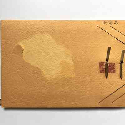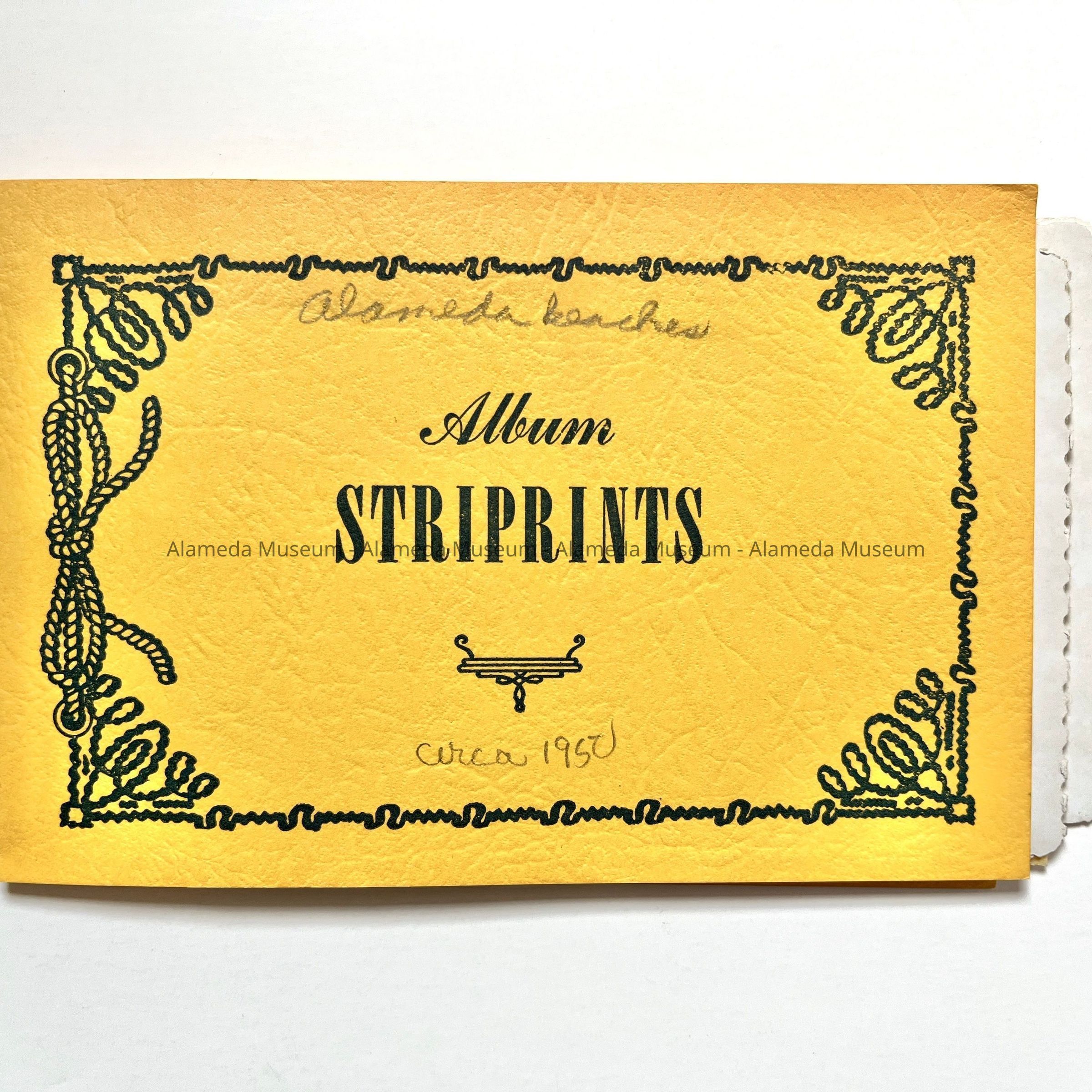 Description: Soft cover photo booklet with heading "Album-Striprints" (yellow cover with blue type). Series of black & white photos (glossy) attached by tape.
