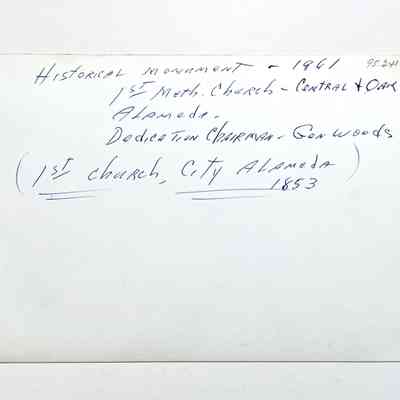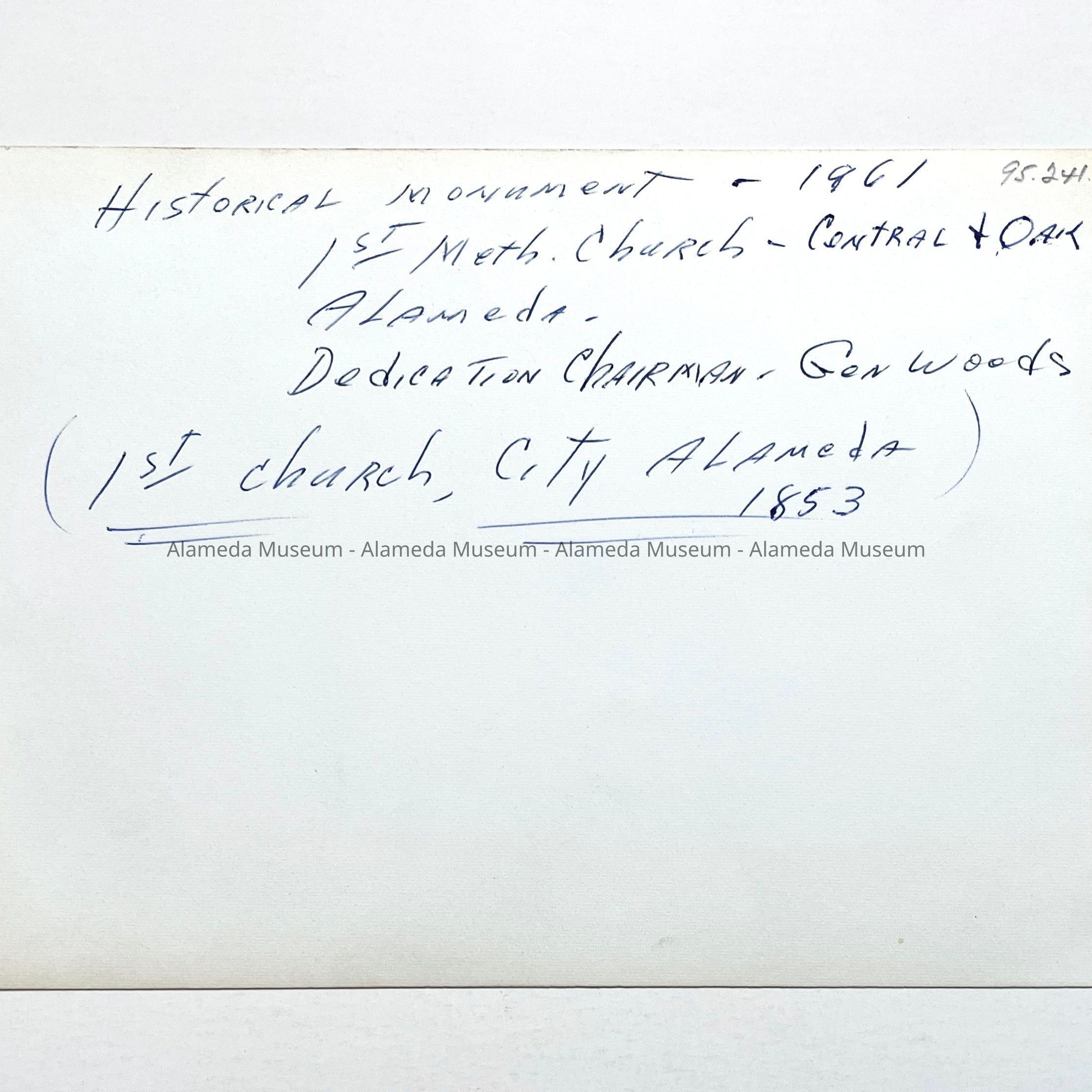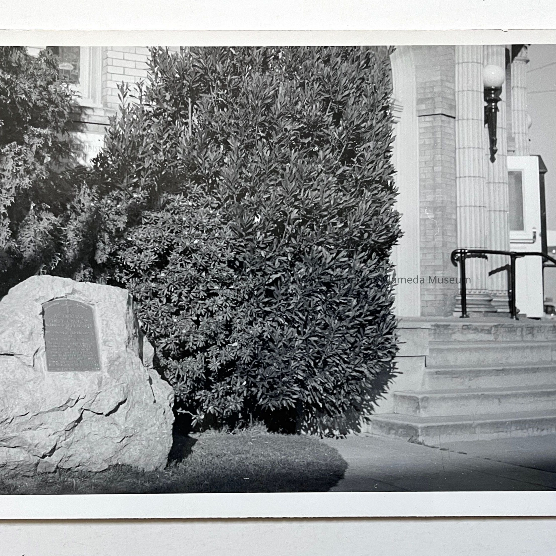 History of Object: Photo of a historical monument located at left of the entrance of the (now) Twin Towers Methodist Church, on the Central Avenue side. Bronze plaque imbedded in stone monument commemorates the first Methodist church in Alameda, established in 1853, at Jackson and Mound Streets.