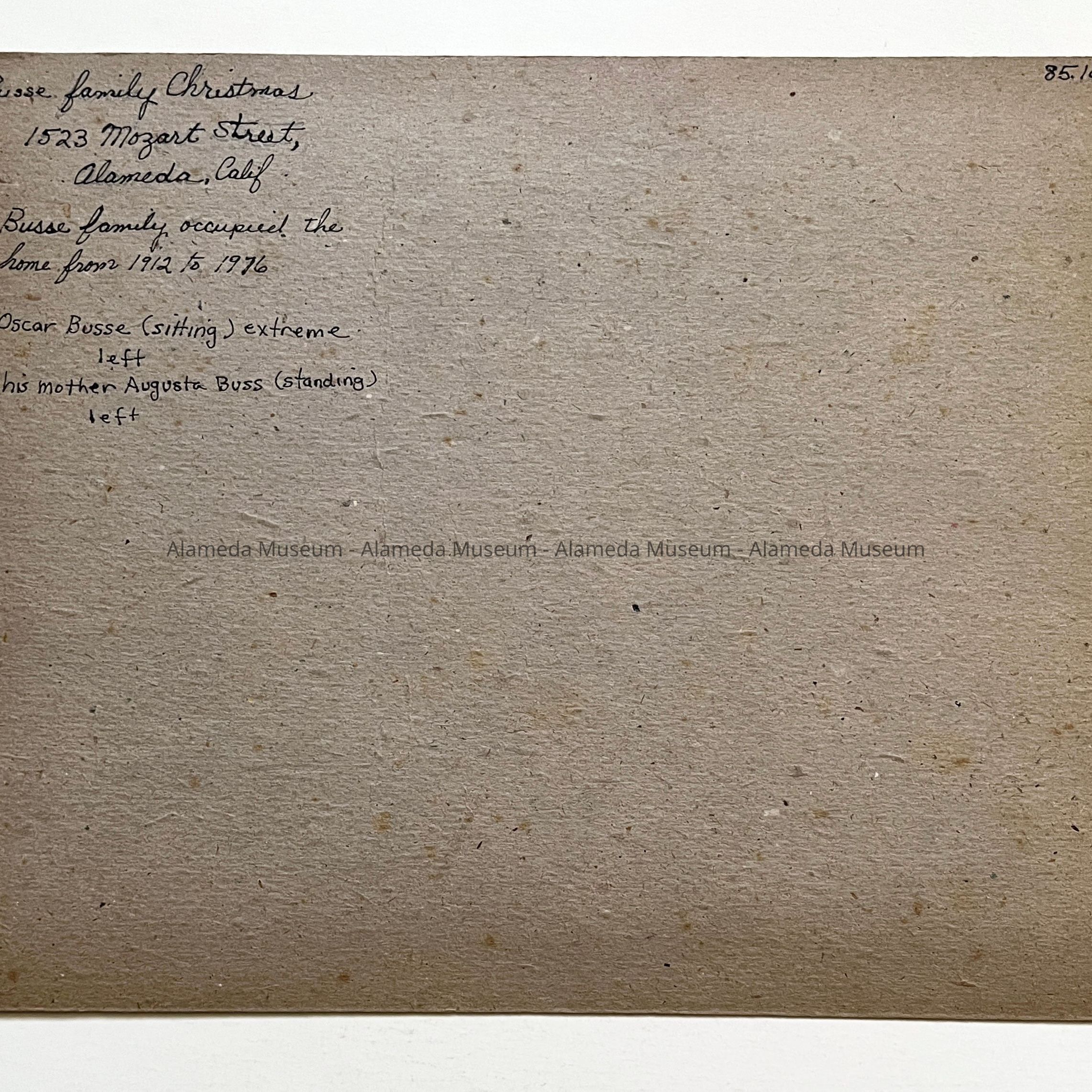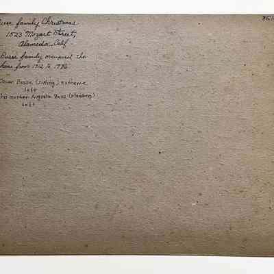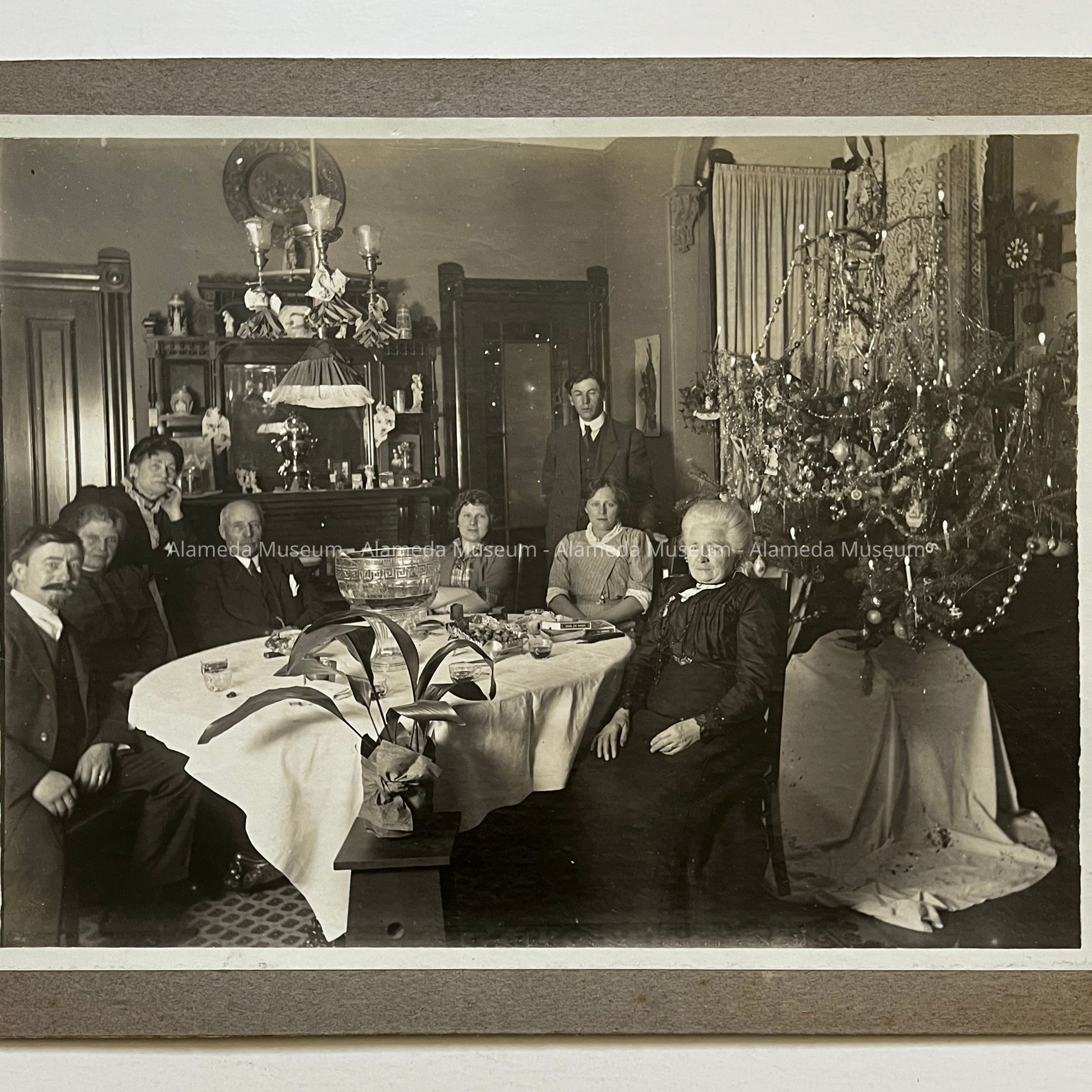 History of Object: Photo of the Busse family Christmas dinner with lighted Christmas tree, taken in the dining room of their home at 1523 Mozart Street, Alameda.