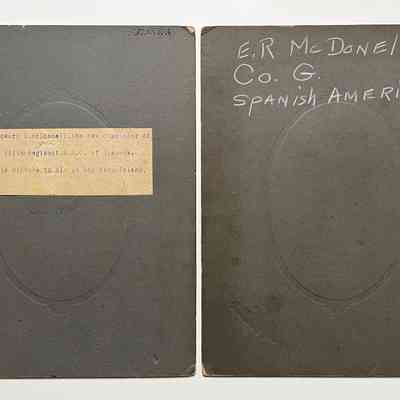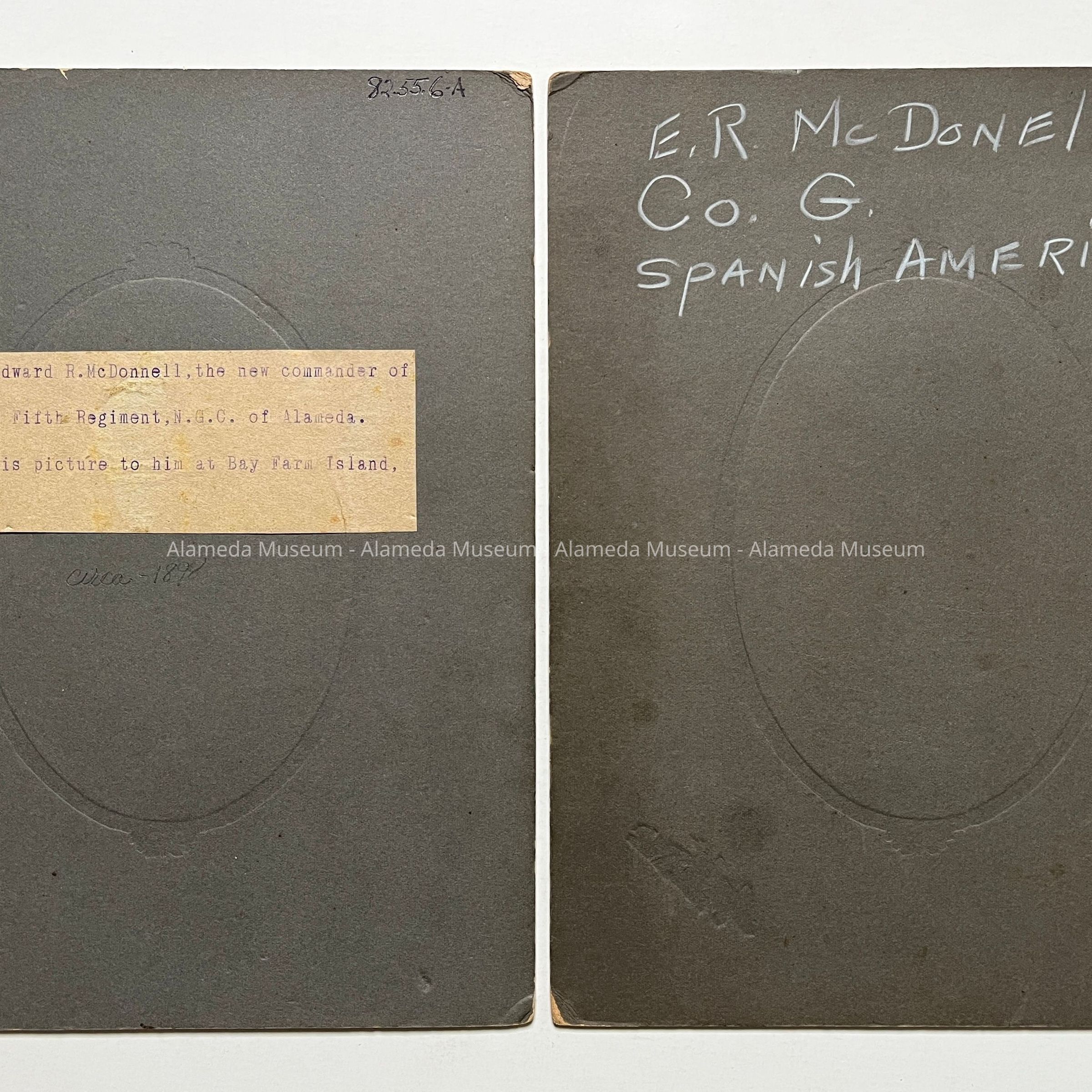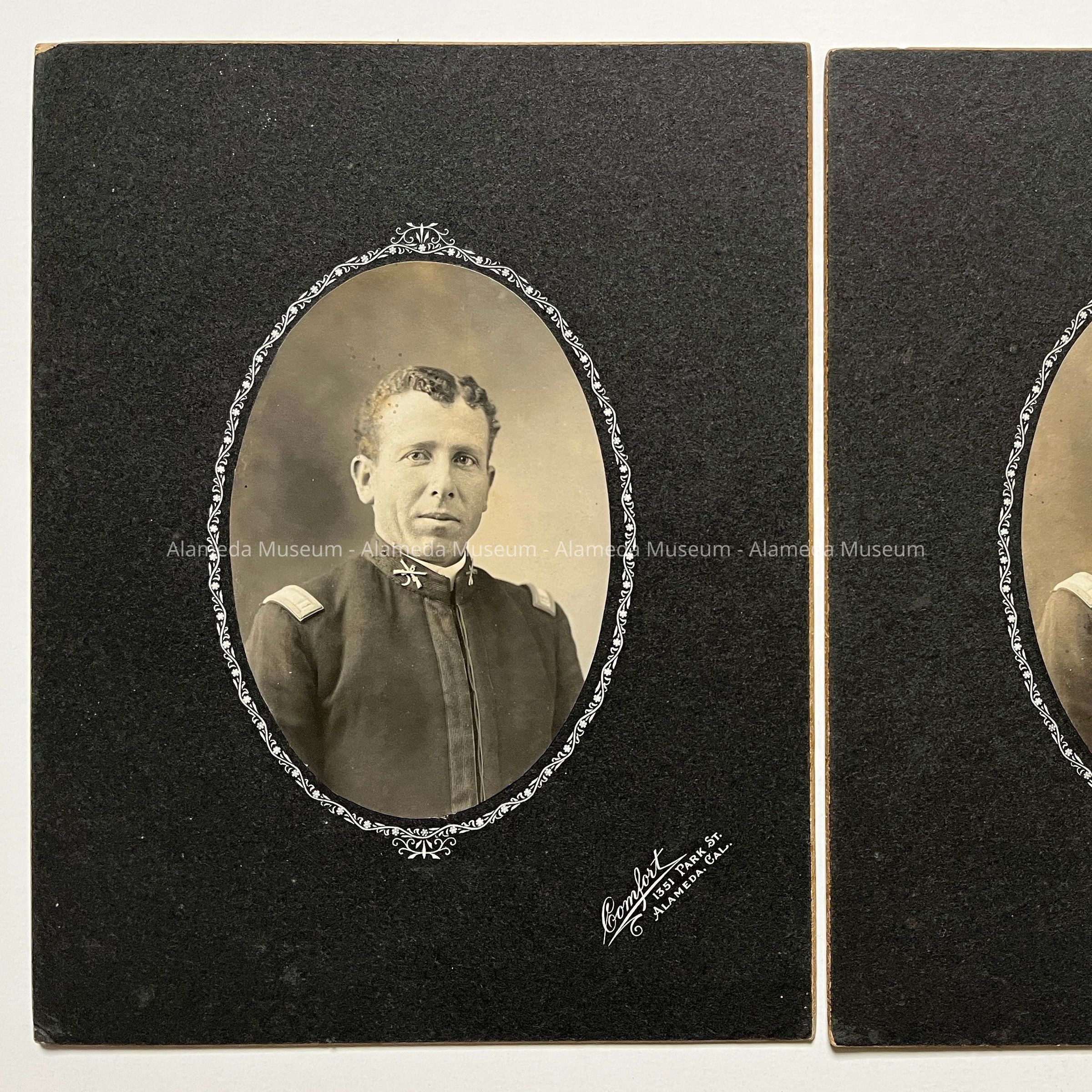 Description: Pale sepia photo (oval) on heavy mounting, with decorative design around photo. Lower right hand corner in ornate type "Comfort, 1351 Park St., Alameda, Cal". Dark grey mounting. On the reverse side of photo A, is a typed label stating "Captain Edward R. McDonell, the new commander of Company G Fifth Regiment, I.G.C. of Alameda. Return this picture to him at Bay Farm Island, Alameda".