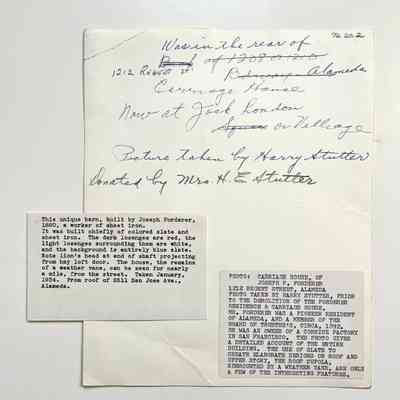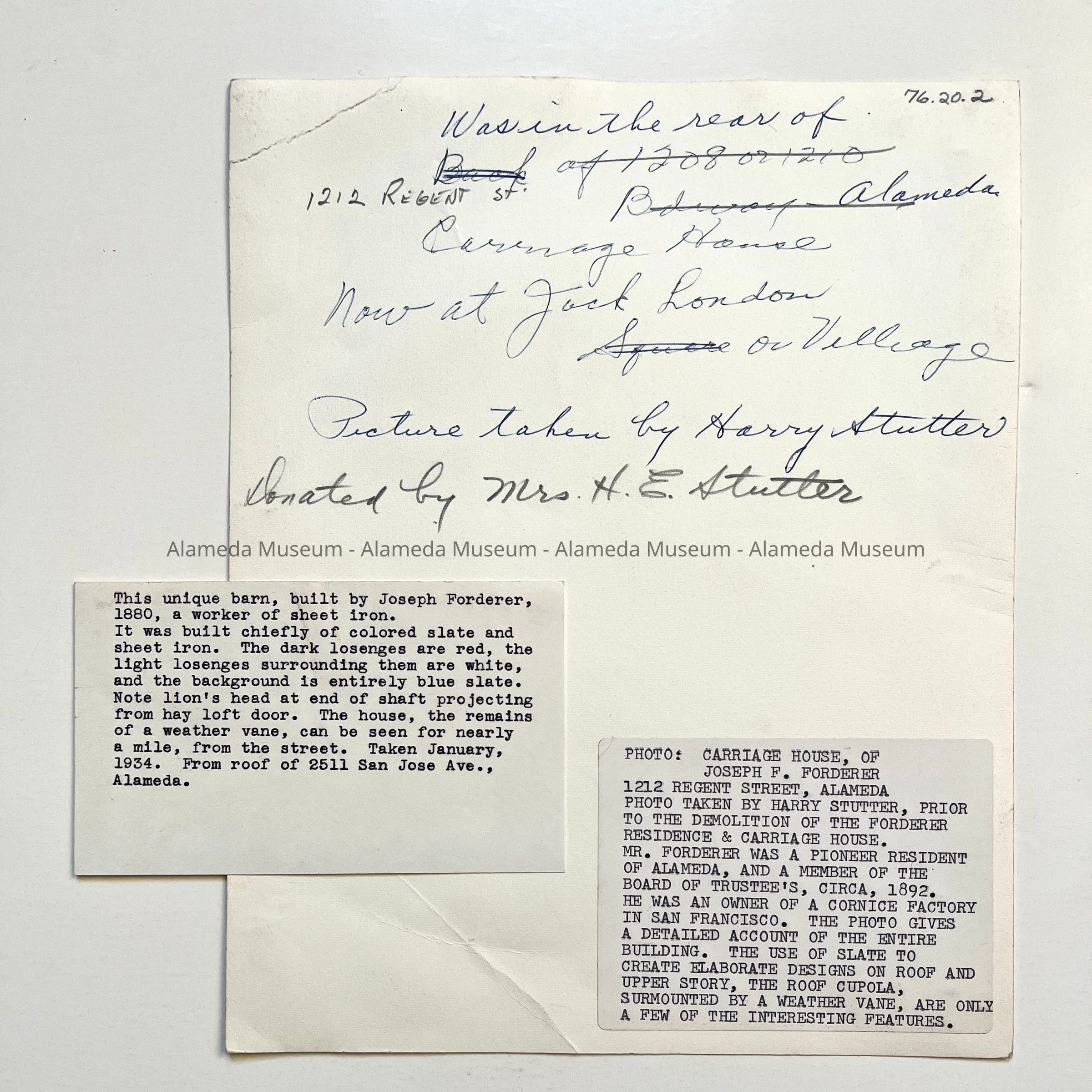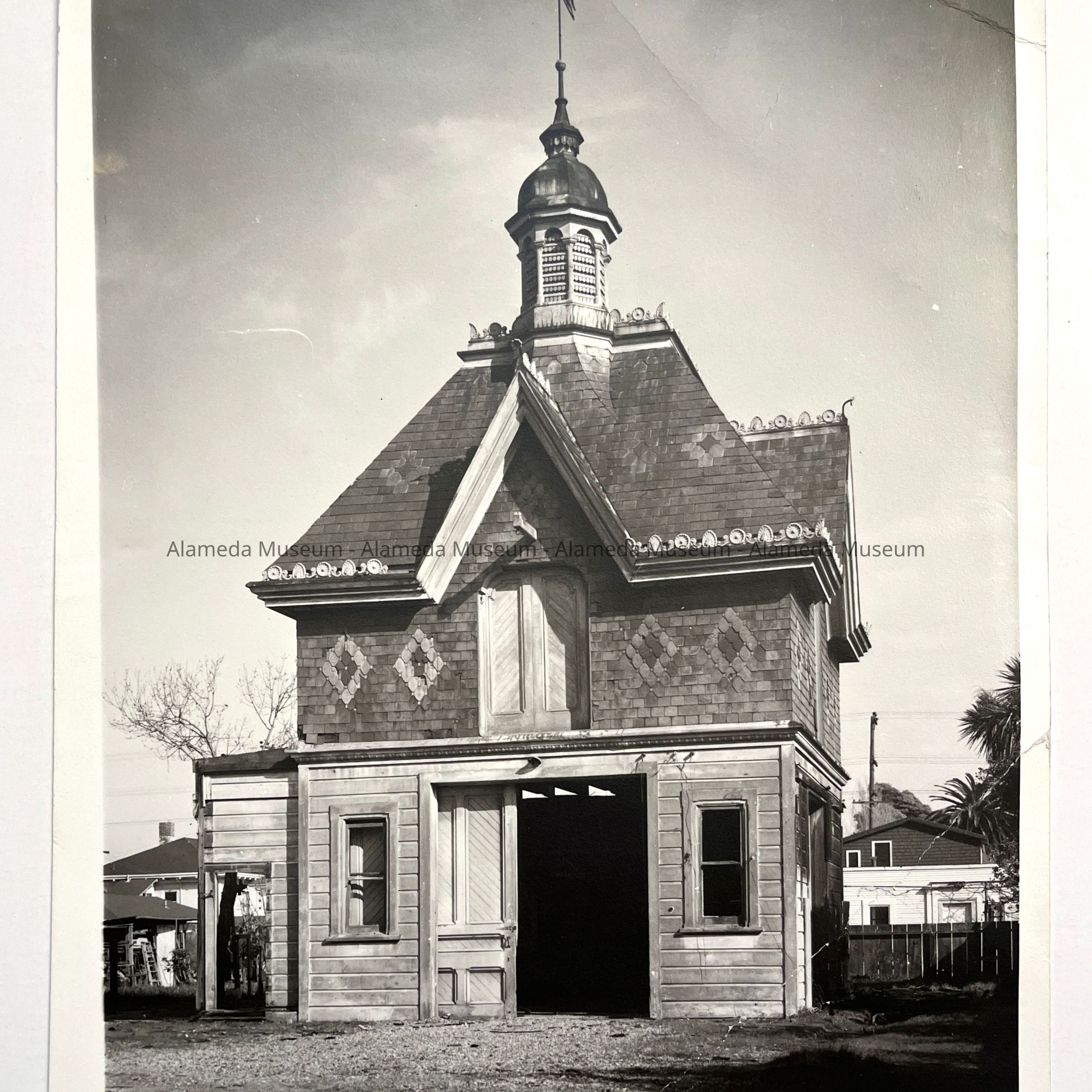 HISTORY OF OBJECT: PHOTO, CARRIAGE HOUSE OF JOSEPH F. FORDERER, 1212 REGENT STREET, ALAMEDA. PHOTO TAKEN BY HARRY STUTTER, PRIOR TO THE DEMOLITION OF THE FORDERER RESIDENCE & CARRIAGE HOUSE. MR, FORDERER WAS A PIONEER RESIDENT OF ALAMEDA. AND A MEMBER OF THE BOARD OF TRUSTEES, CIRCA, 1892. HE WAS AN OWNER OF A CORNICE FACTORY IN SAN FRANCISCO. THE PHOTO GIVES A DETAILED ACCOUNT OF THE ENTIRE FRONT FACADE OF THE BUILDING. THE USE OF SLATE TO CREATE ELABORATE DESIGNS ON ROOF AND UPPER STORY, THE ROOF CUPOLA, SURMOUNTED BY A WEATHER VANE, ARE ONLY A FEW OF THE INTERESTING FEATURES
