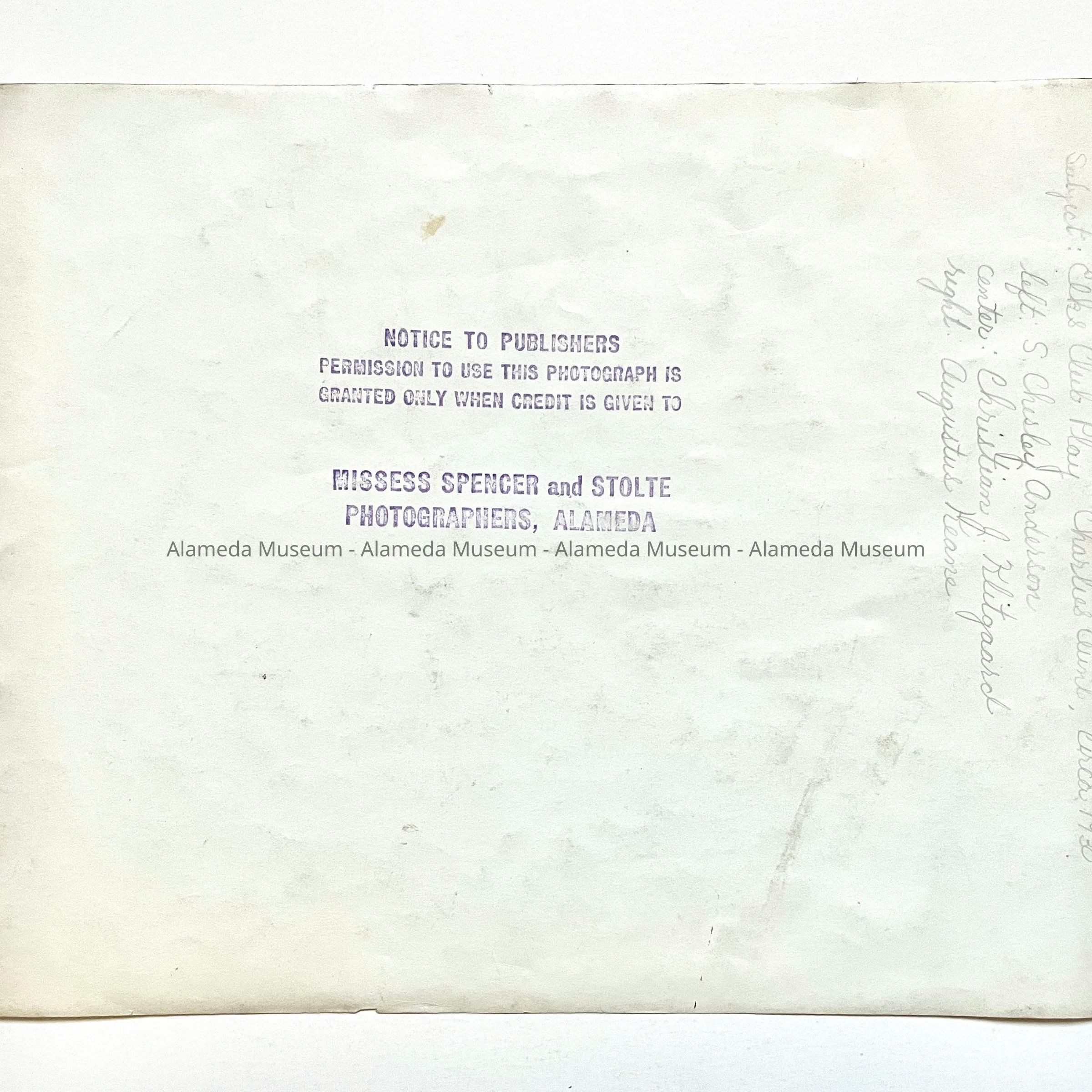 Description: Sepia tinted photo (glossy), on the reverse side rubber stamped "Misses Spencer and Stolte, Photographers, Alameda."