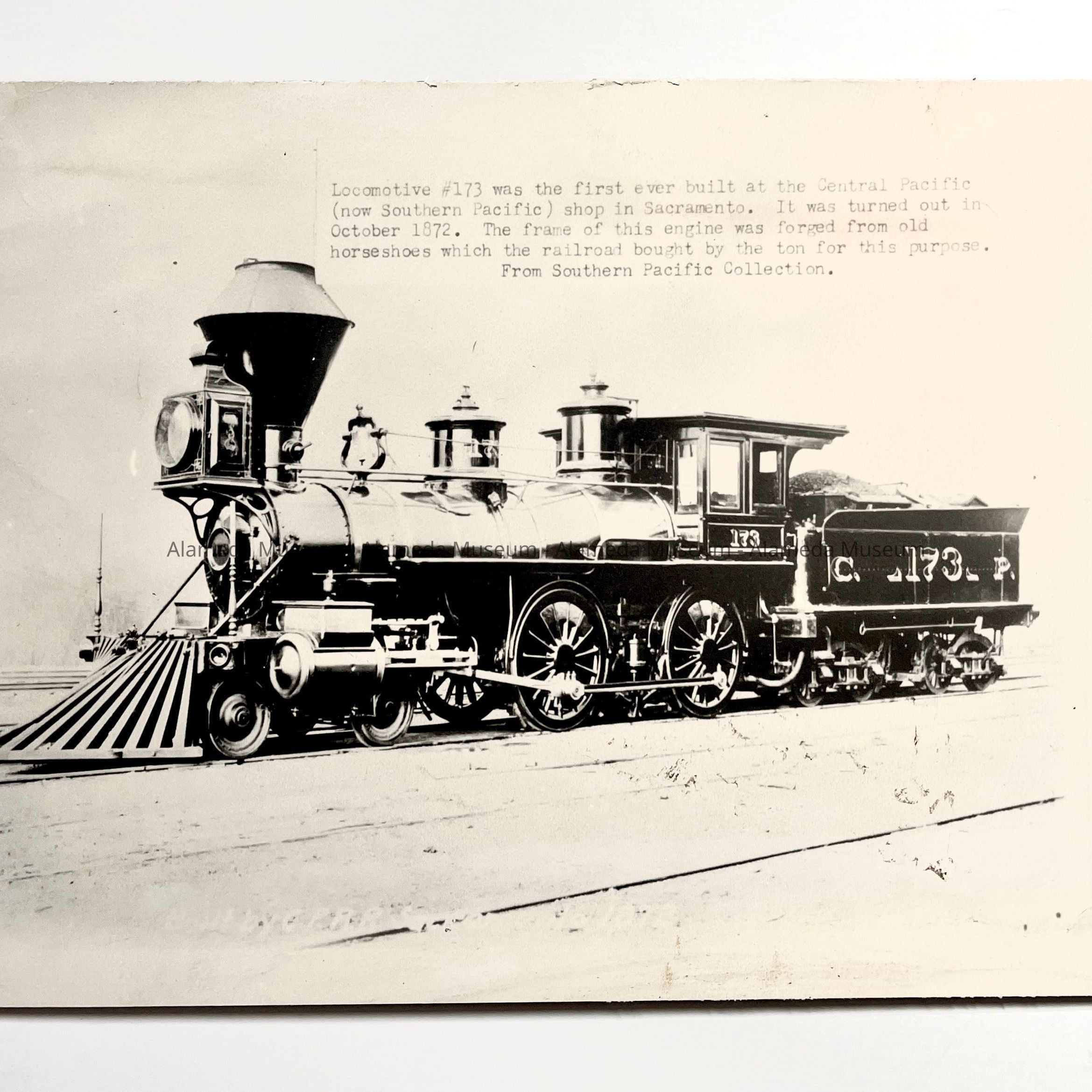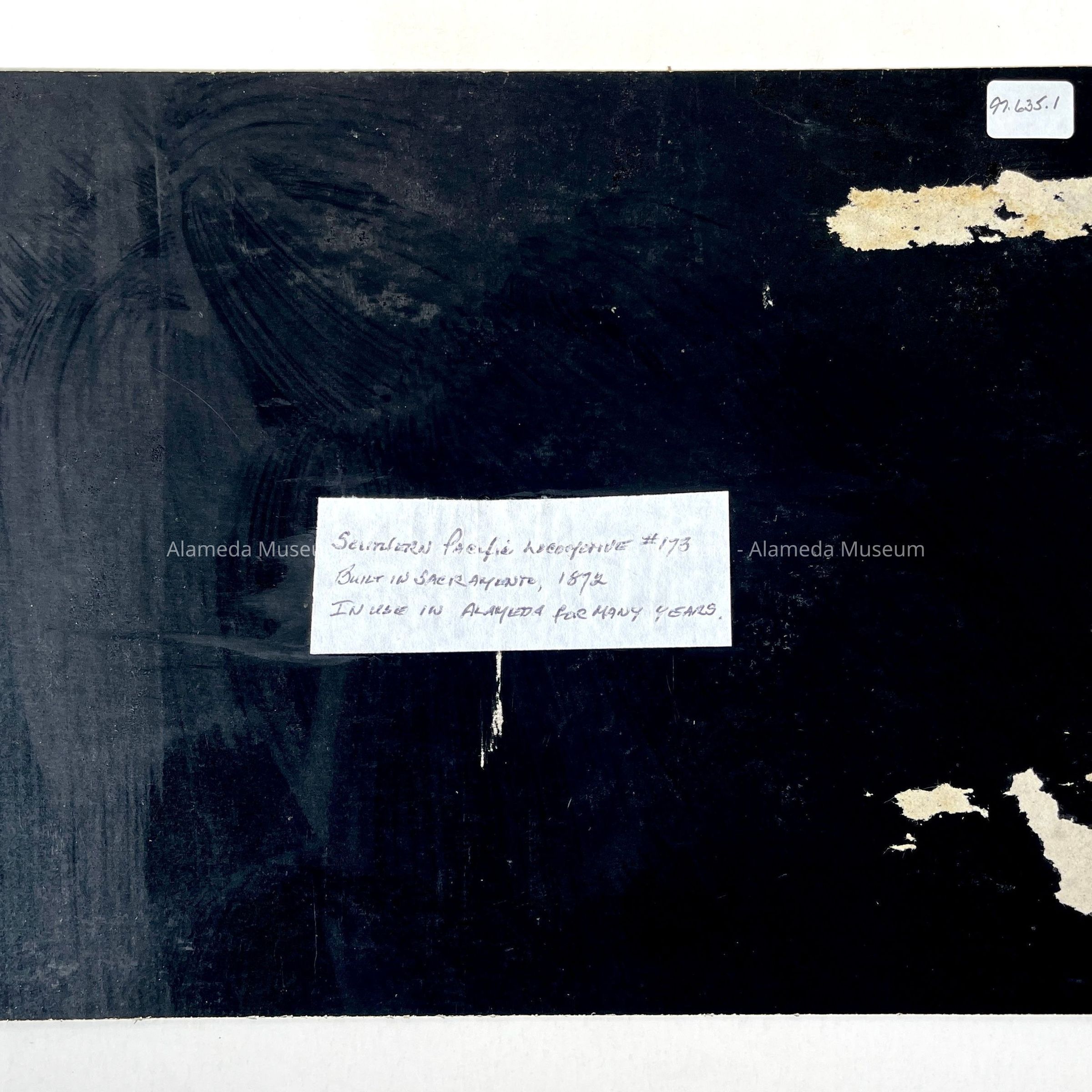 History of Object: View of locomotive #173 - the first ever built at the Central Pacific (now Southern Pacific) shop in Sacramento, October, 1872. It was in use in Alameda for many years. The original image is from the Southern Pacific Collection.