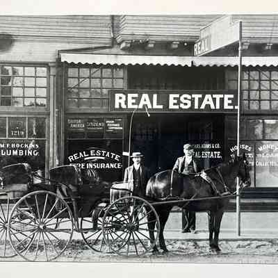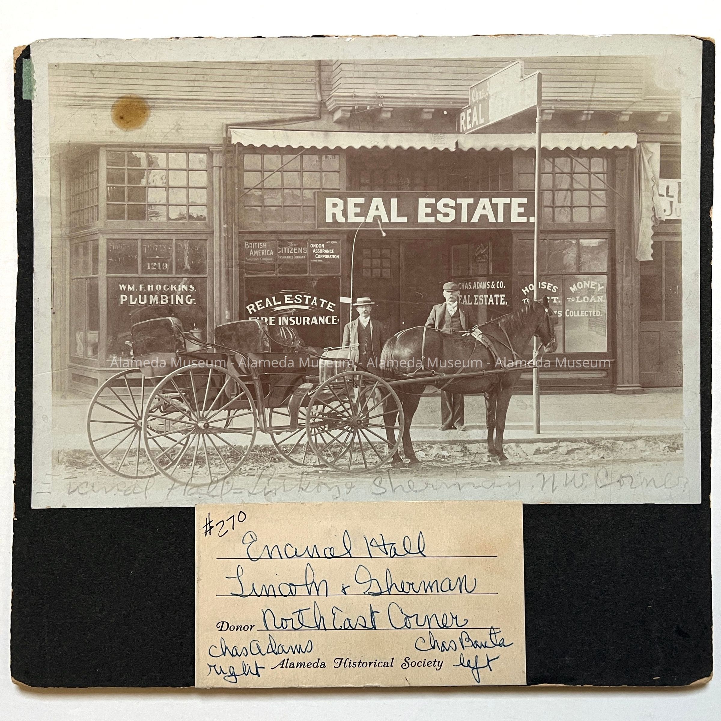 History of Object: Street view of Chas. Adams Real Estate & Insurance office located at the N.E. corner of Lincoln and Sherman. Horse-drawn surrey is parked in front. Chas. Adams is shown at right, Chas. Banta at left.