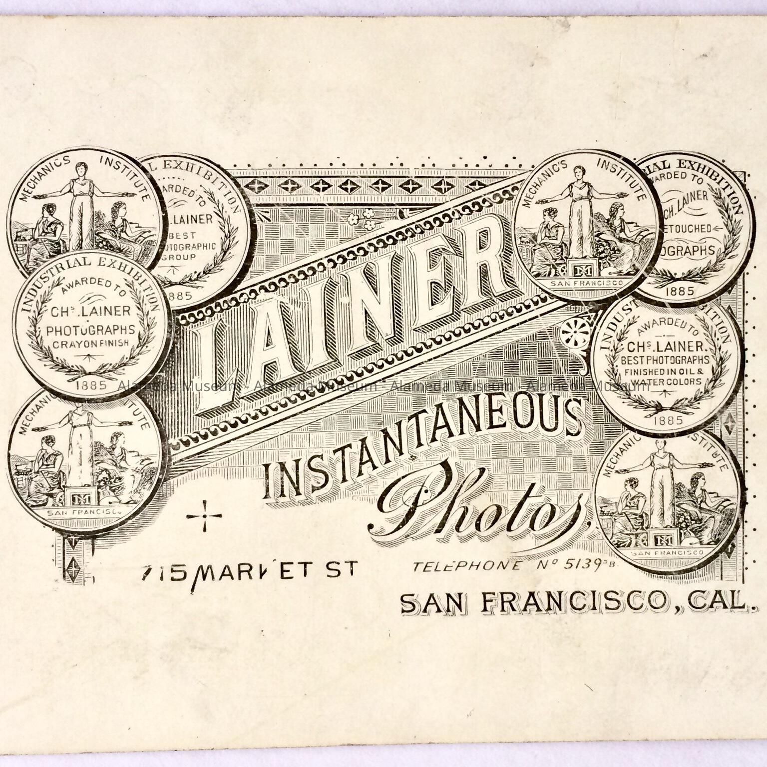 History of Object. A photograph made by Charles Lainer whose studio was in San Francisco but who resided in Alameda at 1038 Fair Oaks Street.