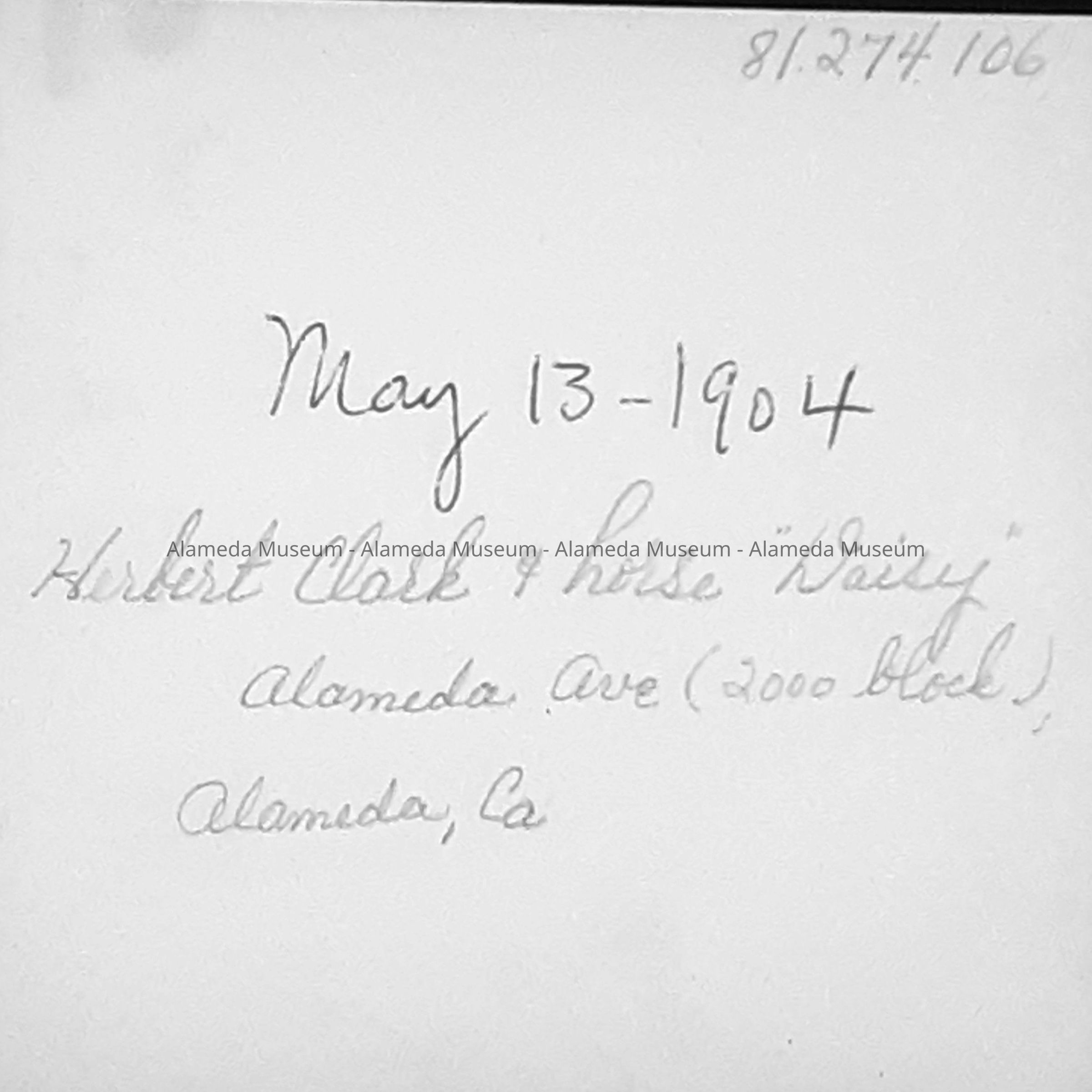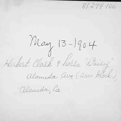 History of Object: A horse "Daisy" was the means of transportation for the Herbert Clark family until her untimely death in a Park Street stable fire in 1907. "Daisy" is pictured with her owner, who is standing in front of the Delius family home on Alameda Avenue (2000 block). The children belong to the Delius family, Mrs. Clark is far left, Mrs. Delius is in white blouse, no hat, & Herbert Clark stands proudly by the carriage with overcoat & hat, ready for business (insurance), 1904.
