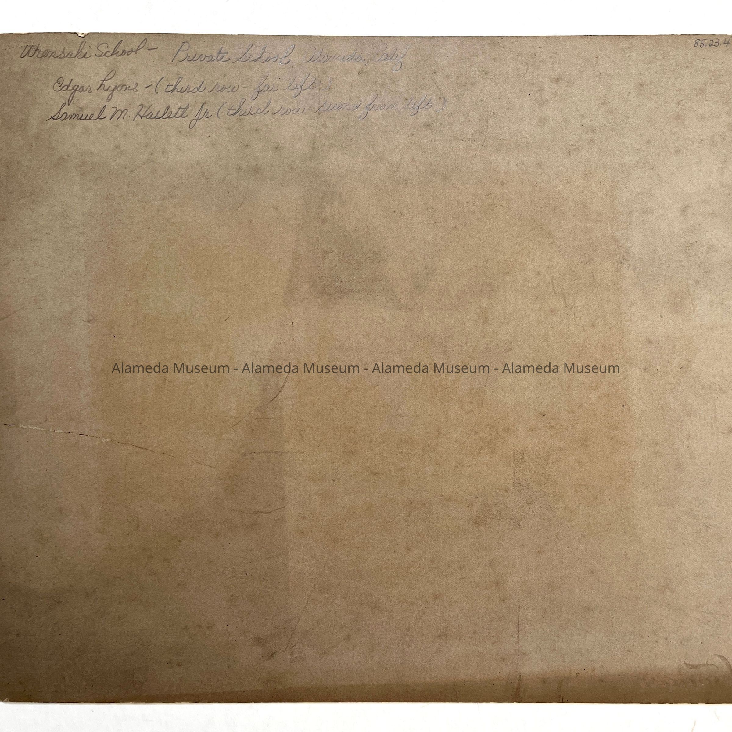 Interior photo, subject- classroom of a private school, Alameda, circa 1895. Edgar Lyons (third row-far left), Samuel M. Haslett Jr., (third row-second from left), are identified.