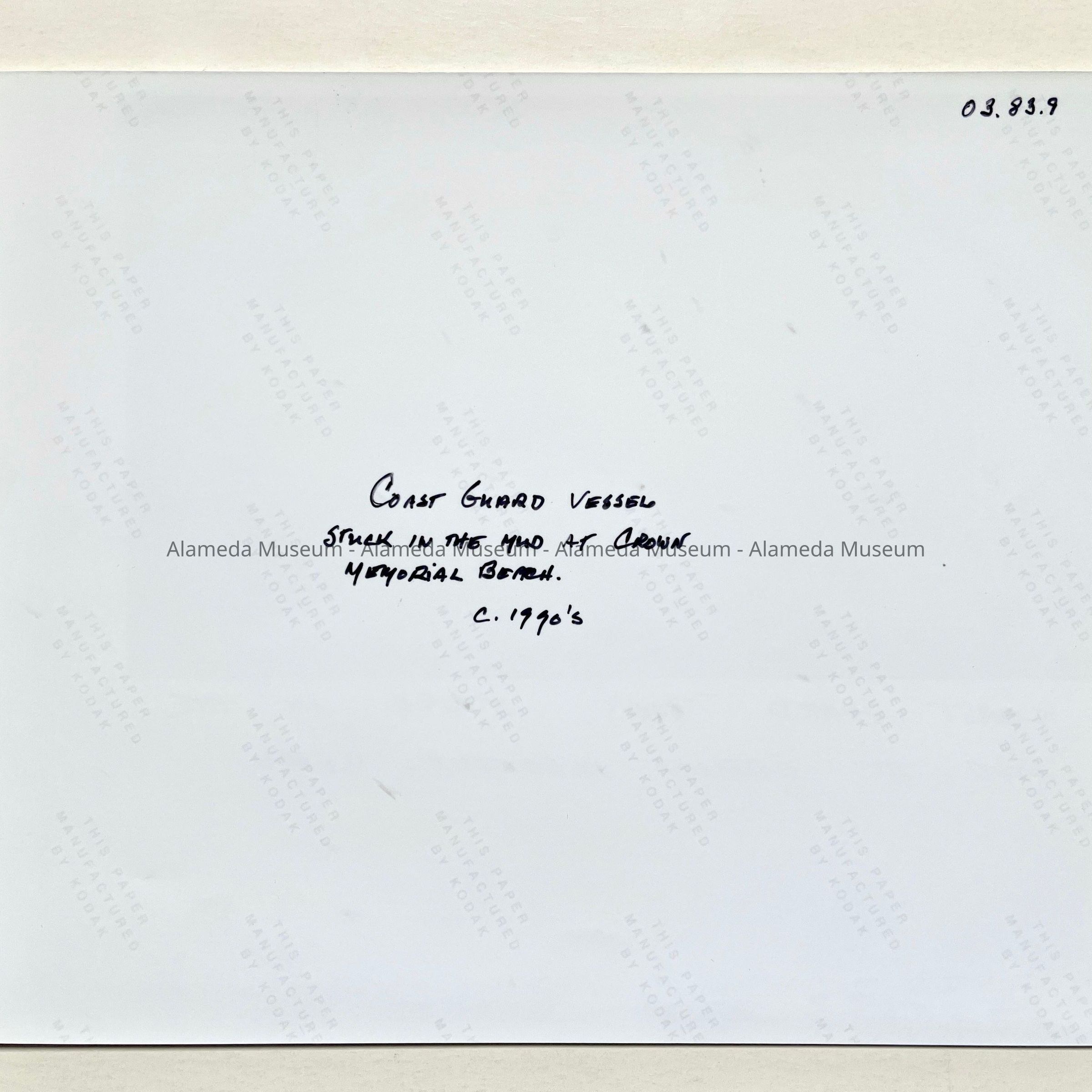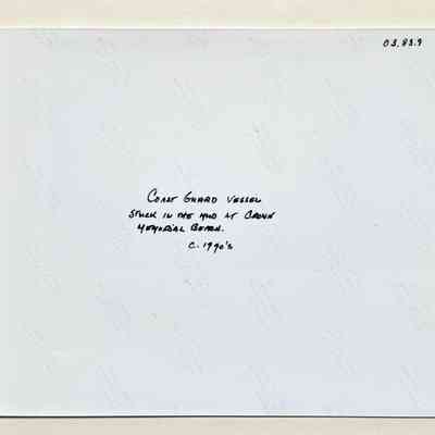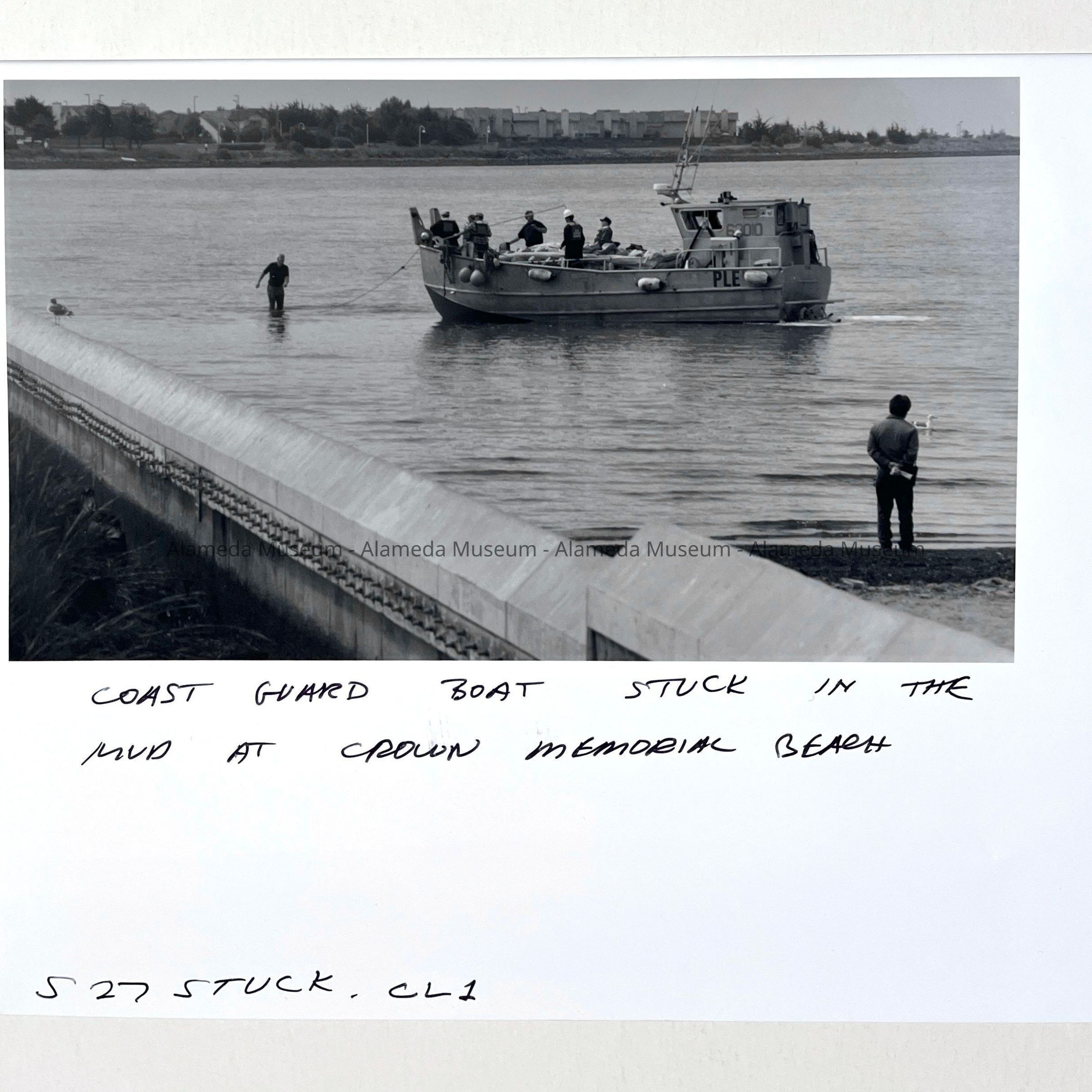 Photo coast Guard Island boat stuck in the mud, Crown Beach, c. 1990sEntry/Object ID