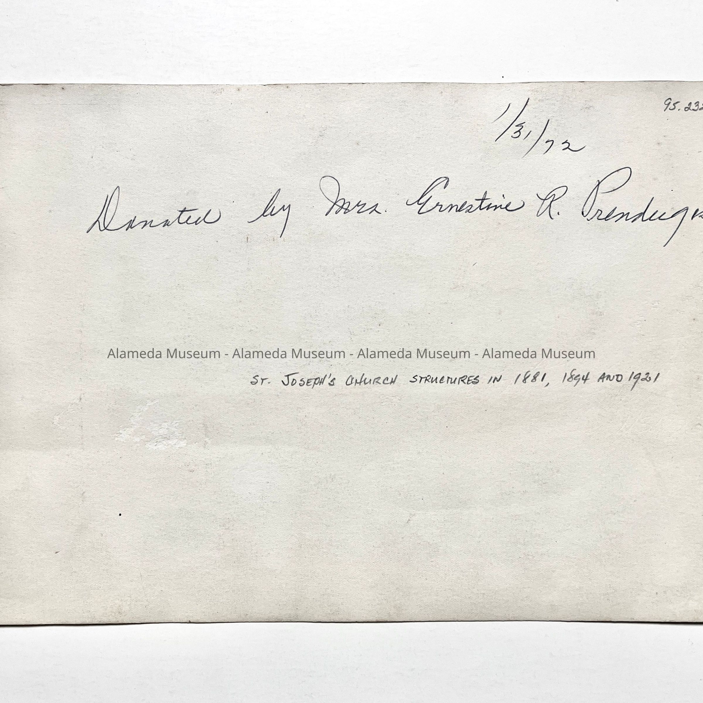 History of Object: Composite photo made from vintage photographs, showing the various St. Joseph's Church edifices in 1881, 1894 and in 1921.