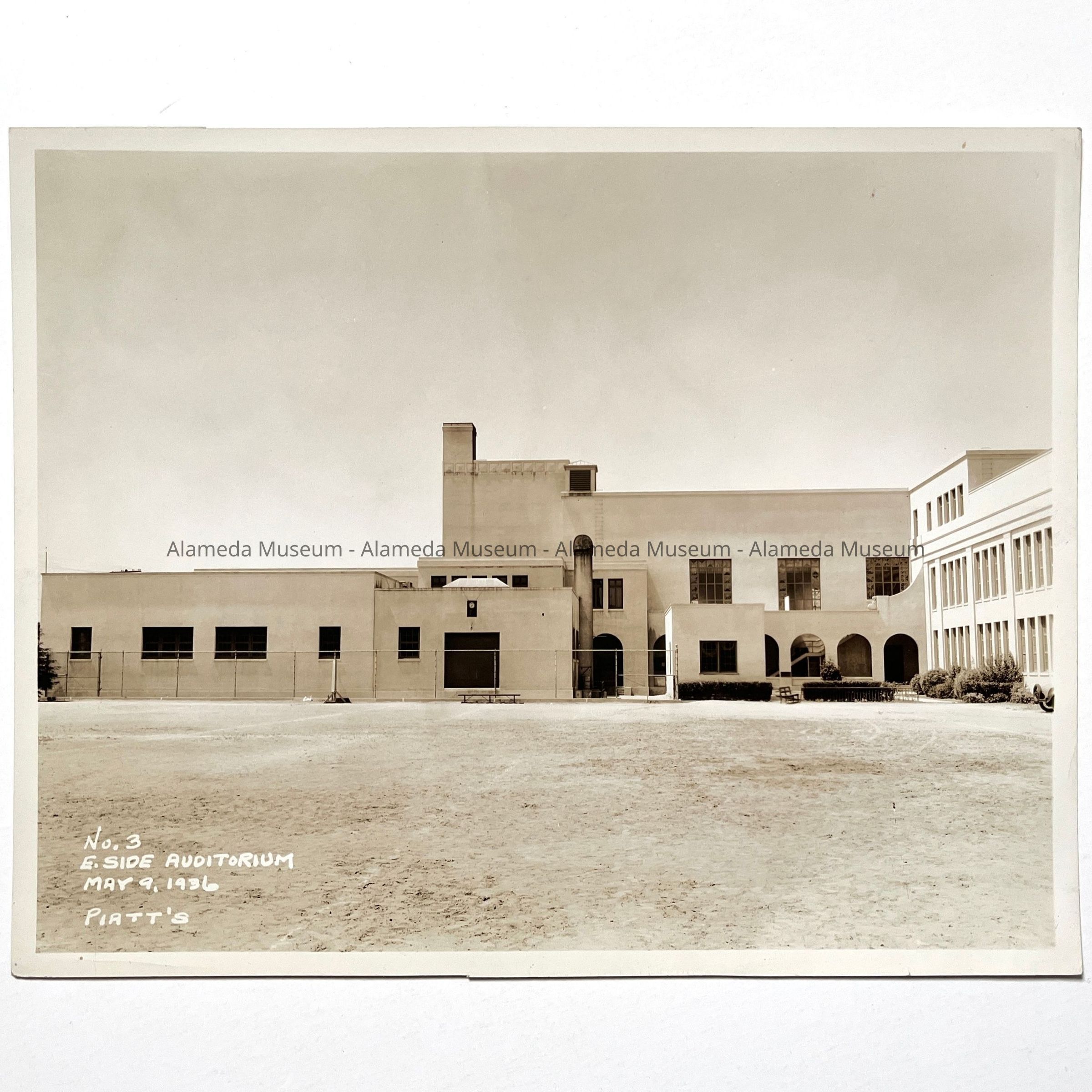 History of Object: Photo depicting before or after construction of the old Alameda High School auditorium (Historic High School), dated May 9, 1936. Possibly alterations or earthquake proofing?