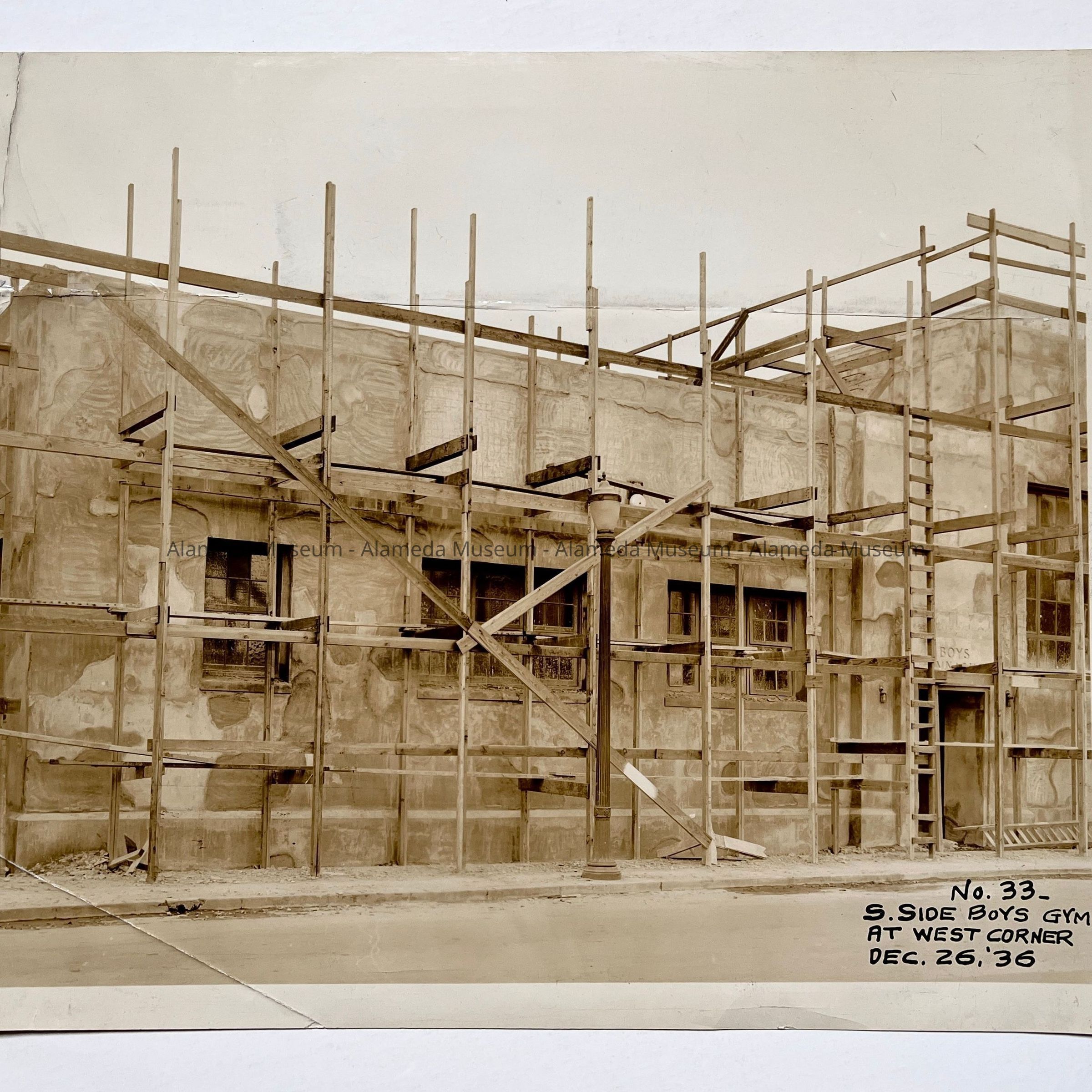 History of Object: Photograph showing construction of the boys' gym, Alameda High School, dated December 26, 1936.