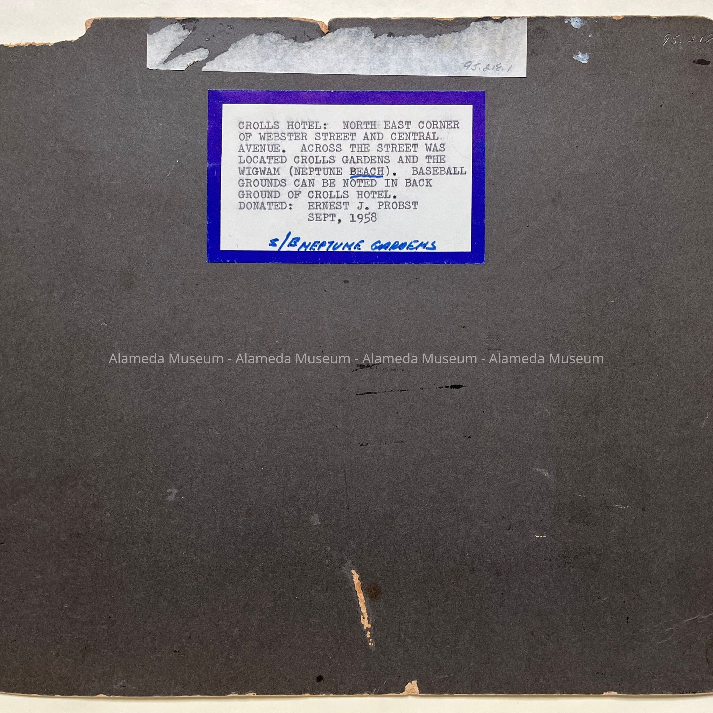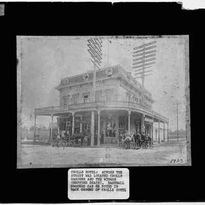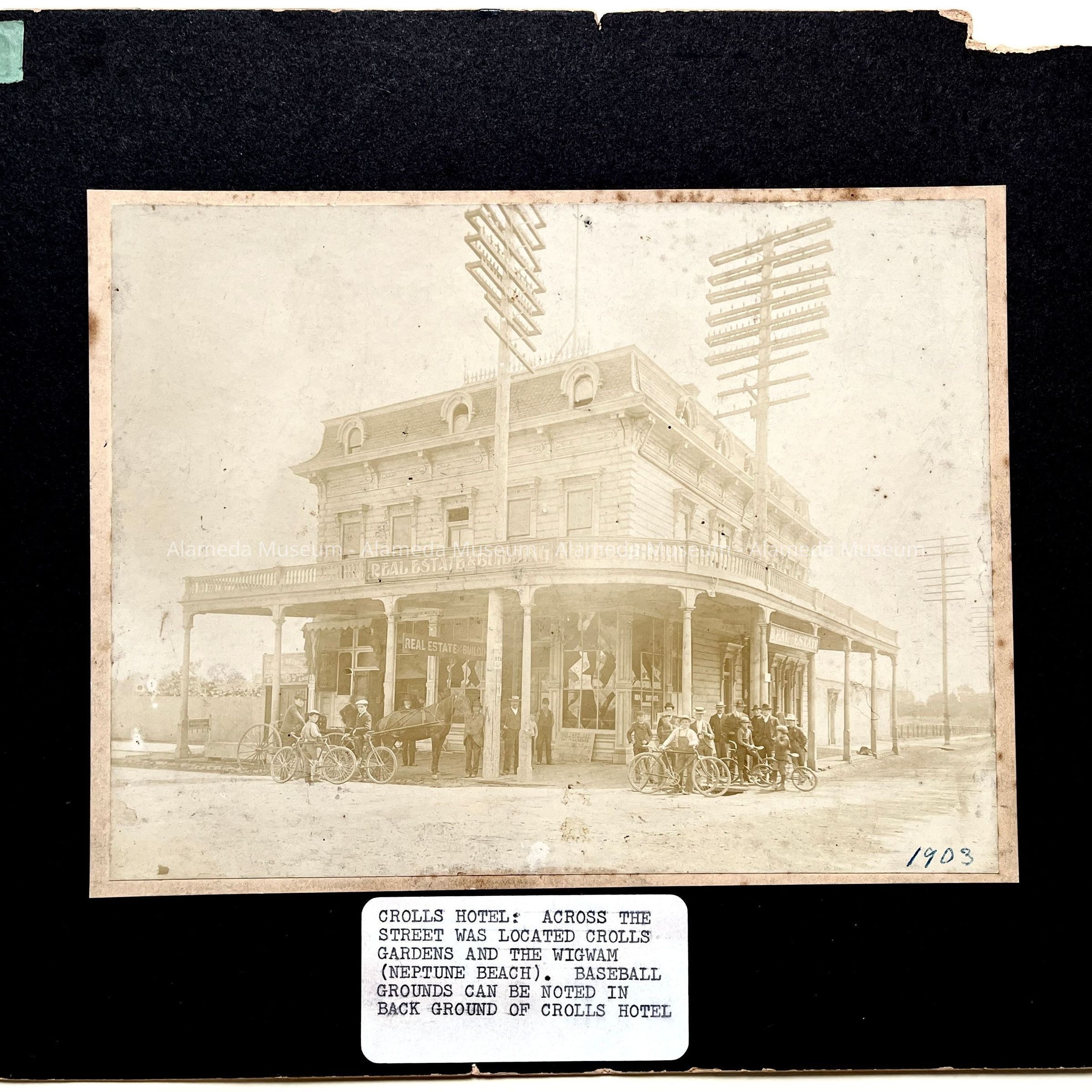 View of Crolls Hotel at corner of Central Avenue and Webster Street, then known as the "Real Estate Building, Group of men, as well as boys with their bicycles, are standing under the portico. Noteworthy is the apparently shattered window glass in the building, possibly due to a locomotive explosion.