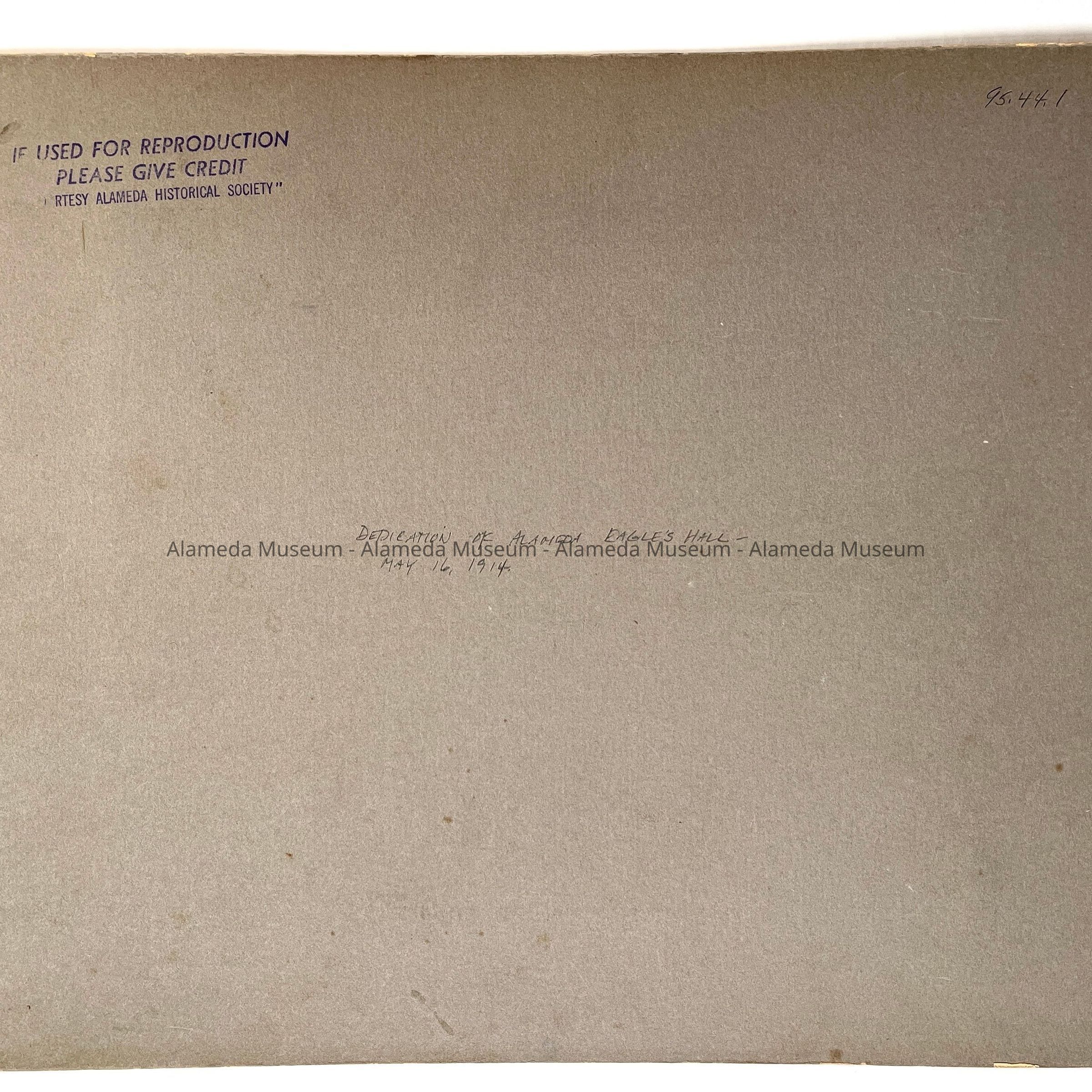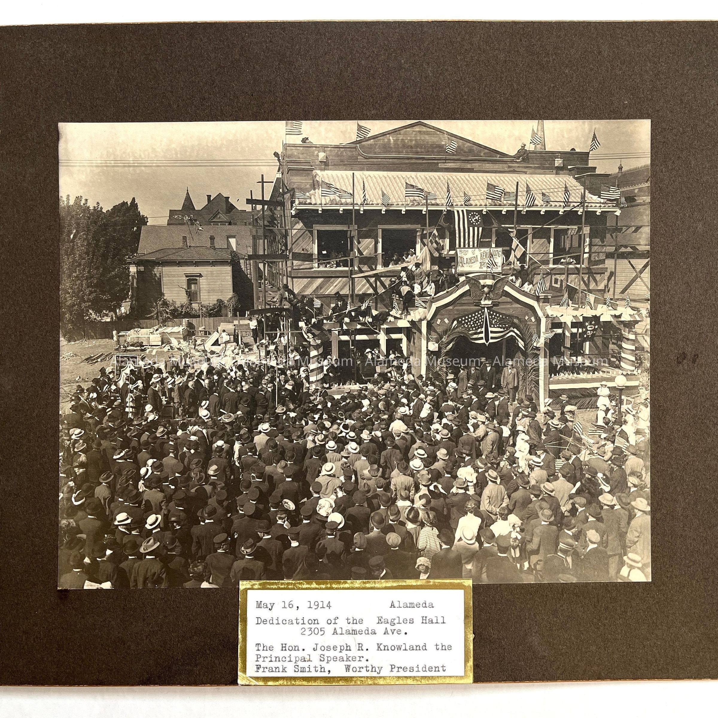 History of Object: Elevated view of large crowd of people attending the dedication of the Eagles Lodge on Alameda Street, May 16, 1914, at which the Hon. Joseph R. Knowland was the principal speaker.