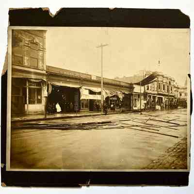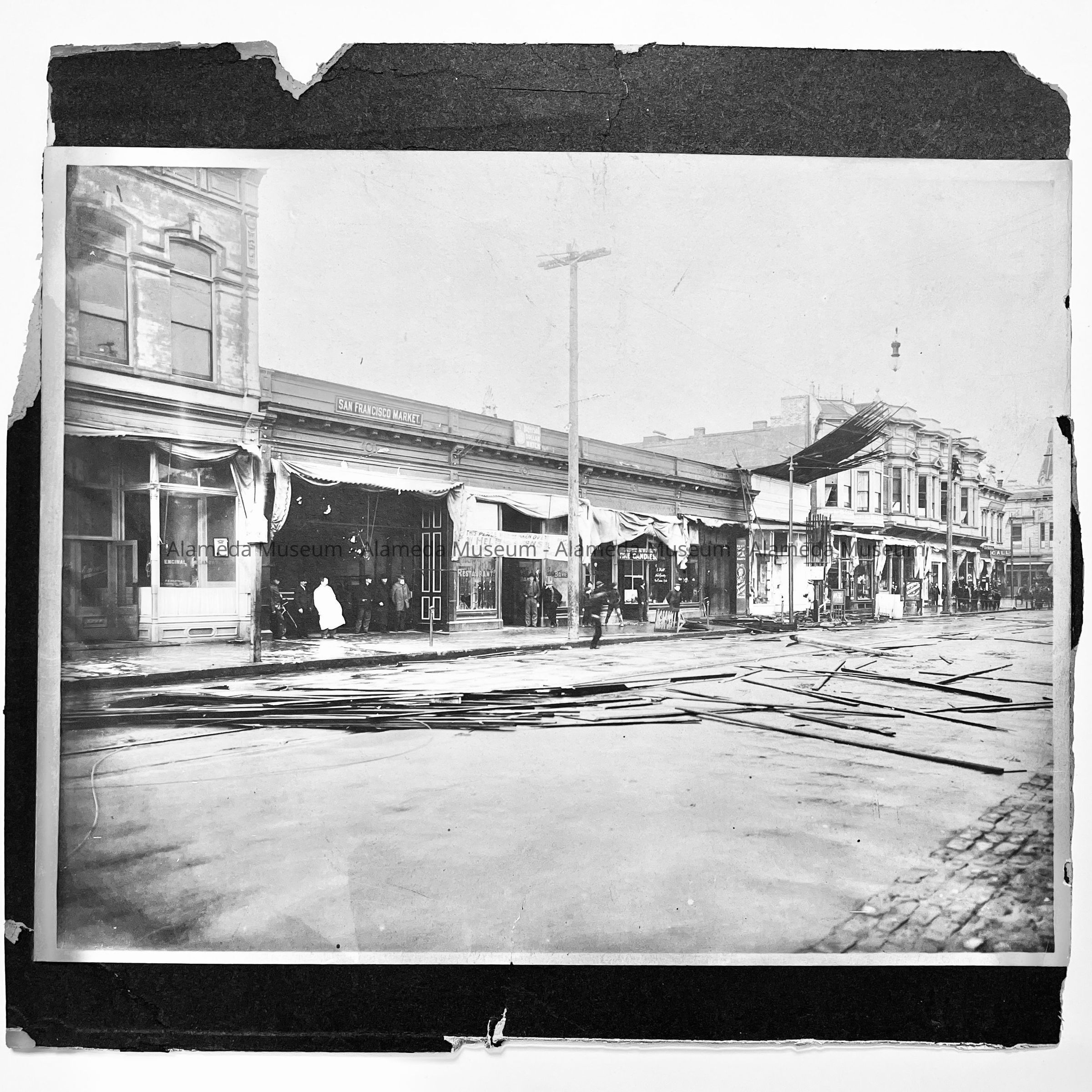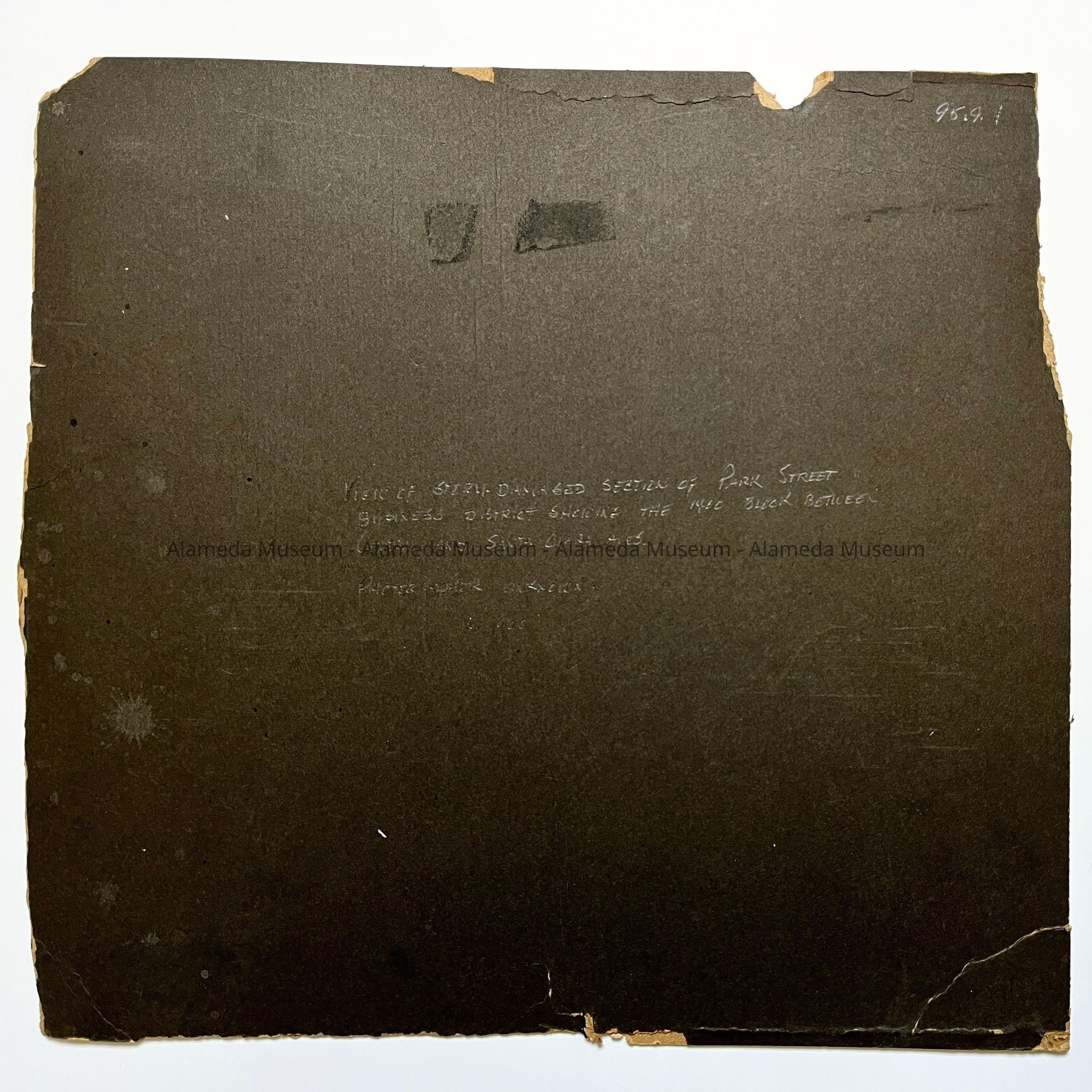 History of Object: View of storm-damaged section of Park Street business district showing the 1400 block between Central and Santa Clara Ave.