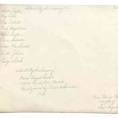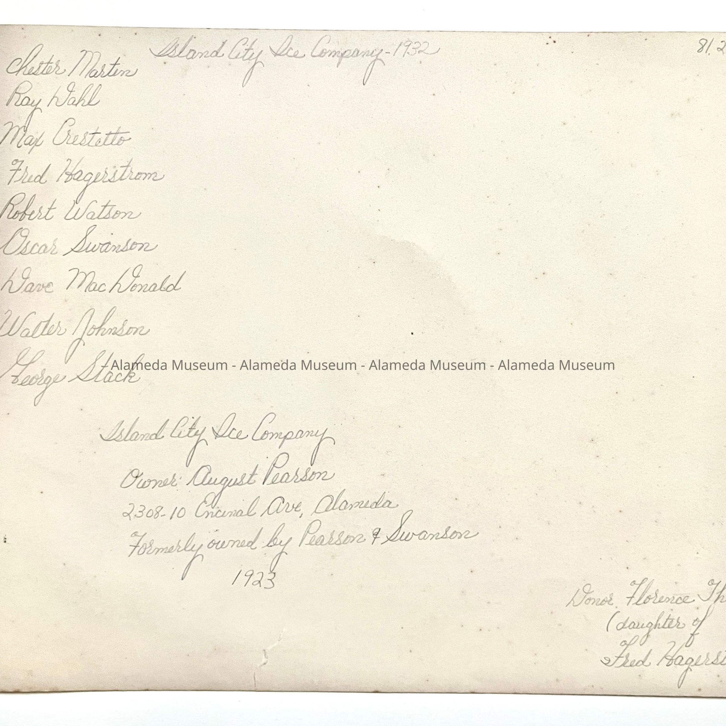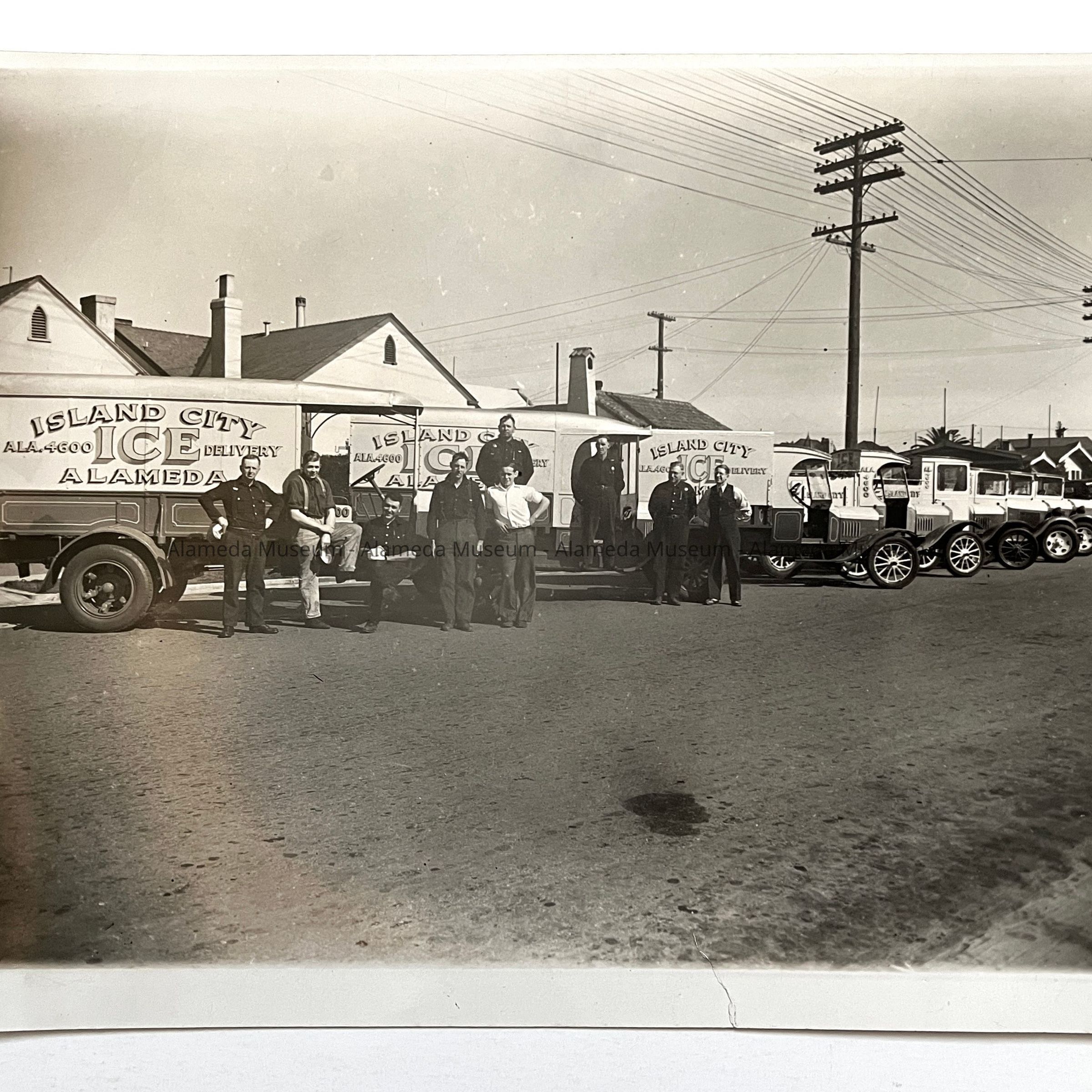 History of Object: Photograph of delivery trucks and employees of the Island city Ice Company, 1932. Pictured: Chester Martin, Ray Dahl, Max Crestetto, Fred Hagerstrom Robert Watson, Oscar Swanson, Dave MacDonald, Walter Johnson, & George Stack. Island City Ice Company, owner, August Pearson, 2308-10 Encinal avenue, Alameda. Formerly owned by Pearson & Swanson, 1923.