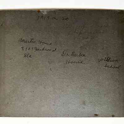 Description: Black & white photograph on heavy charcoal grey colored mounting, unsigned. People are identified in pen on the front, and the homes on the back.