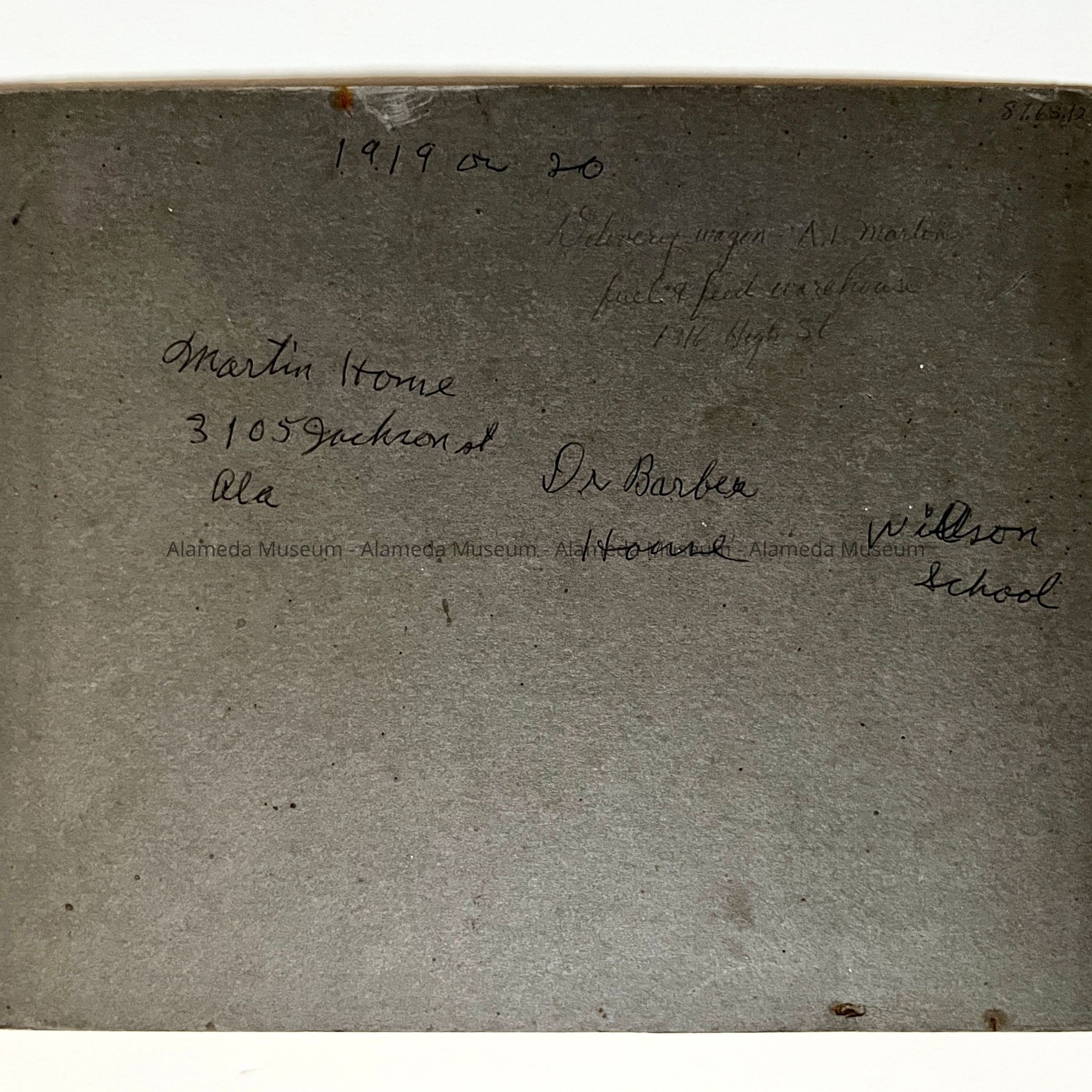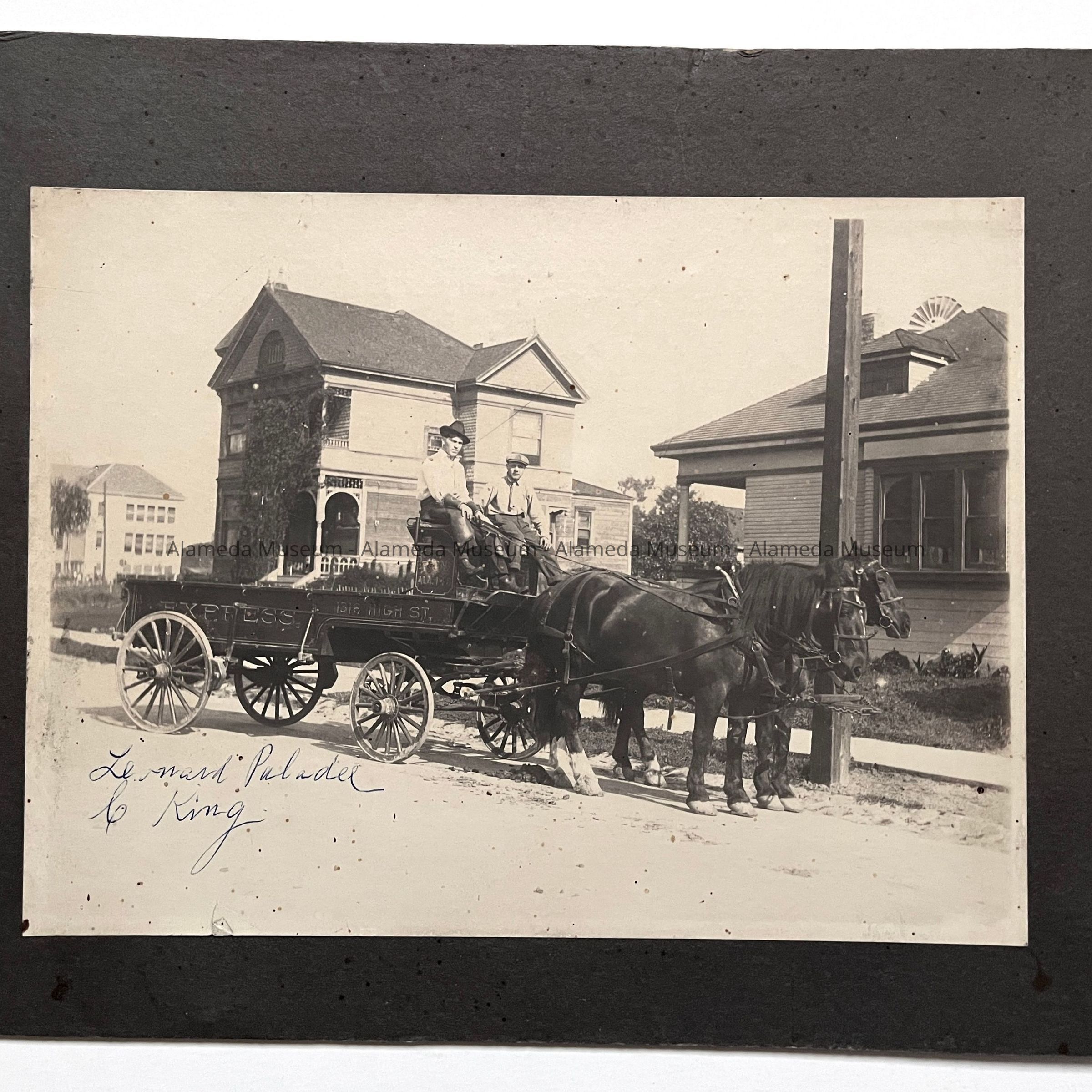 History of Object: A photo of a delivery wagon of the Arthur L. Martin fuel & feed warehouse, 1316 High Street. The wagon is posed in front of the Martin home, 3105 Jackson Street, Alameda. In the background can be seen the Dr. Barber home (now demolished) and the old Wilson (Lincoln) School (destroyed by fire in 1924).
