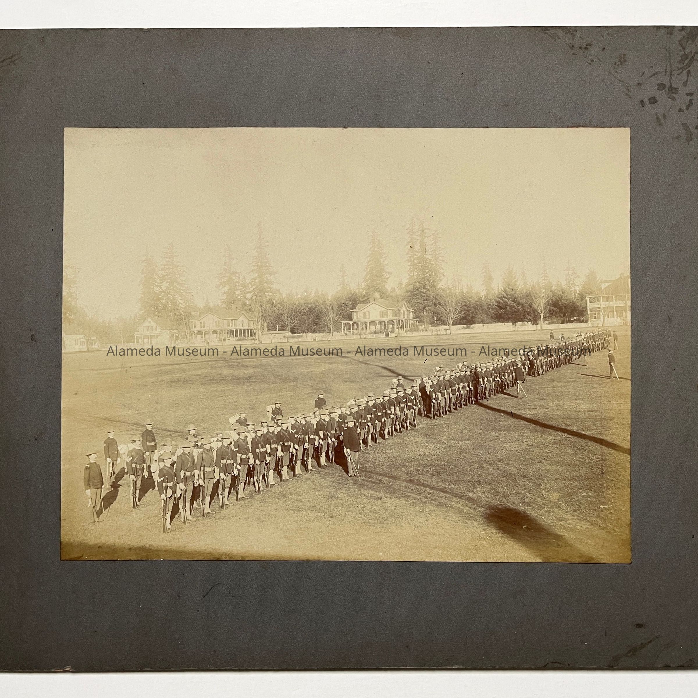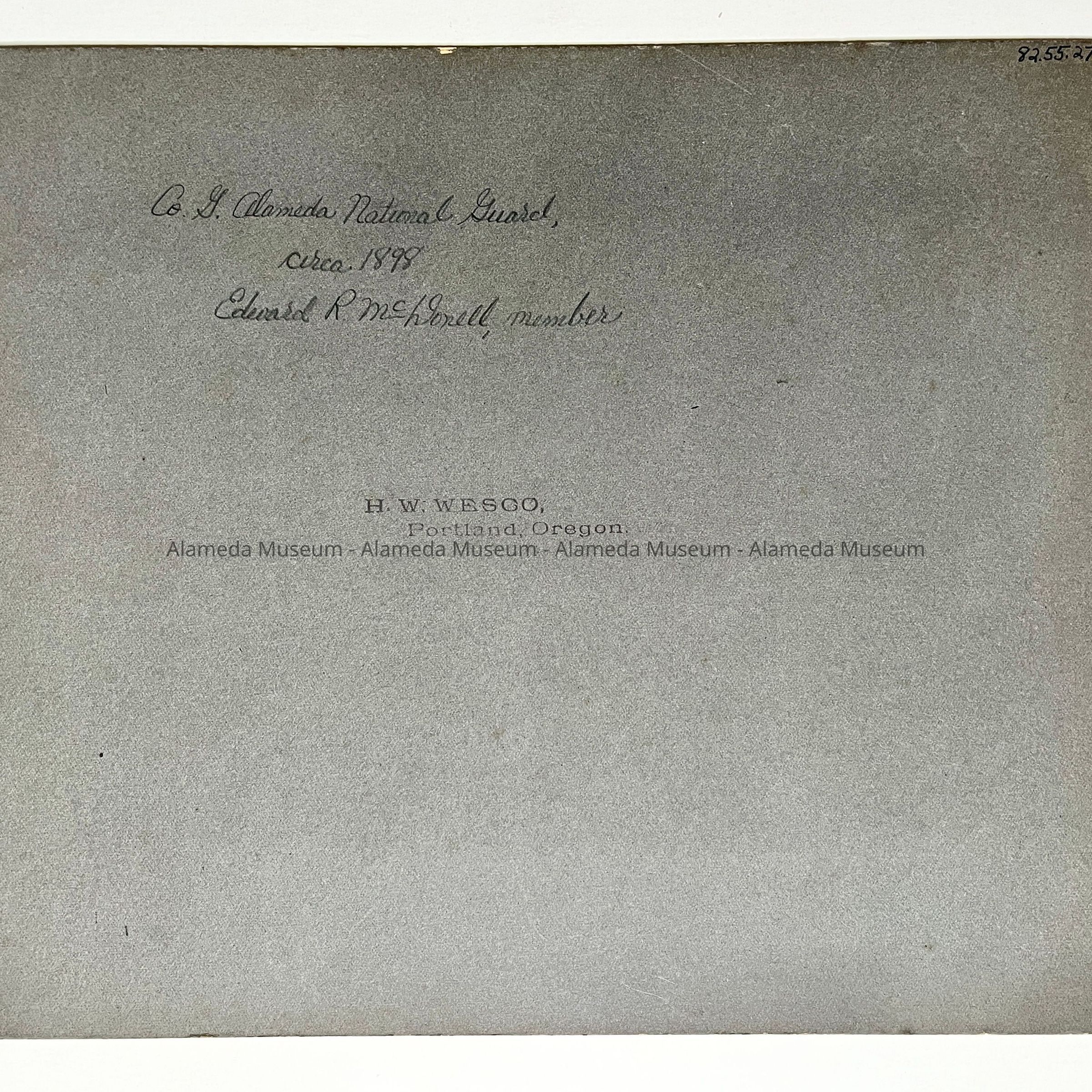 History of Object: Photo, dress parade Co. G., Alameda National Guard, circa 1898, apparently taken in Portland, Oregon. Edward R. McDonell, member. Mr. McDonell was a member of a pioneer family of Bay Farm Island, Alameda.