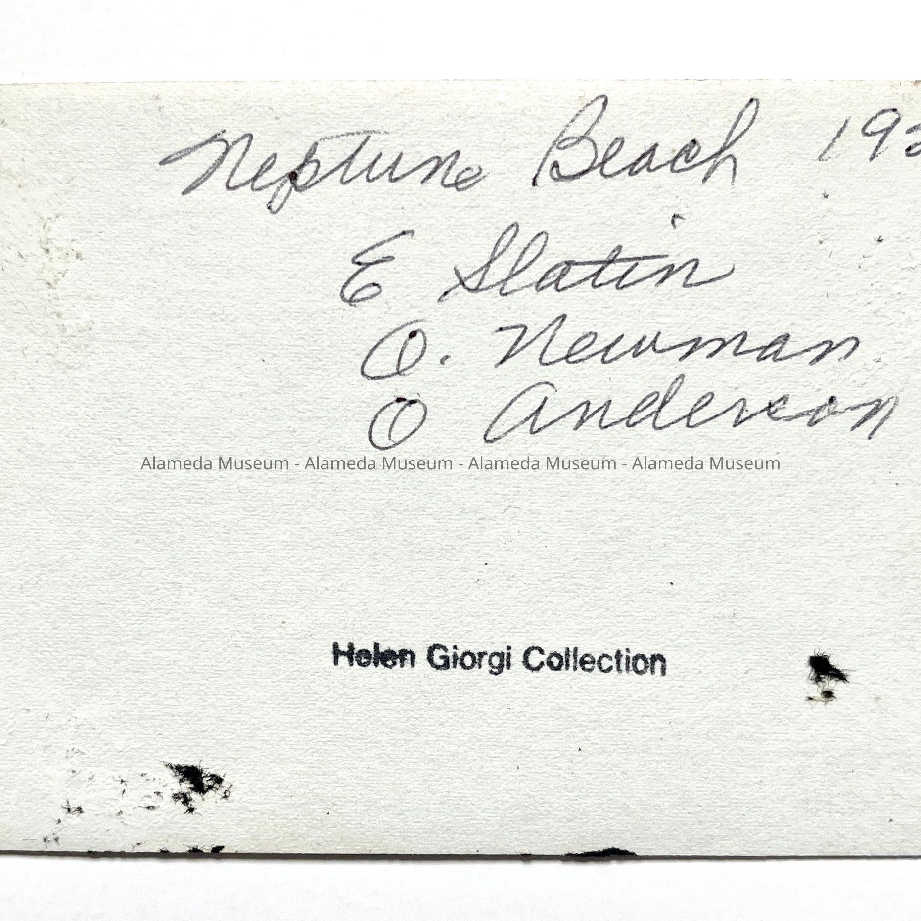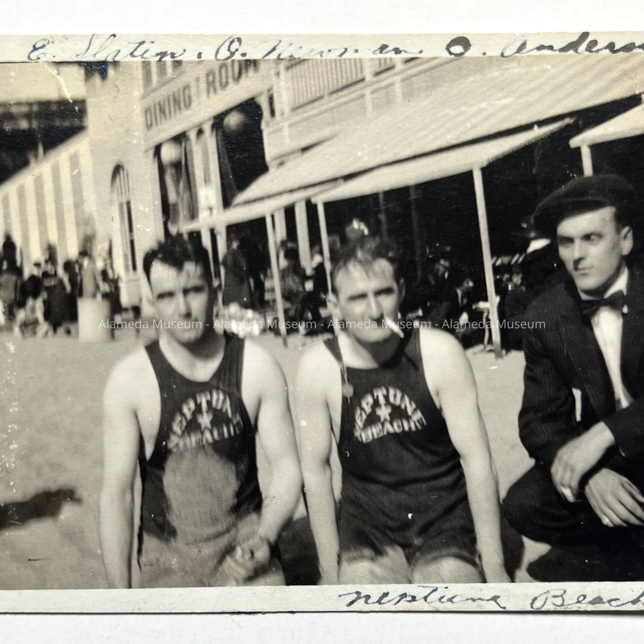 History of Object: Photo of E. Slatin, O. Newman, and O. Anderson at Neptune Beach, Alameda, California, 1920.