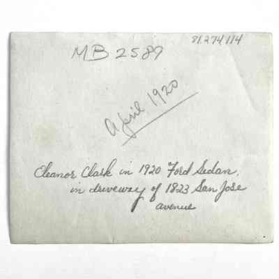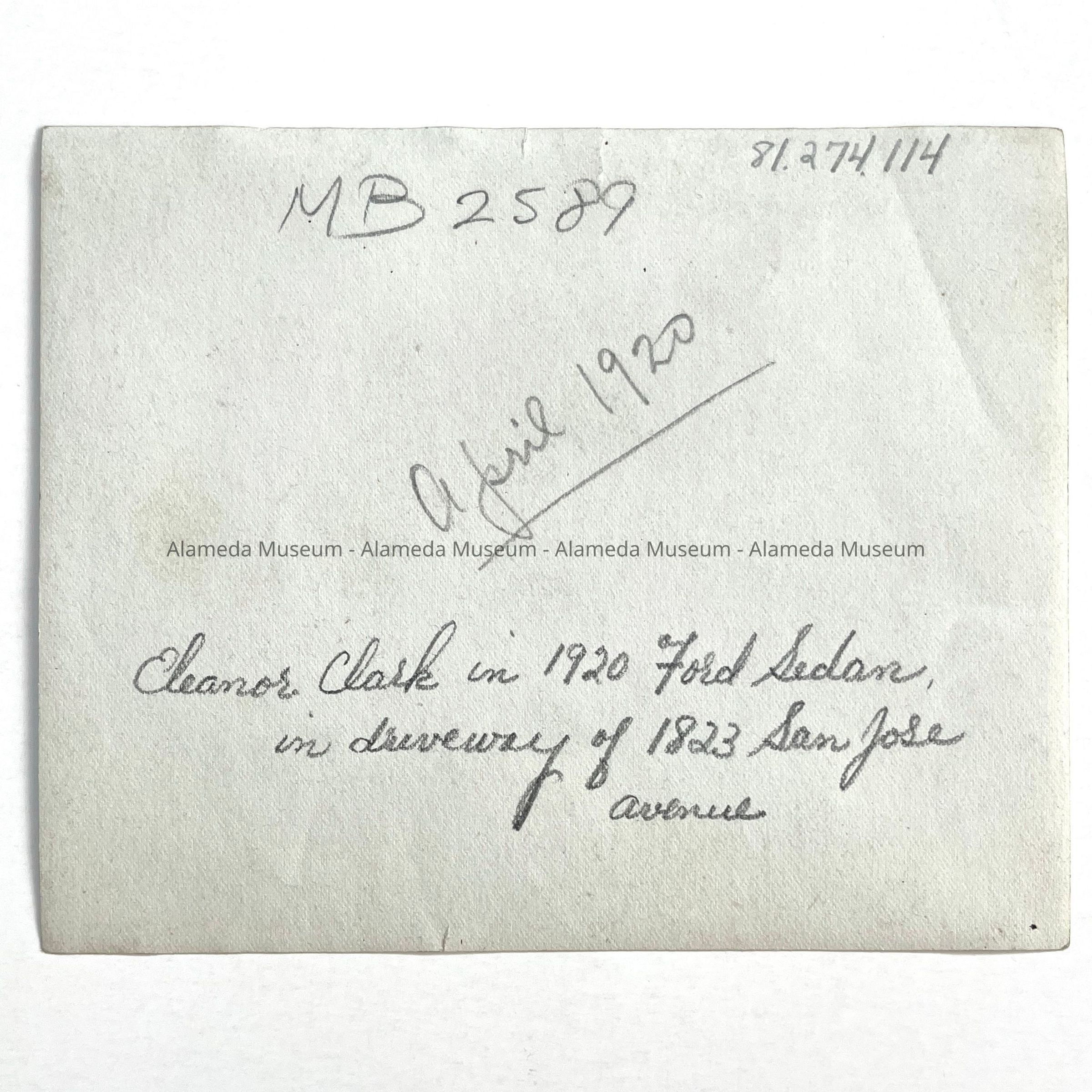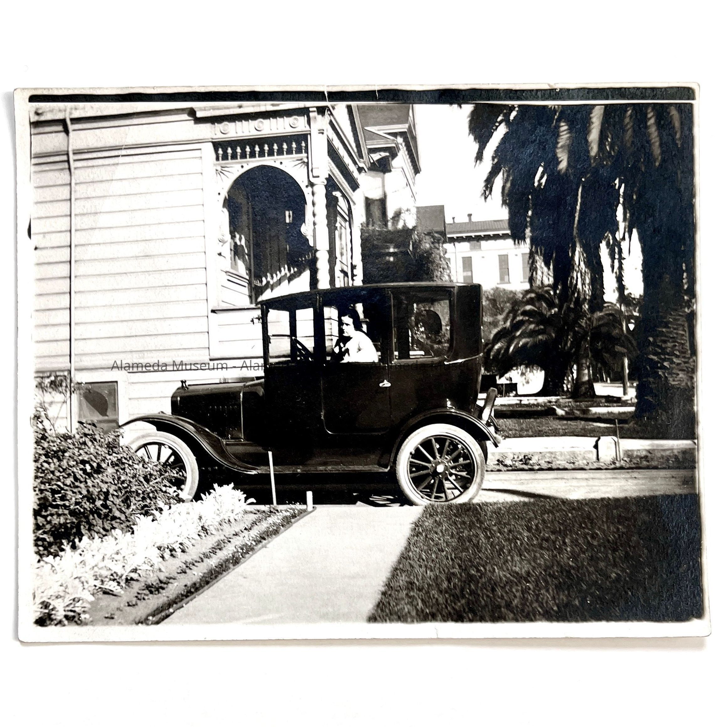 (Quoted from Ms. Eleanor Clark) Photo of 1920 Ford Sedan. This was the first Ford sedan owned by Herbert Clark. All automobiles prior to this date (for the Clarks) had been open touring cars, Sedan were just coming into prominence. You can see a portion of the old Notre Dame Academy in the background (comers of Chestnut-Lafayette and San Jose Avenue) in the picture. The driver of the elegant car is Eleanor Clark, a senior at Alameda High at the time.