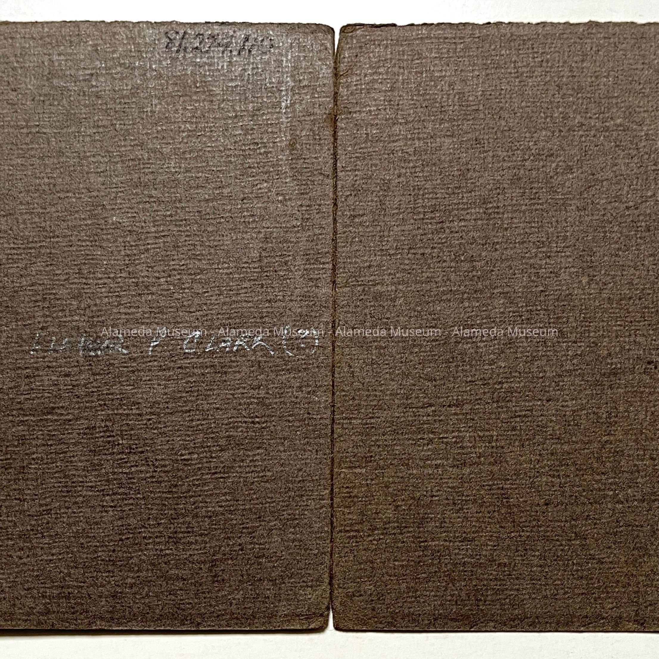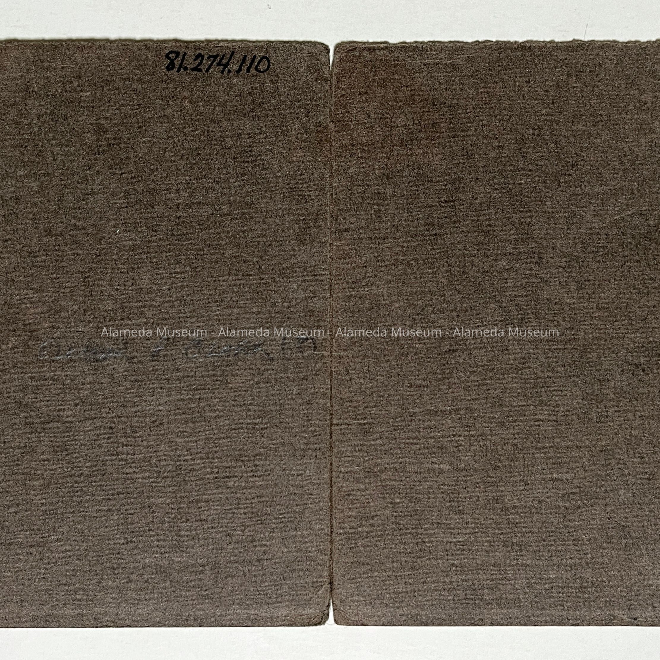 Description: Sepia tinted photo, soft focus, with dark brown jacket in the form of a booklet that houses the photo. Photo signed in pencil in lower right hand comer "Gertrude Cockroft, 1908".