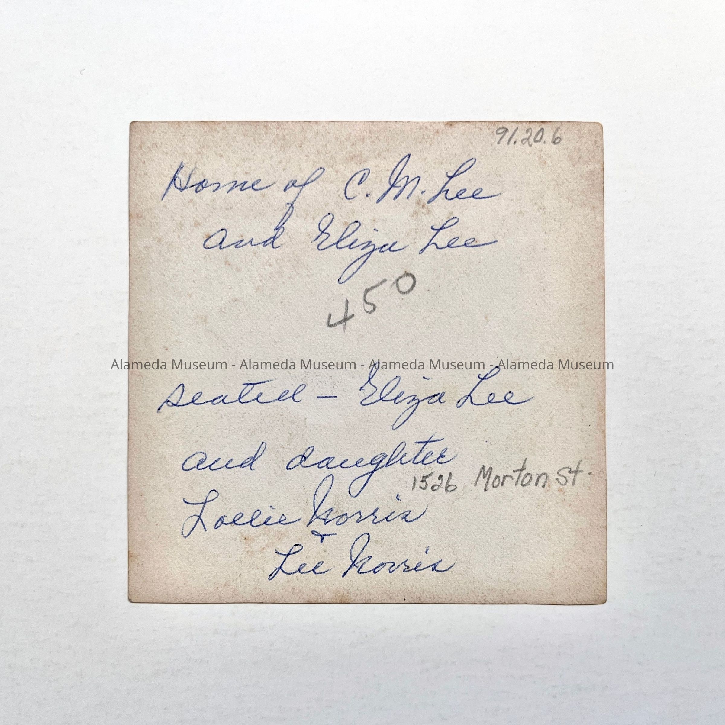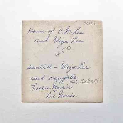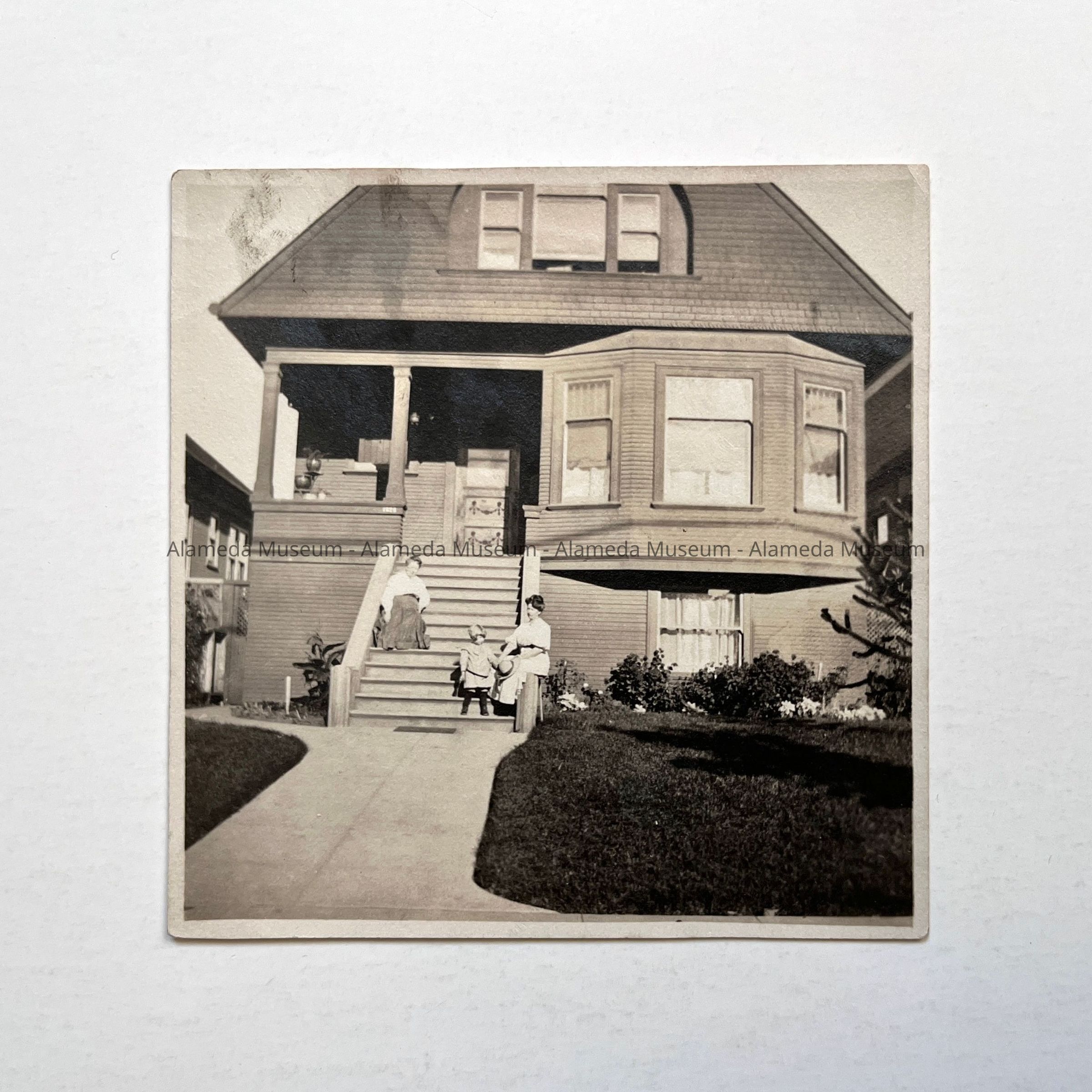 History of Object: Photograph, main facade, home of C.M. Lee and Eliza Lee. Eliza Lee and daughter Lollie Norris are pictured sitting on the front steps. The house is located on Morton Street between Santa Clara and Lincoln Avenues. Address unknown.