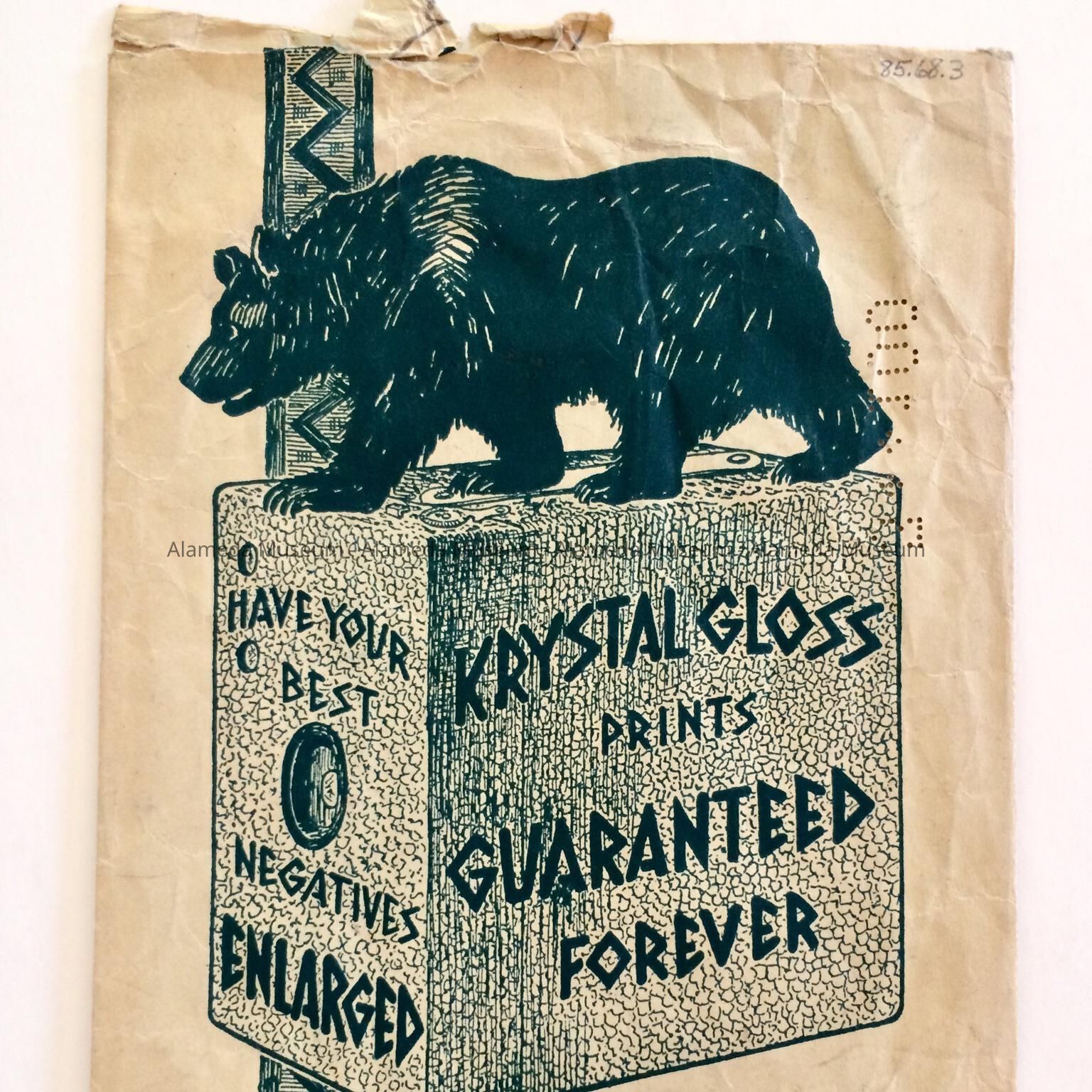 Description: Photographic envelope with company emblem of a bear standing upon a box camera with the printed caption "Krystal Glass prints guaranteed forever" and on the reverse side bold printed caption "Lincoln Park Pharmacy."
