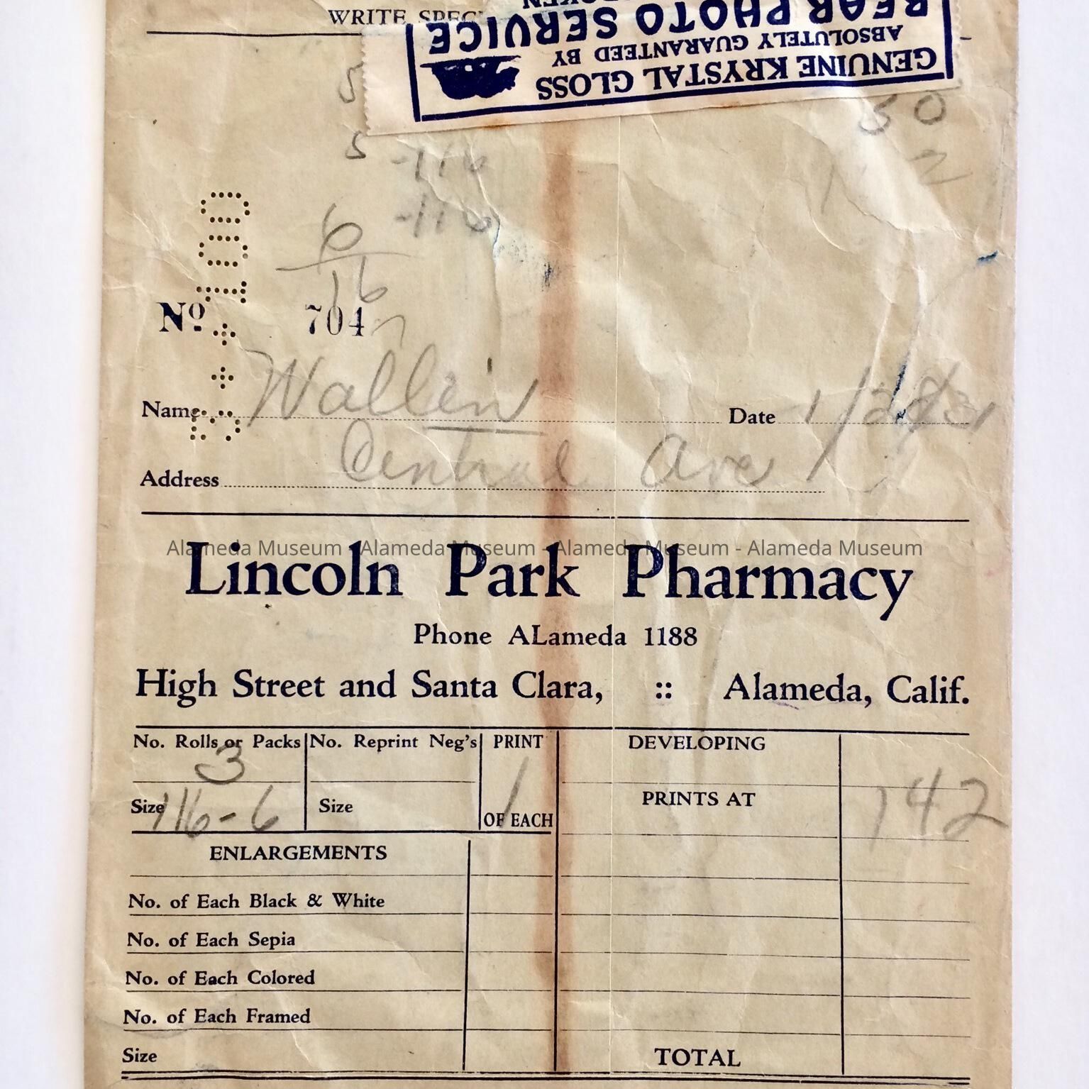 History of Object: Photo envelope advertising Lincoln Park Pharmacy," High Street and Santa Clara Avenue, phone Alameda 1188, Alameda. Dated 1-28-31