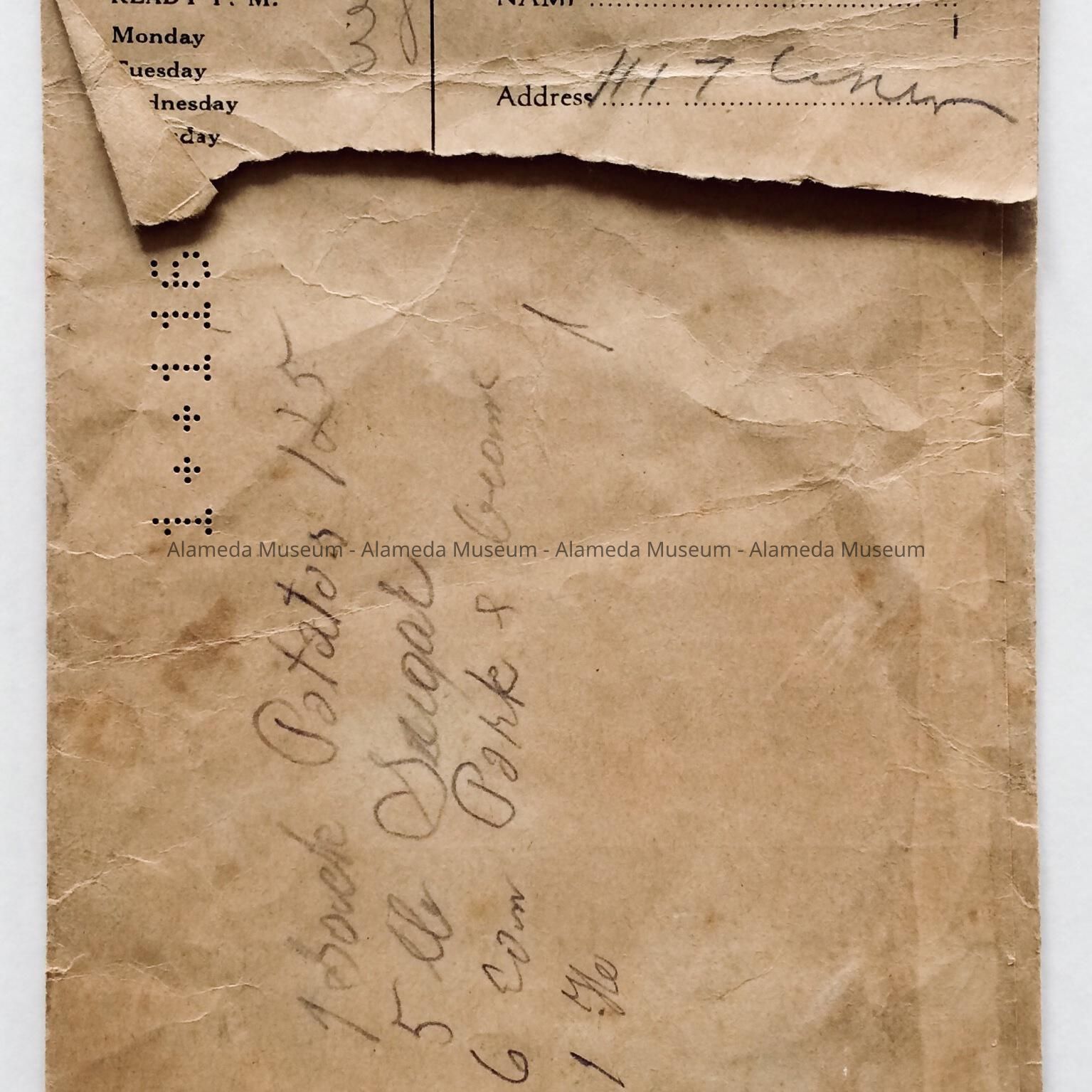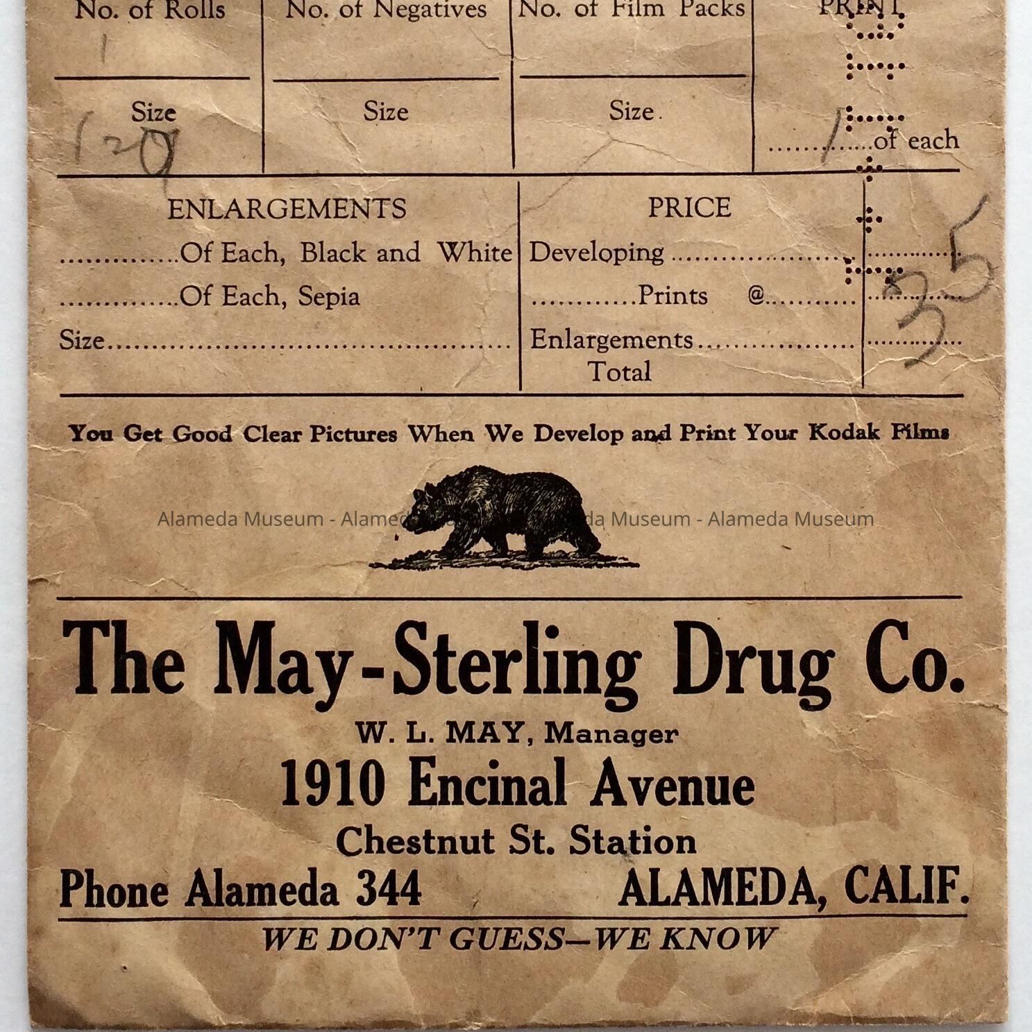 PHOTOGRAPH ENVELOPE ADVERTISING THE MAY-STERLING DRUG CO., 1910 ENCINAL AVE., ALAMEDA, CALIFORNIA. TELEPHONE: Alameda 3444.