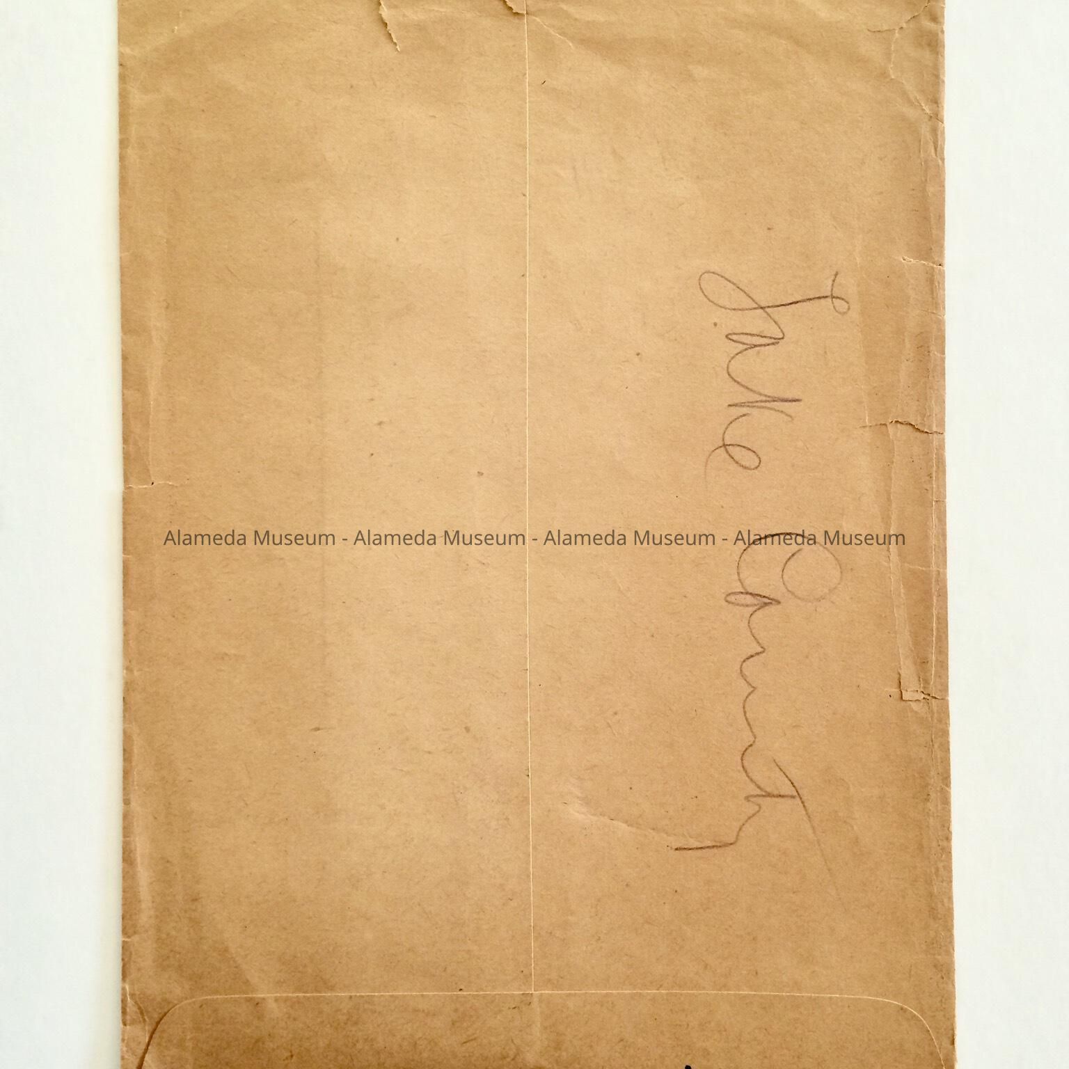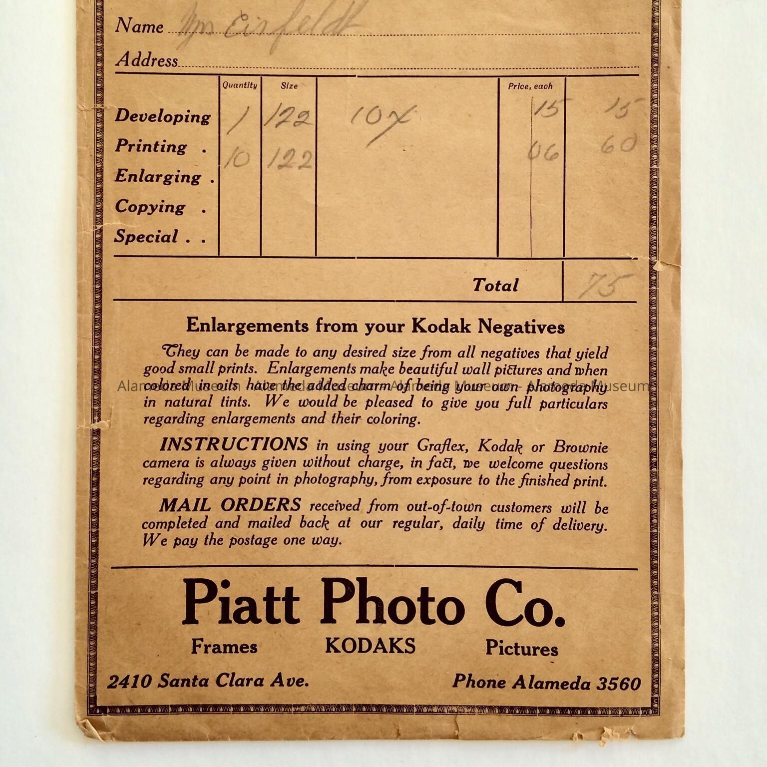 Photograph envelope advertising Piatt Photo Company, Frames, etc., 2410 Santa Clara Avenue and dated October 5, 1922. The envelope was issued to Mrs. Eisfeldt. The Eisfeldt family came to Alameda in the 1890's.