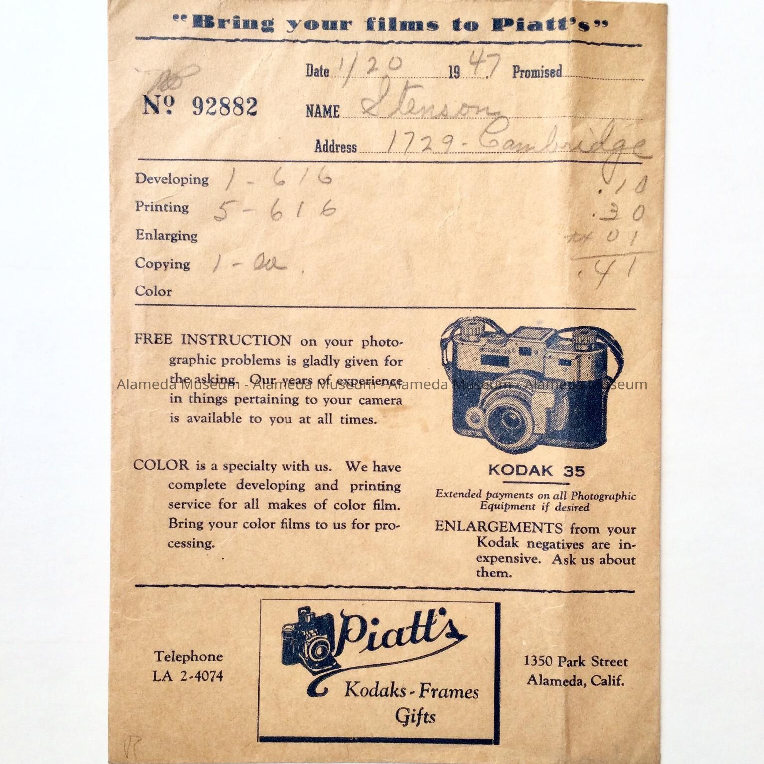 PHOTOGRAPH ENVELOPE FROM PIATT'S "KODAKS, FRAMES, AND GIFTS," 1350 PARK STREET, ALAMEDA, CALIFORNIA.