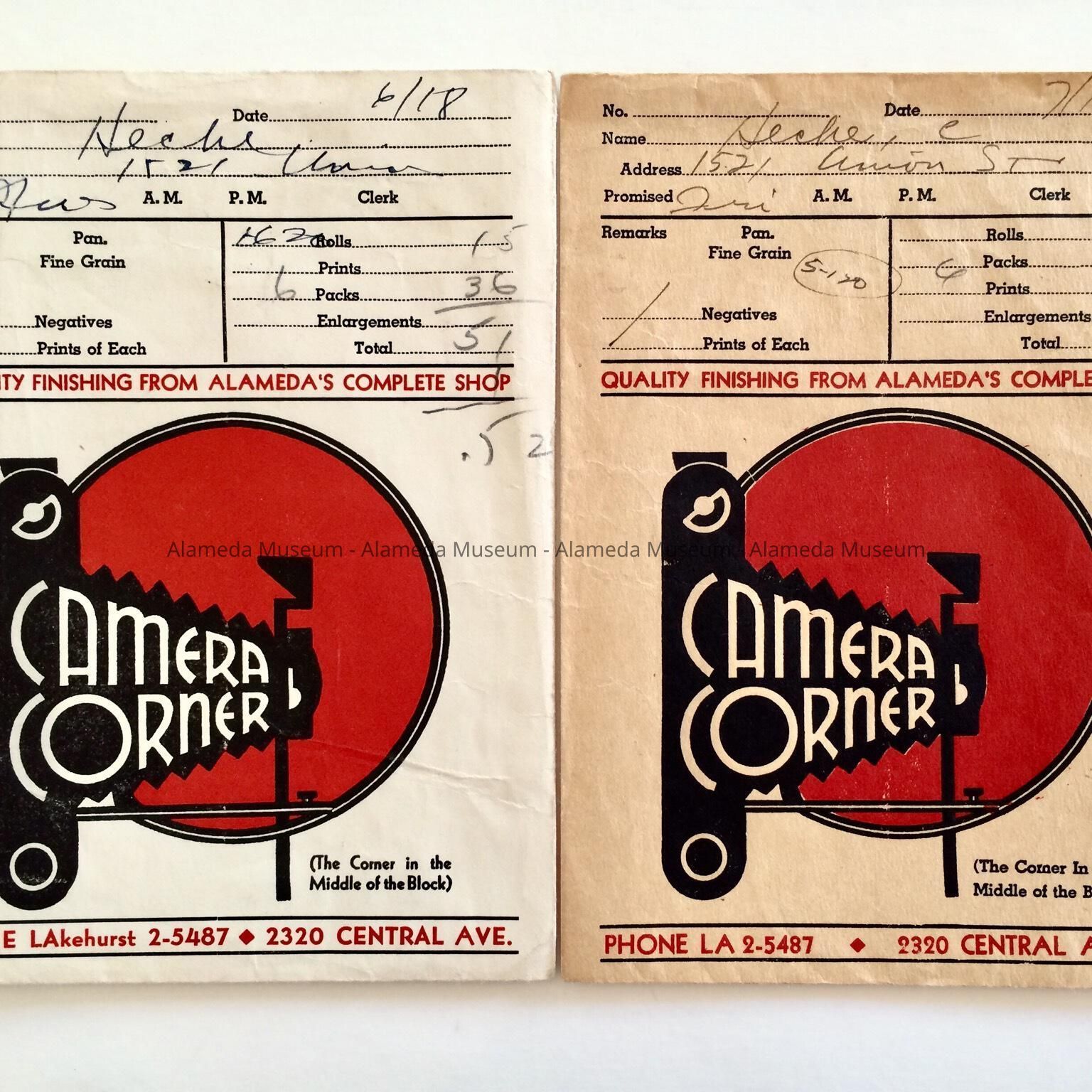 Photographic envelopes advertising the Camera Corner at 2320 Central Avenue. The envelopes were issued to the late Carol Heche, 1521 Union Street. Mrs. Heche was the granddaughter of W.W. Chipman, co-founder of the City of Alameda.