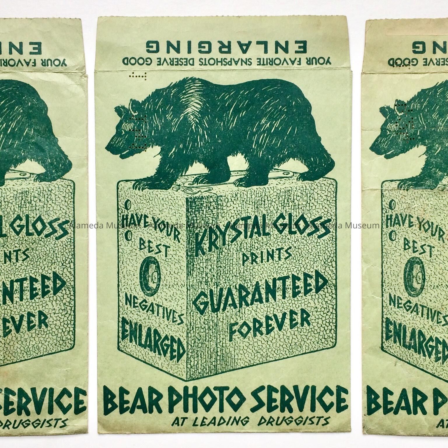 THREE PAPER ENVELOPES, WITH ILLUSTRATIONS OF A BEAR STANDING ON A BROWNIE CAMERA. CAMERA CAPTION READS, "KRYSTAL GLOSS GUARANTEED FOREVER."