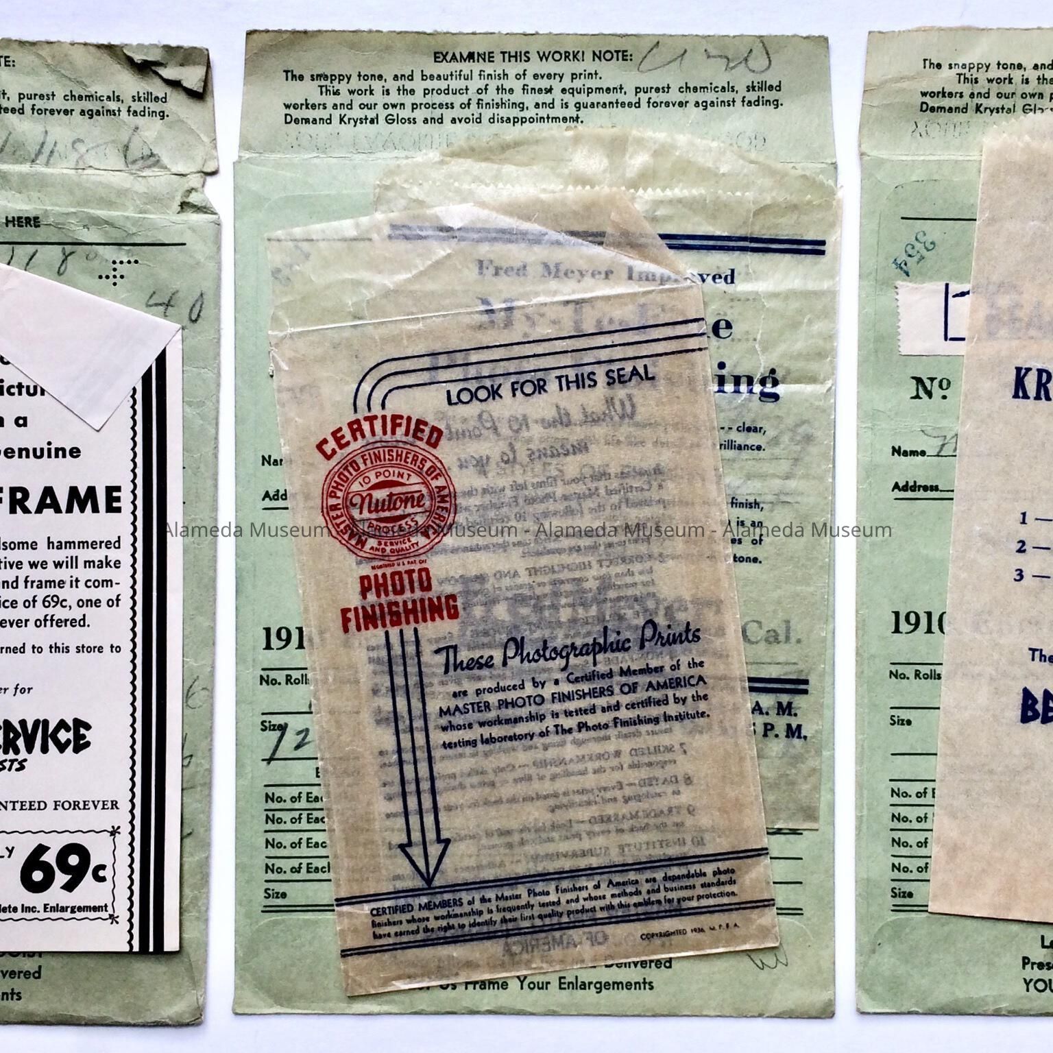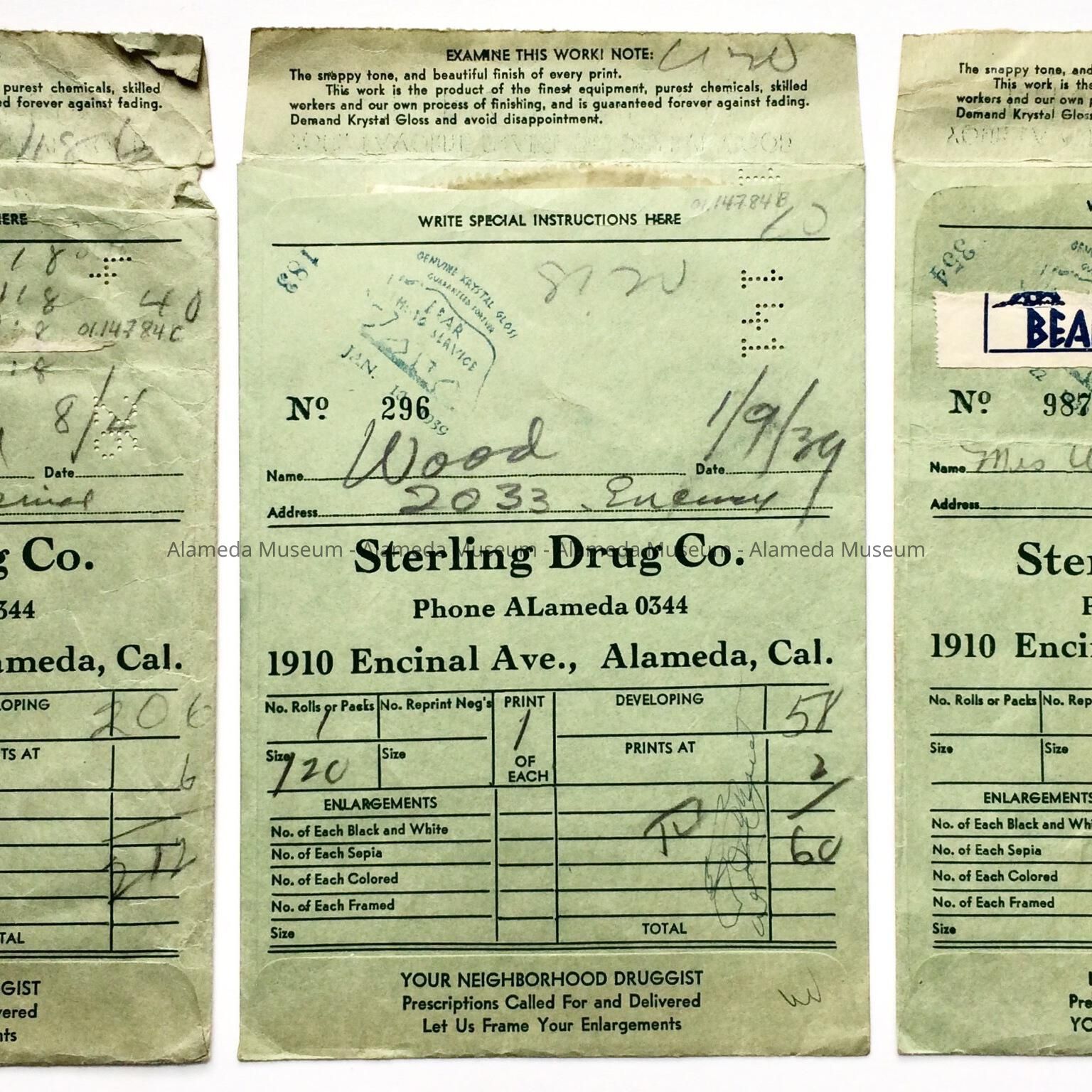 ENVELOPES FOR NEGATIVES FROM THE STERLING DRUG COMPANY, 1910 ENCINAL AVENUE, ALAMEDA. TWO OF THE ENVELOPES CONTAIN NEGATIVES OF THE WOOD FAMILY MEMBERS.