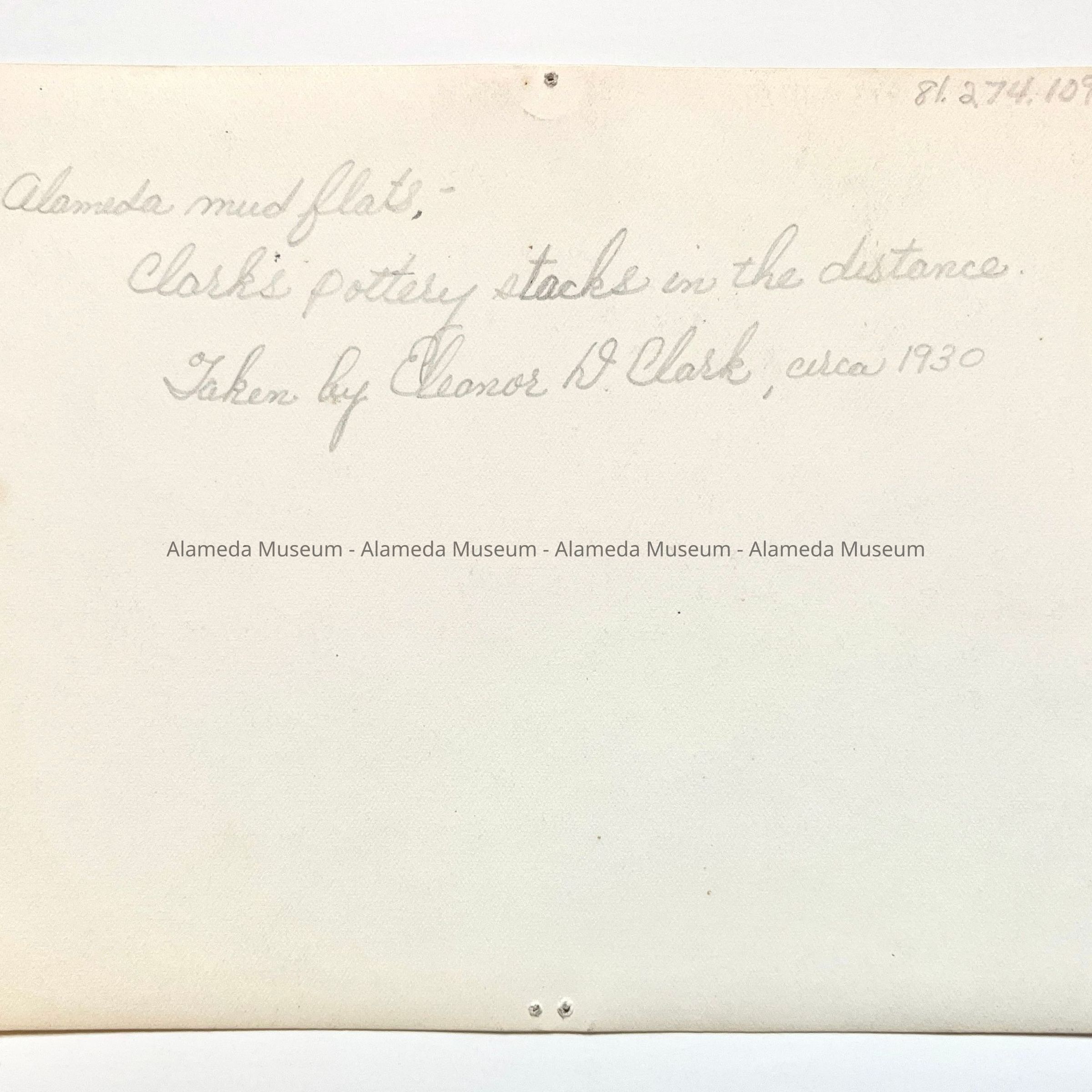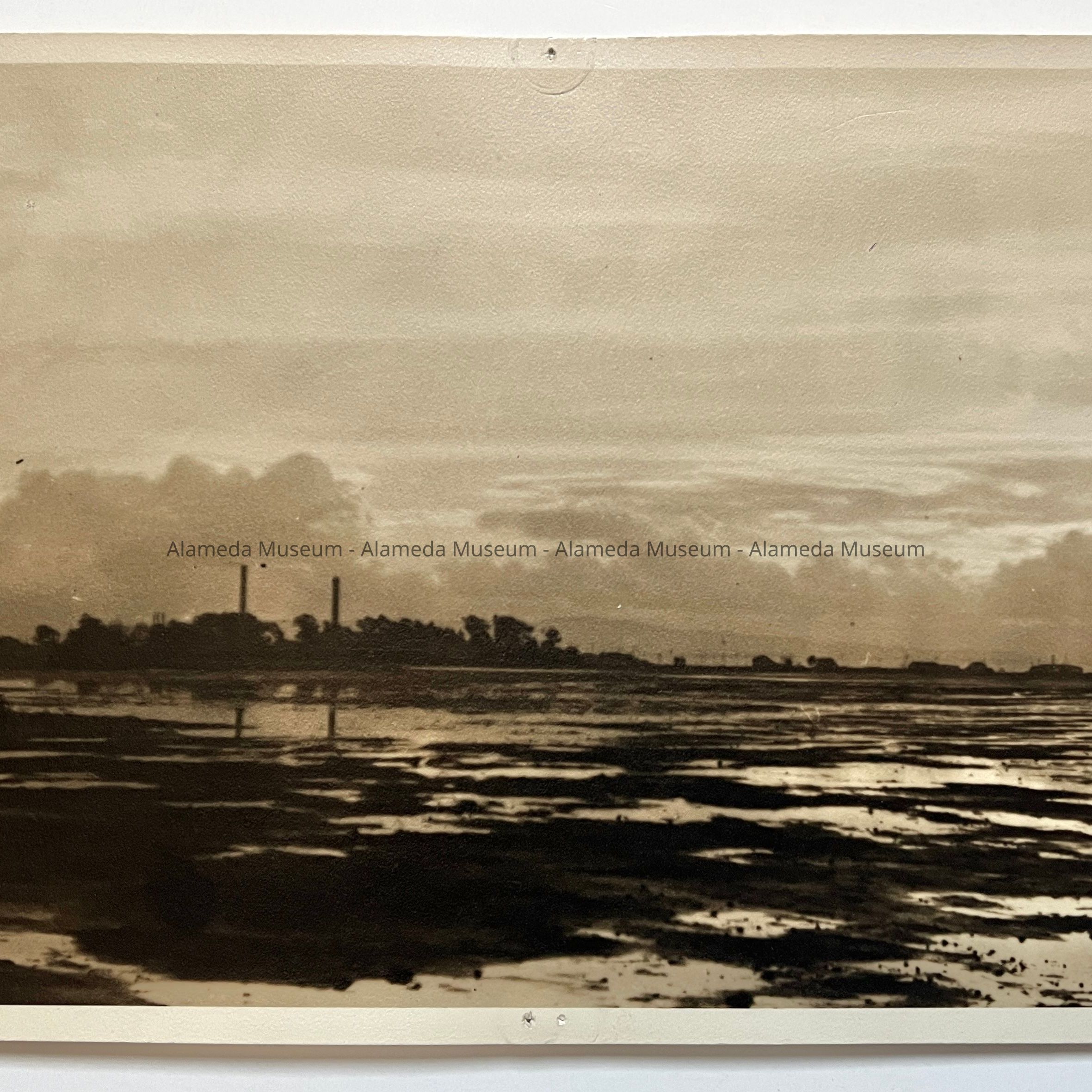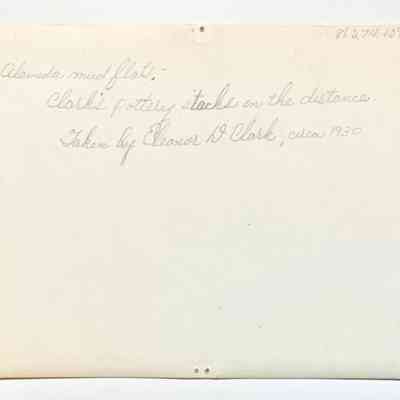 History of Object: This photograph was taken by Eleanor D. Clark, Circa 1930, one rainy afternoon, crossing what we called the "Estuary" (Webster Street, between the now Posey Tube & Atlantic Avenue) looking West across the flats toward the Clark's Pottery Works. Over the land on which the College of Alameda and its campus now stands. This land would flood in rainy weather and often became a sea of beauty with the reflections of a setting sun. (Above quoted from Ms. Clark).
