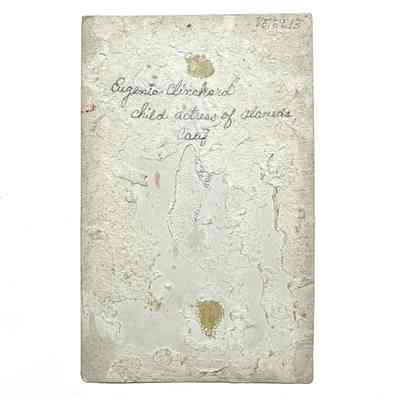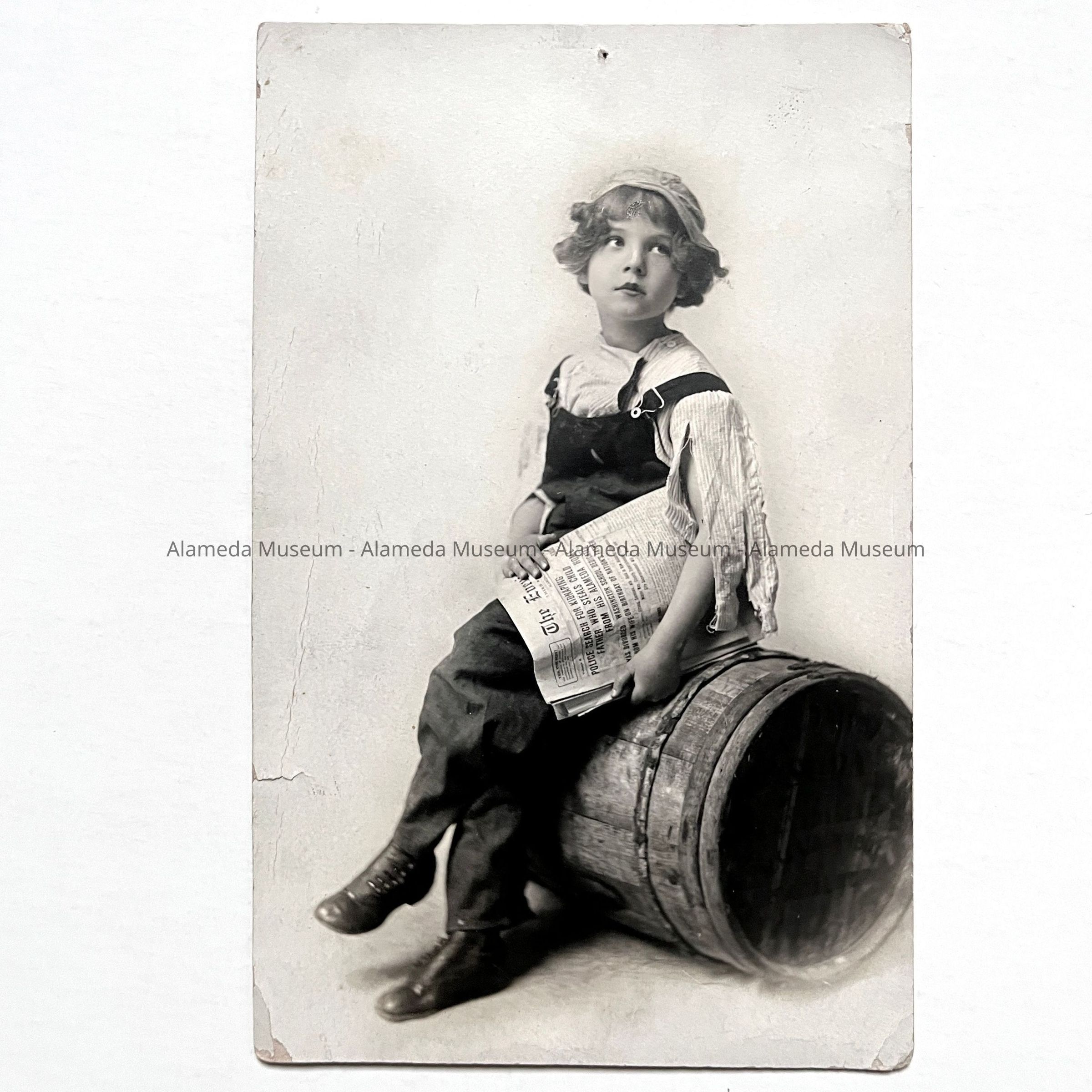 Photo of Eugenia Clinchard, child actress of Alameda, Calif., circa 1911-12. Portraying the "Ragged News Boy." Miss. Clinchard is posed holding an edition of the Evening Times Star, local Alameda newspaper.