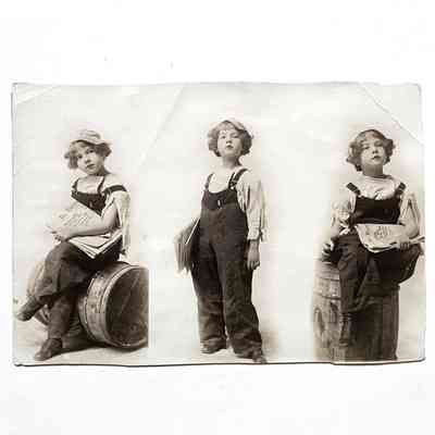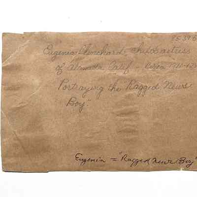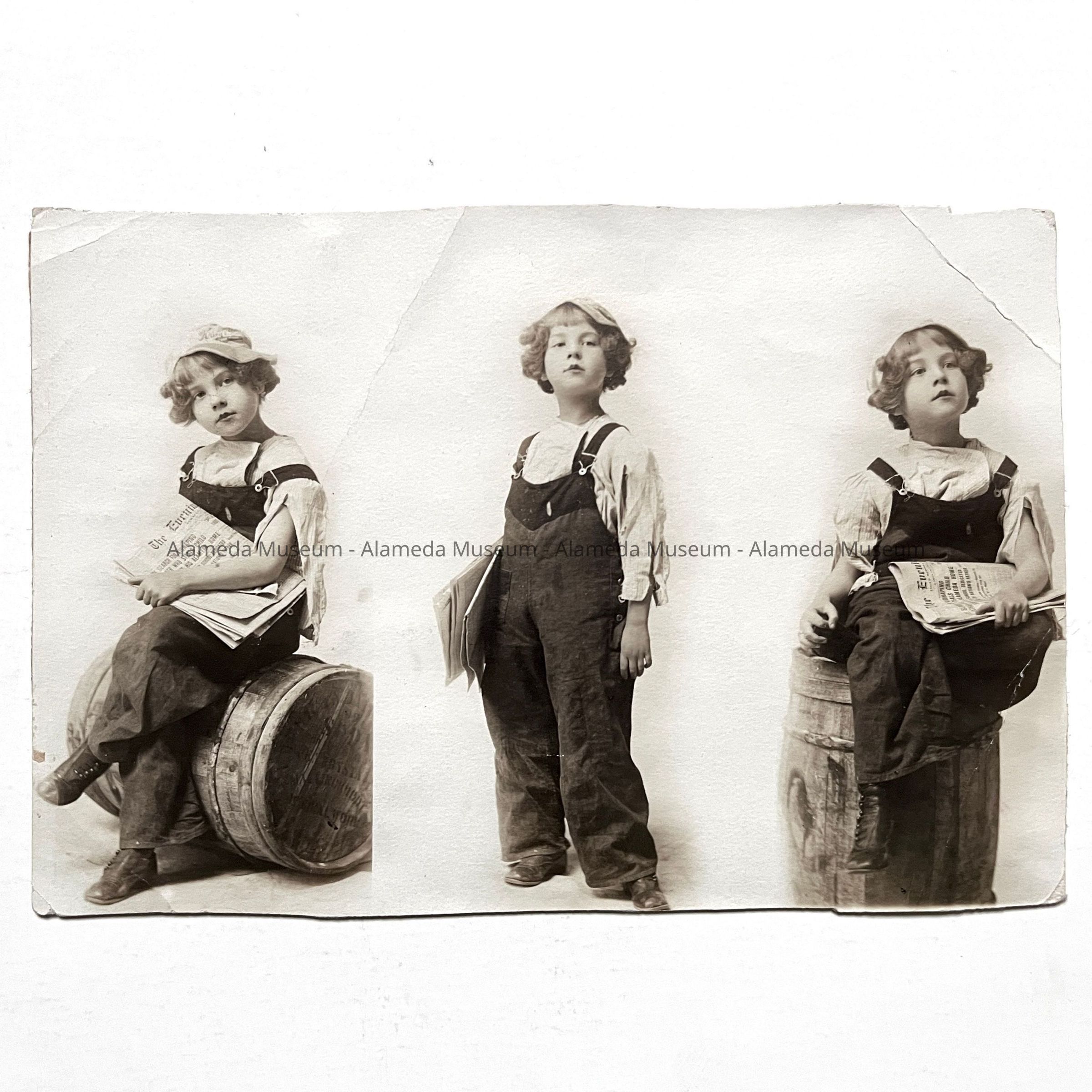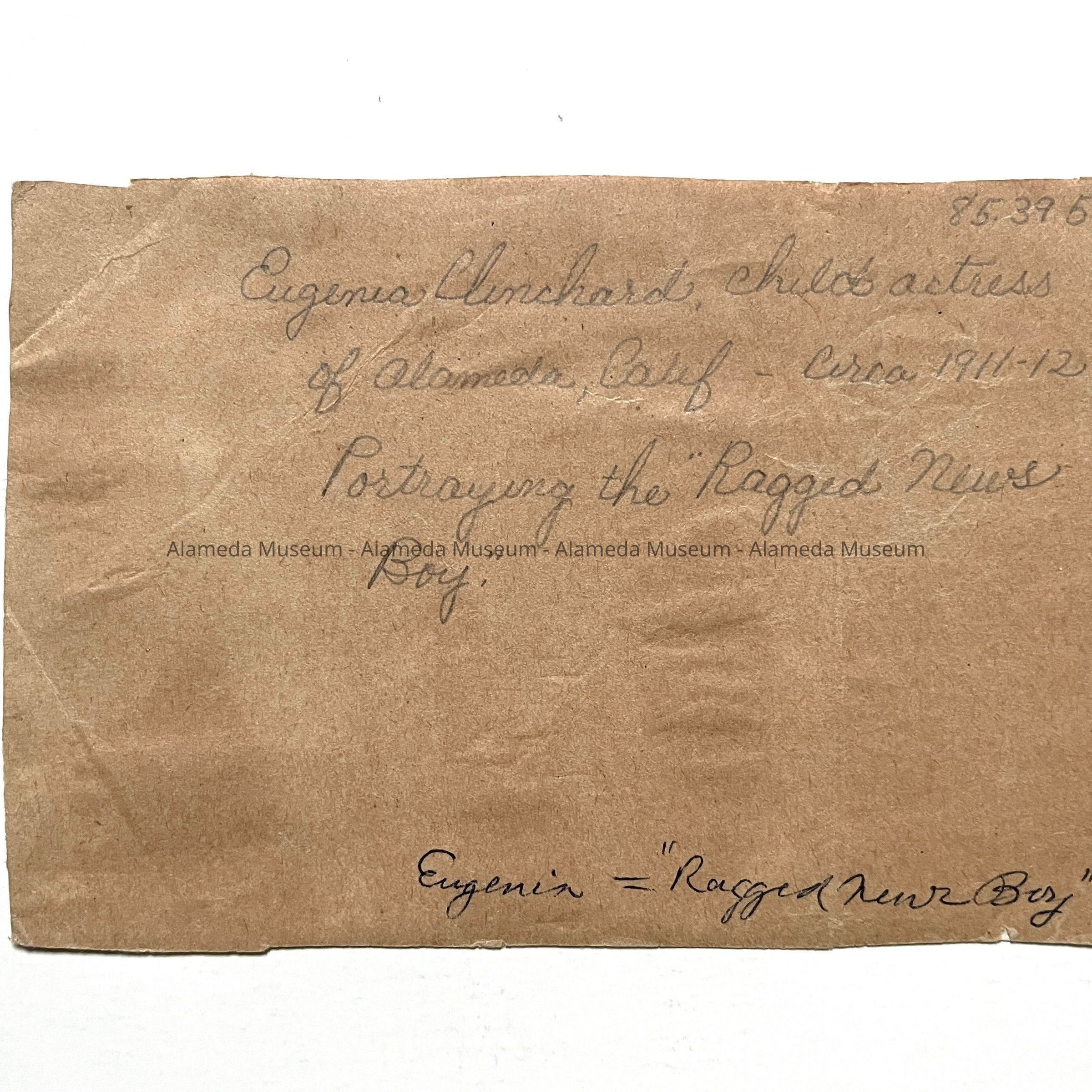 History of Object: Photo of Eugenia Clinchard, child actress of Alameda, Calif., circa 1911-12. Portraying the "Ragged News Boy." Miss. Clinchard is posed holding an edition of the Evening Times Star, local Alameda newspaper.