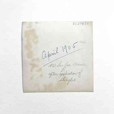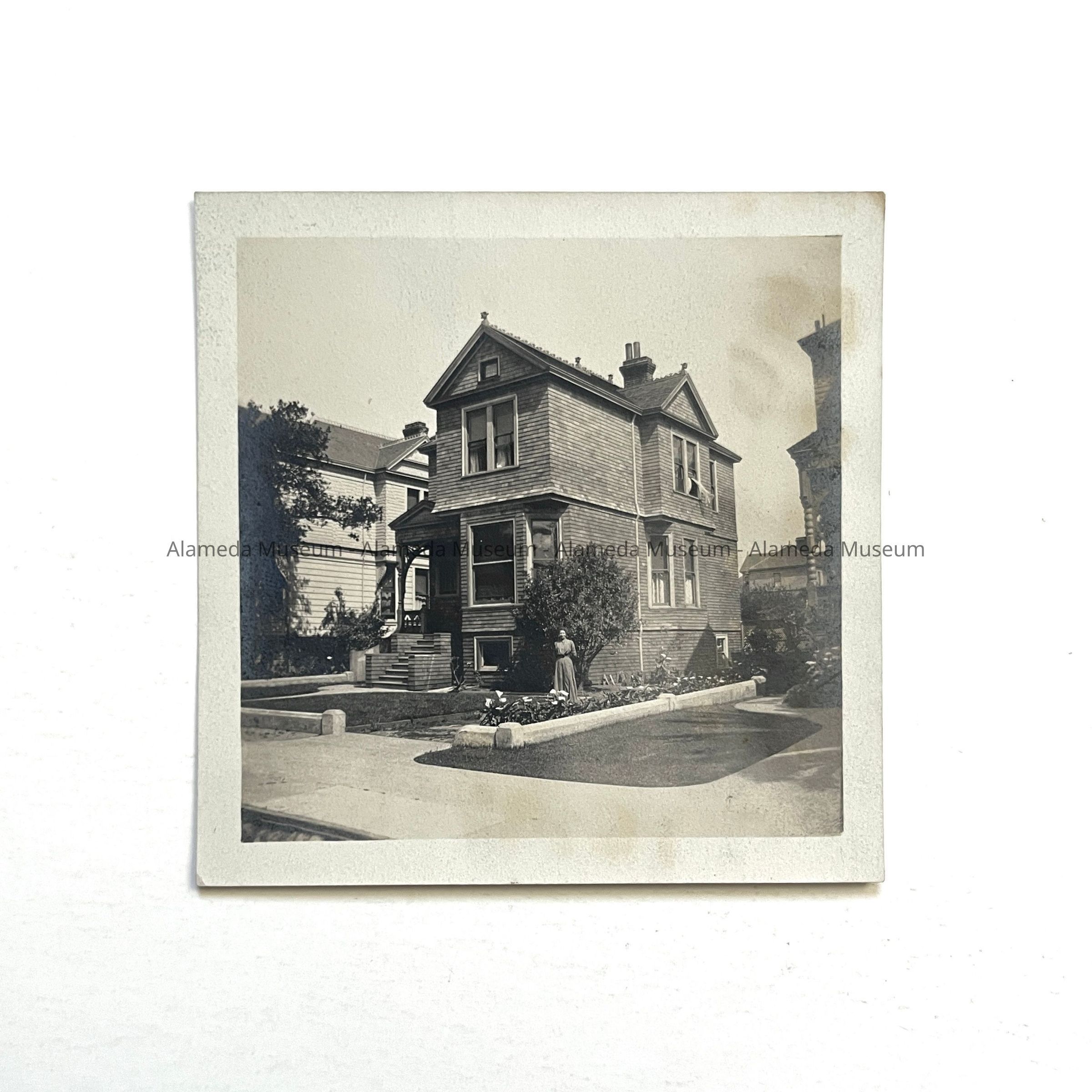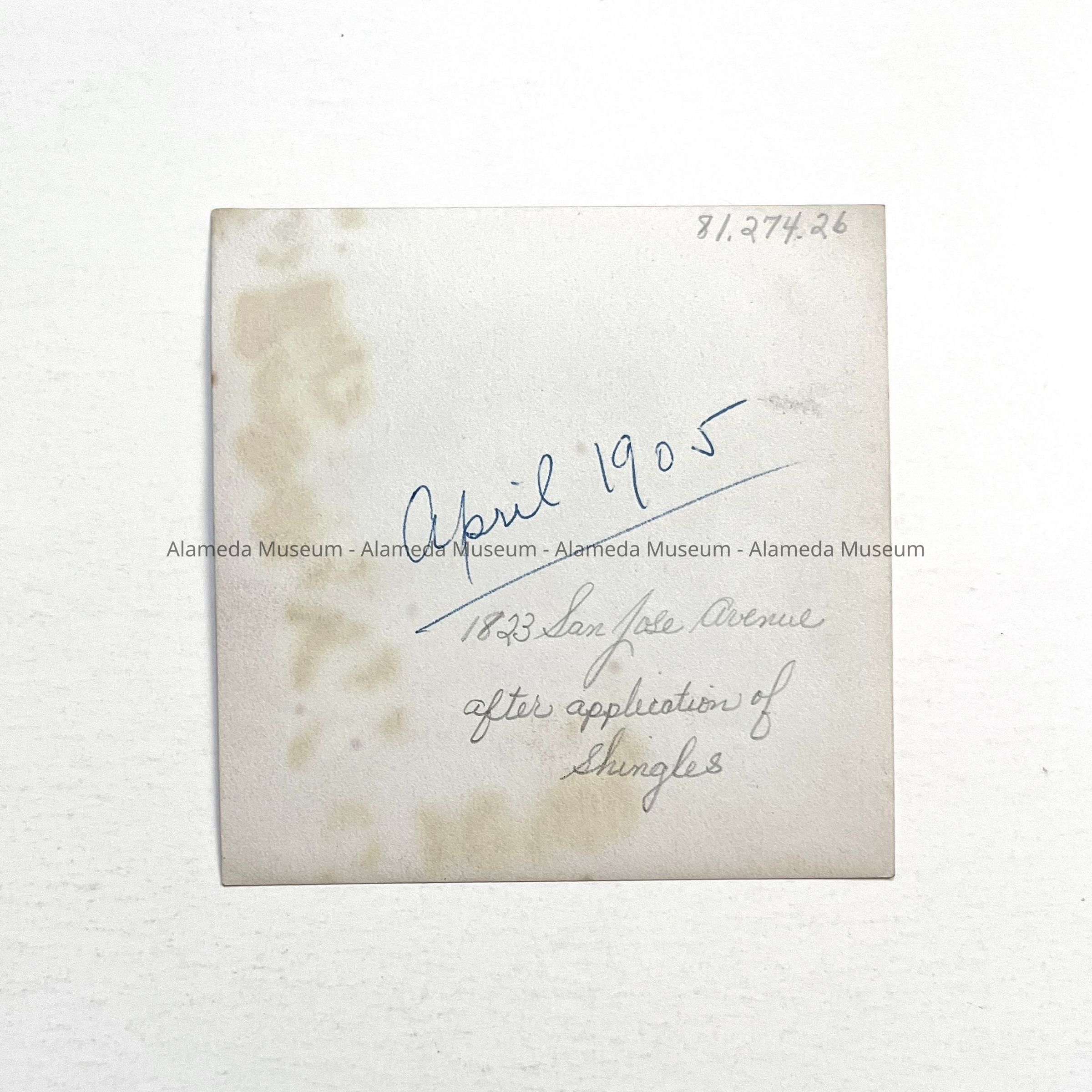 History of Object: Photograph taken April, 1905 of the exterior of 1823 San Jose Avenue, Alameda. It depicts a Victorian style residence after the exterior was altered by removing ornamental trim and covering siding with shingles. This was done by Herbert Clark to update the house he had purchased in 1904.