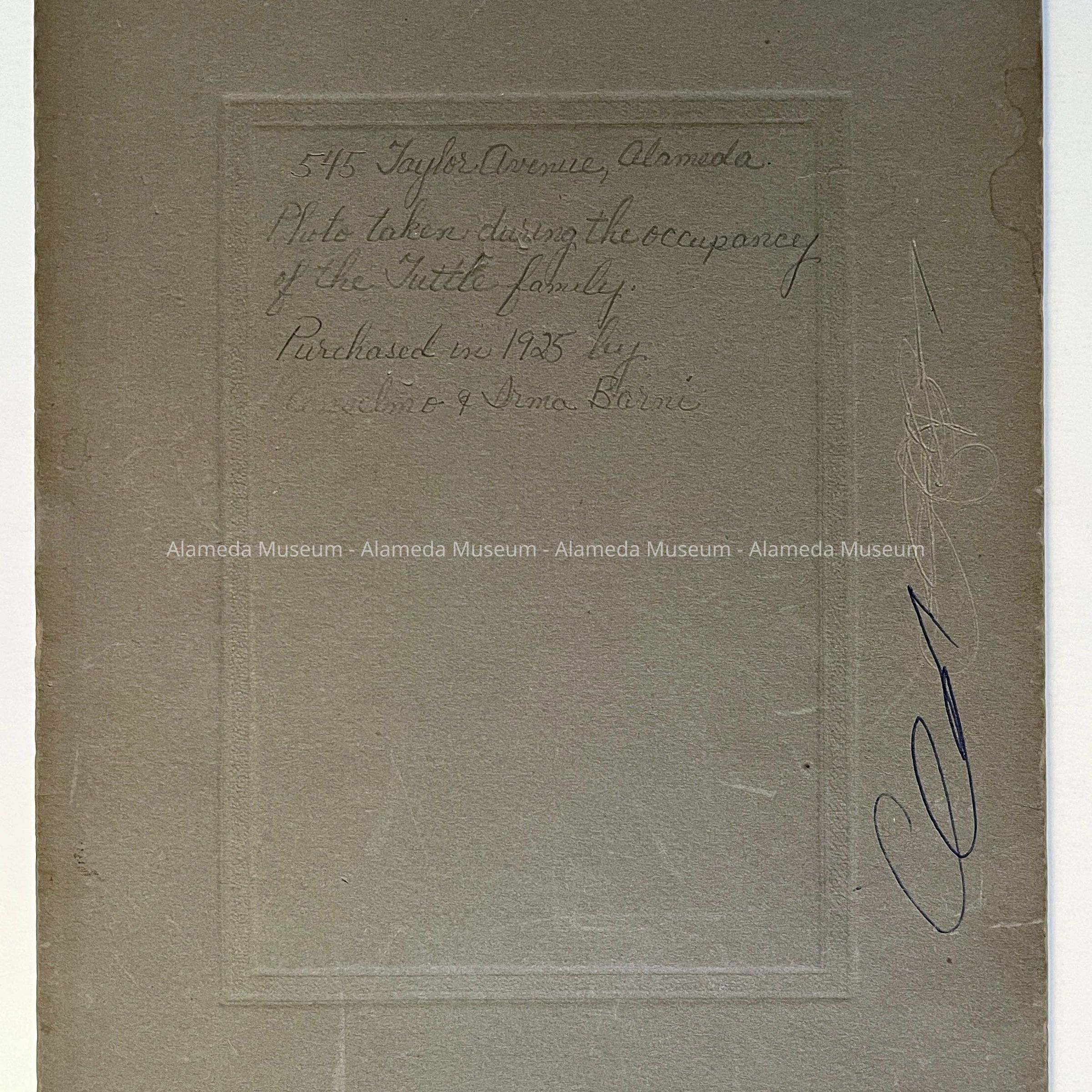 History of Object: Exterior photo of 545 Taylor Avenue, Alameda, taken during the occupancy of the Tuttle family. It was sold in 1925 by Melissa E. Tuttle to Anselmo & Irma Barni (the parents of the donors). The builders were Marcuse & Remmel.
