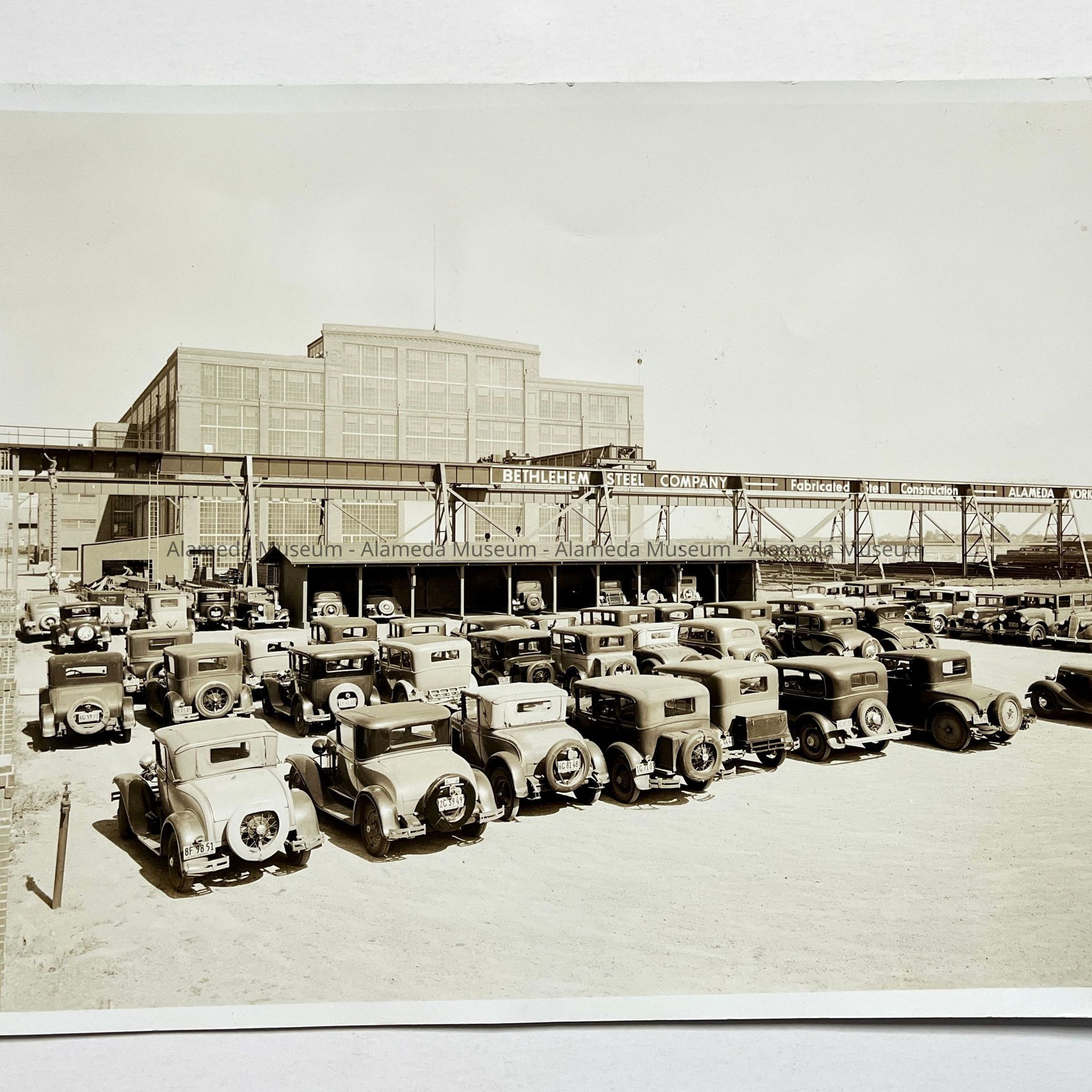 History of Object: An exterior view of the Bethlehem Steel Co. Alameda Works showing the employees' parking lot adjacent to the plant. An interesting view of the various contemporary automobiles.