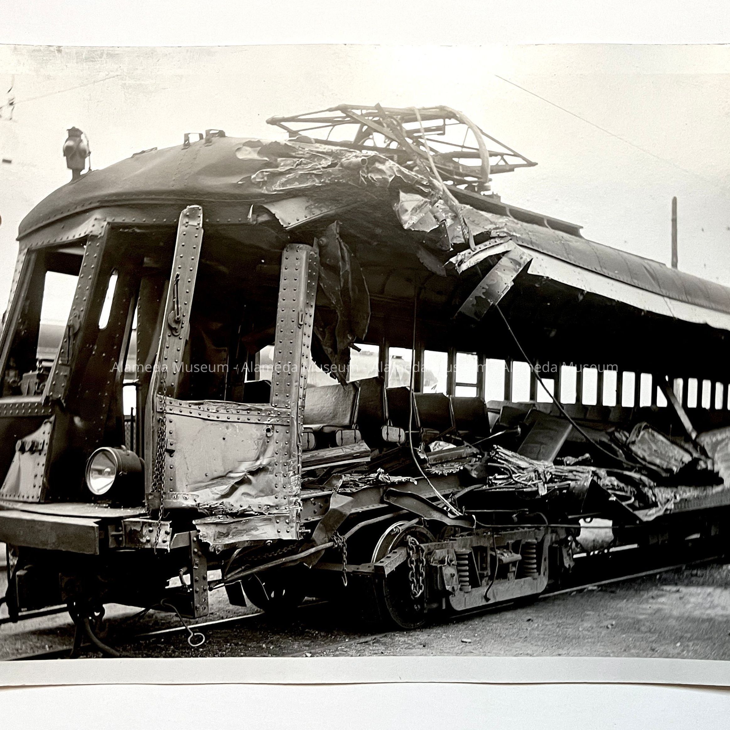 EXTERIOR VIEW OF SOUTHERN PACIFIC RAIL CAR #336, SHOWING COLLISION DAMAGE, SOUTHERN PACIFIC RAILROAD COMPANY, WEST END, ALAMEDA, CALIFORNIA; 1922