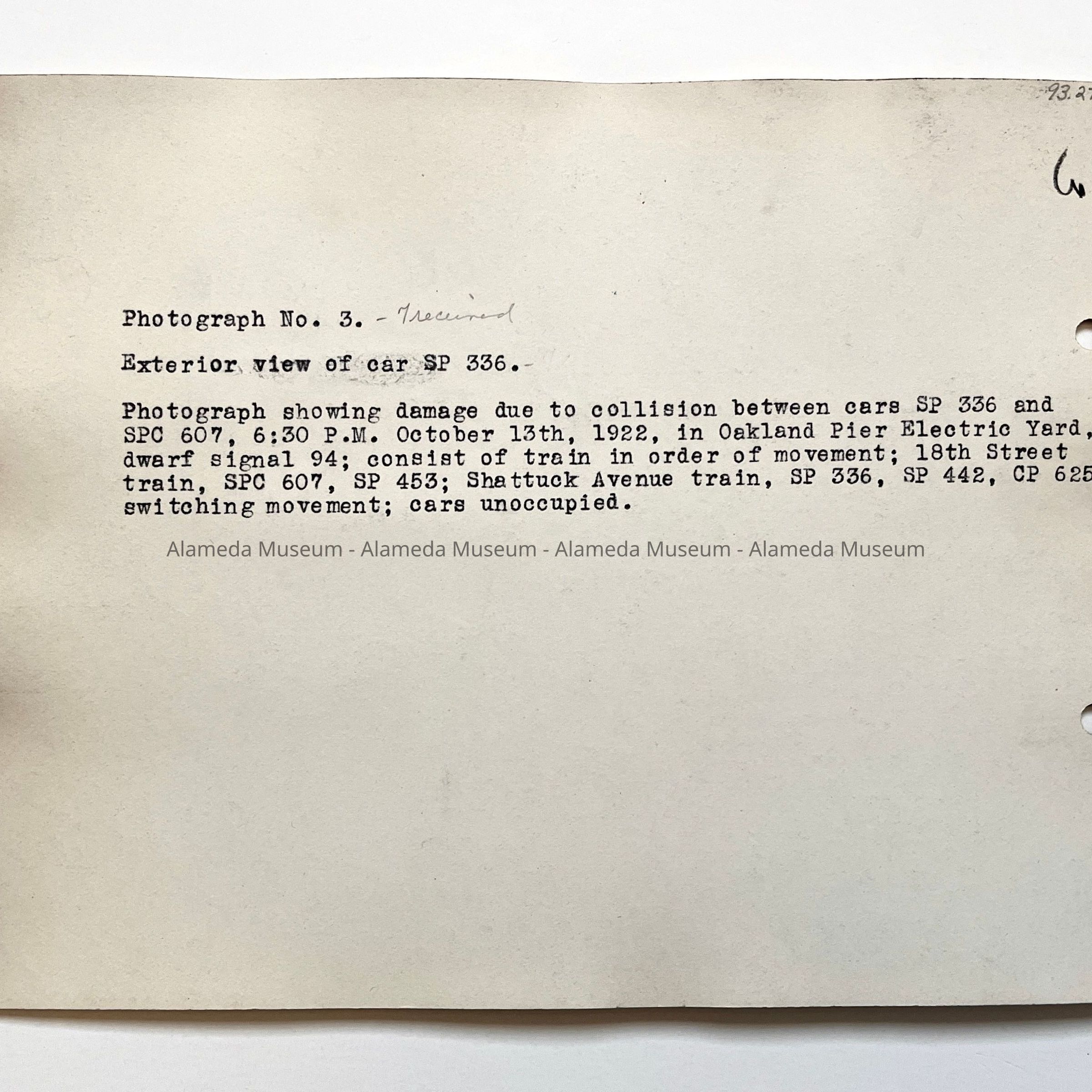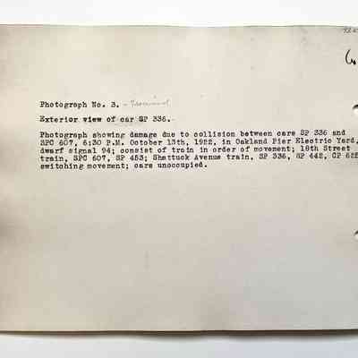 Photo Exterior Collision Damage Southern Pacific Rail car #336, 1922Entry/Object ID