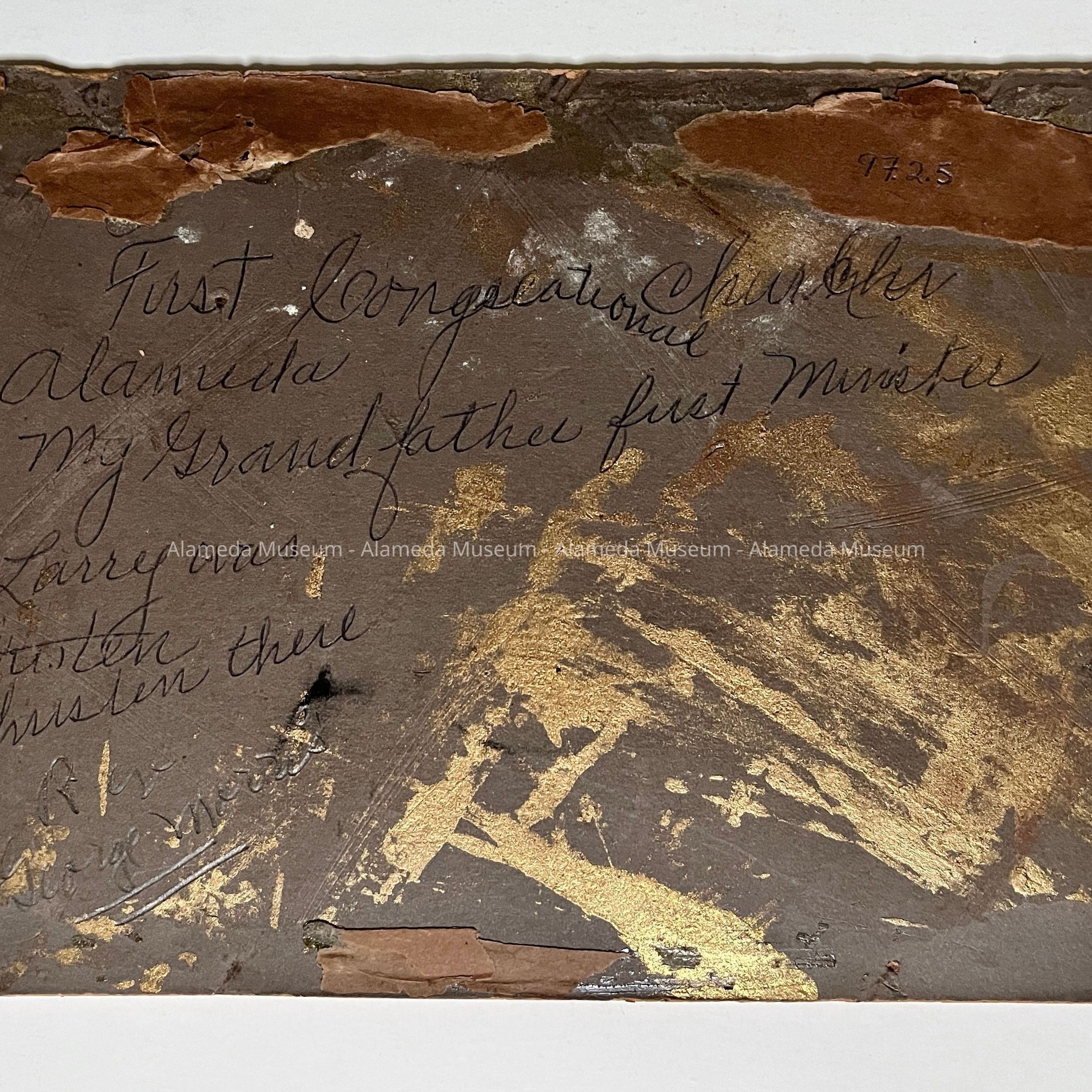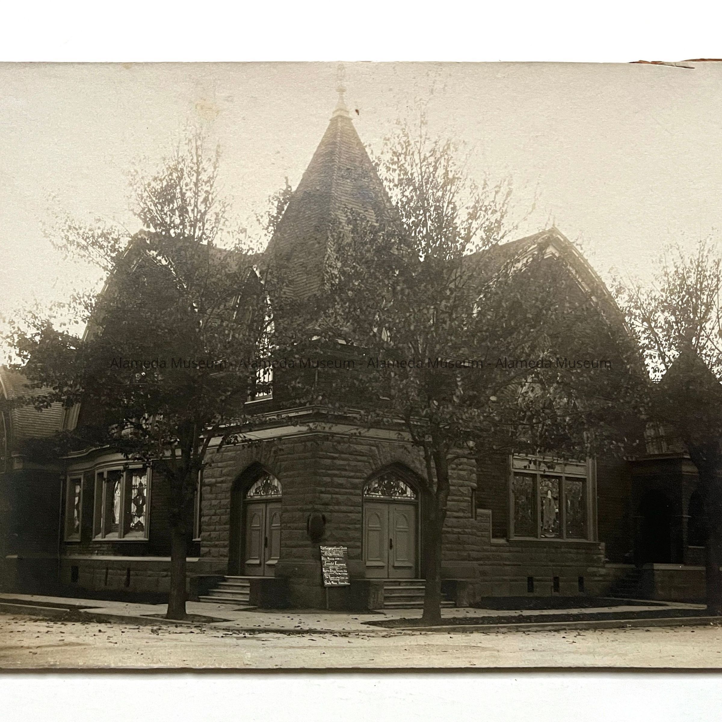 EXTERIOR PHOTOGRAPH OF THE CONGREGATIONAL CHURCH, LOCATED ON THE CORNER OF CENTRAL AVENUE AND CHESTNUT STREET, ALAMEDA DURING THE PERIOD WHEN REVEREND GEORGE MORRIS WAS MINISTER. HE WAS THE FATHER OF GEORGE T MORRIS, LOCAL MERCHANT. THE PHOTOGRAPH WAS TAKEN AFTER CONSTRUCTION OF THE CHURCH IN 1904.