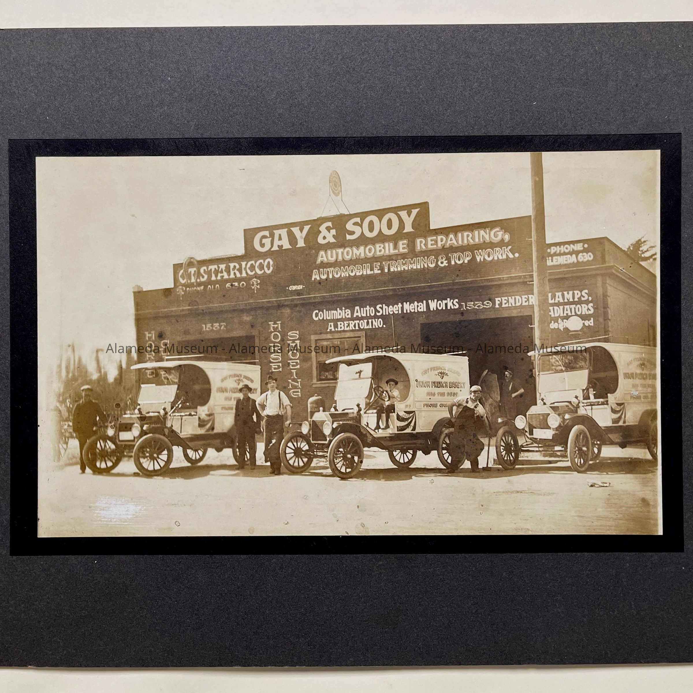 History of Object: Exterior photo of the Gay & Sooy Automobile Repair Shop, 1537 Oak Street, Alameda. Theophile Gay was listed as a blacksmith in the 1912 Husted City Directory, at 1537 Oak Street, residence 2260 Lincoln Avenue.
